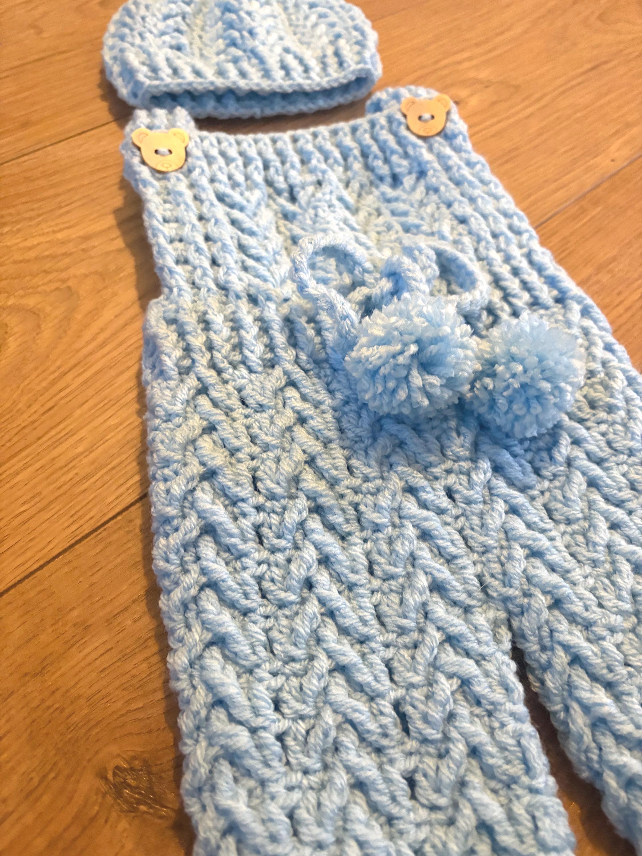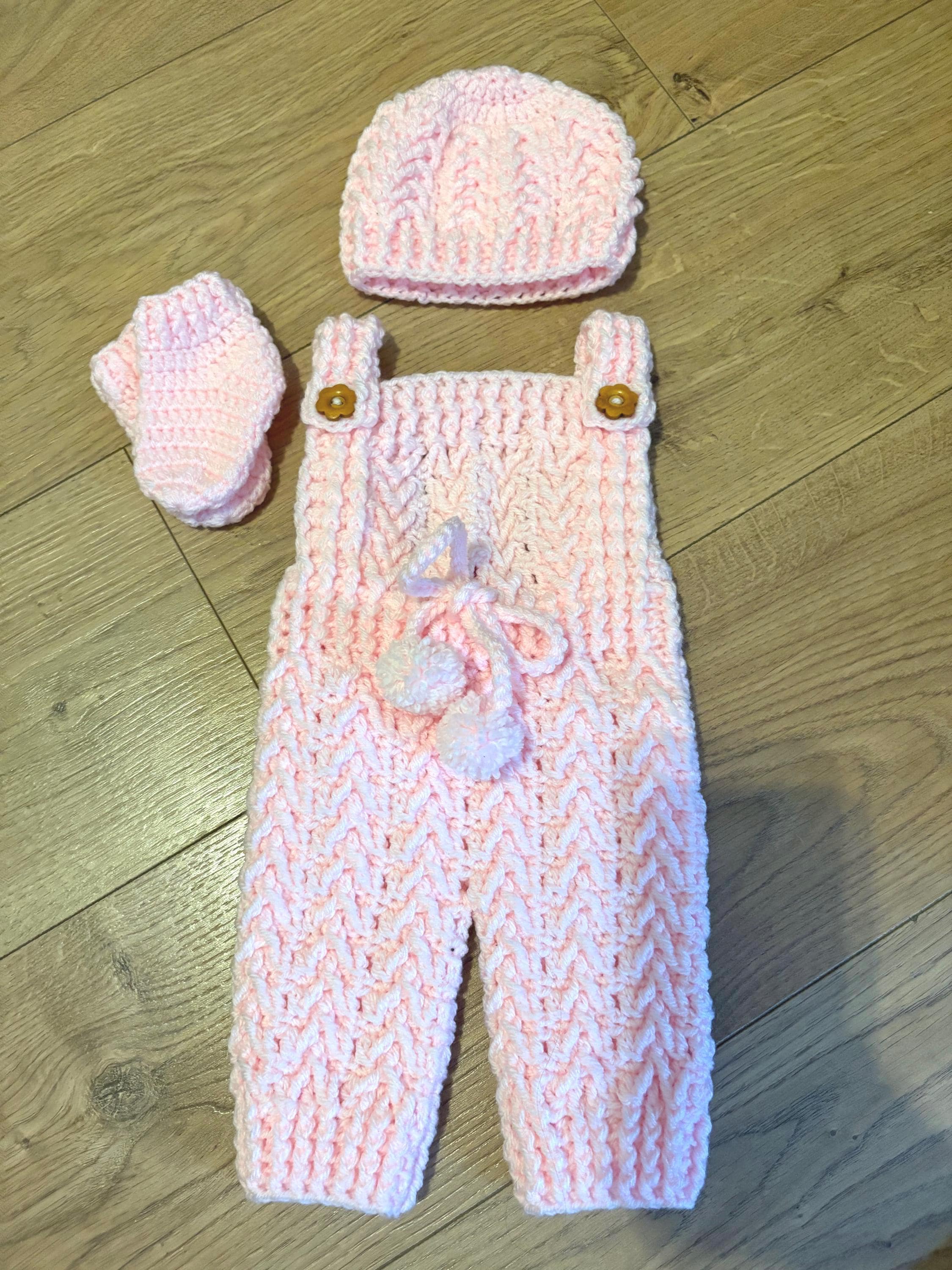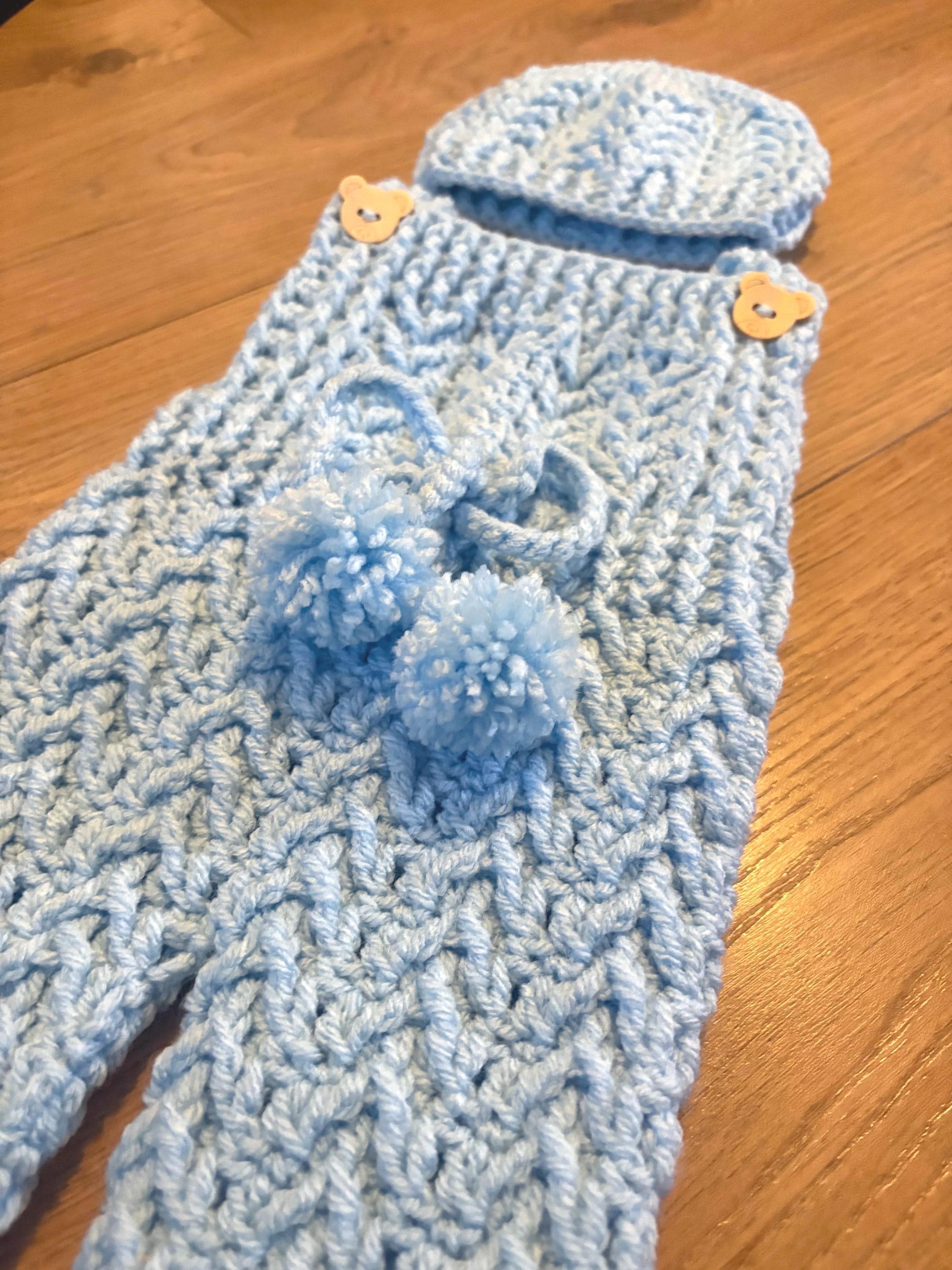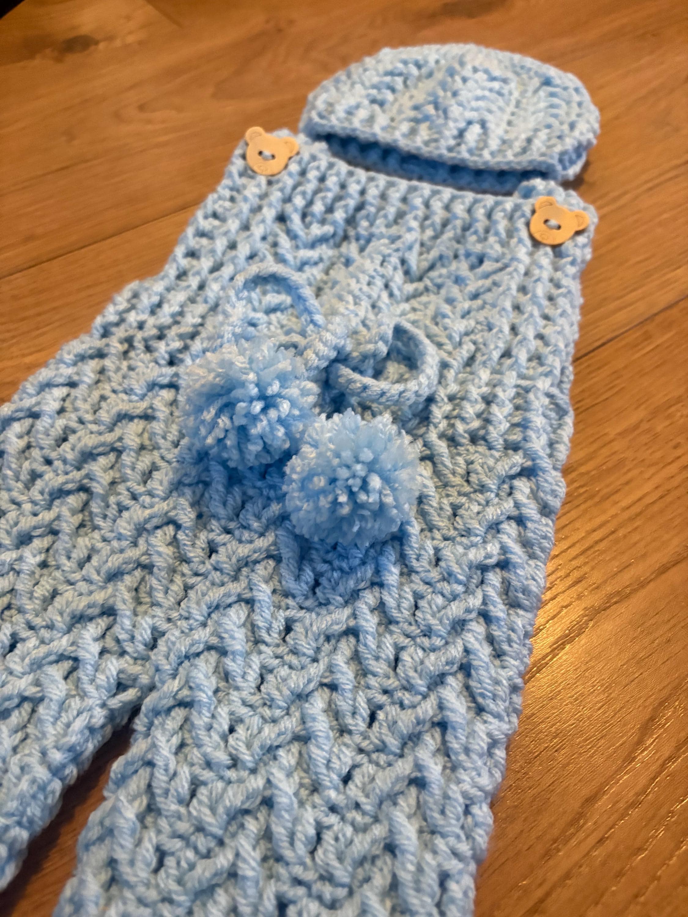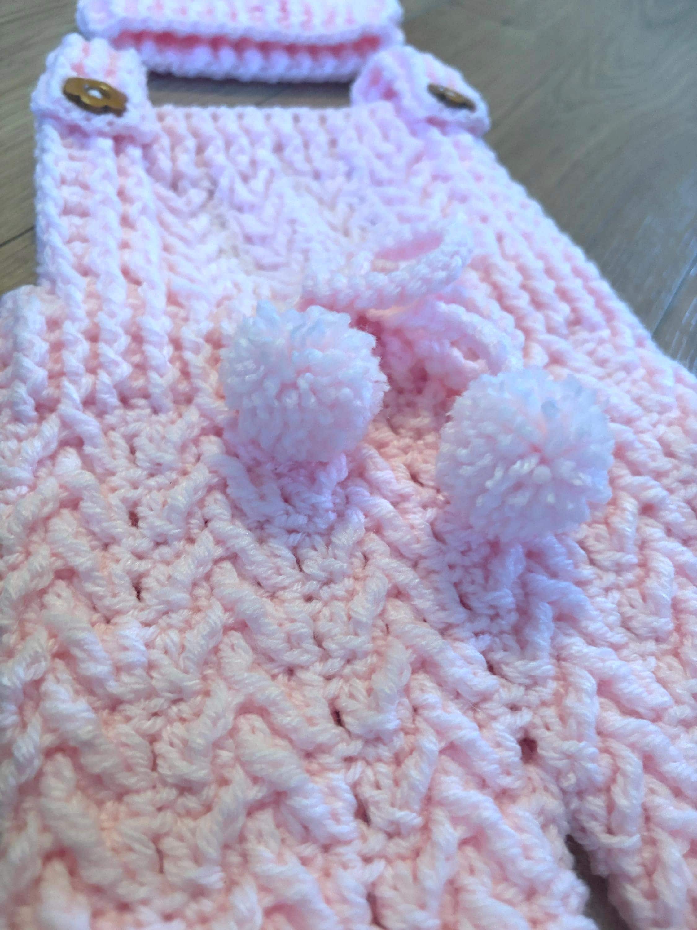 Adorable crochet baby outfit includes overalls, matching cardigan, hat and socks. Available in pink, blue or white. Perfect going home outfit or gift. Made with premium acrylic yarn which is machine washable at 40 degrees and can be tumble dried on a low heat.