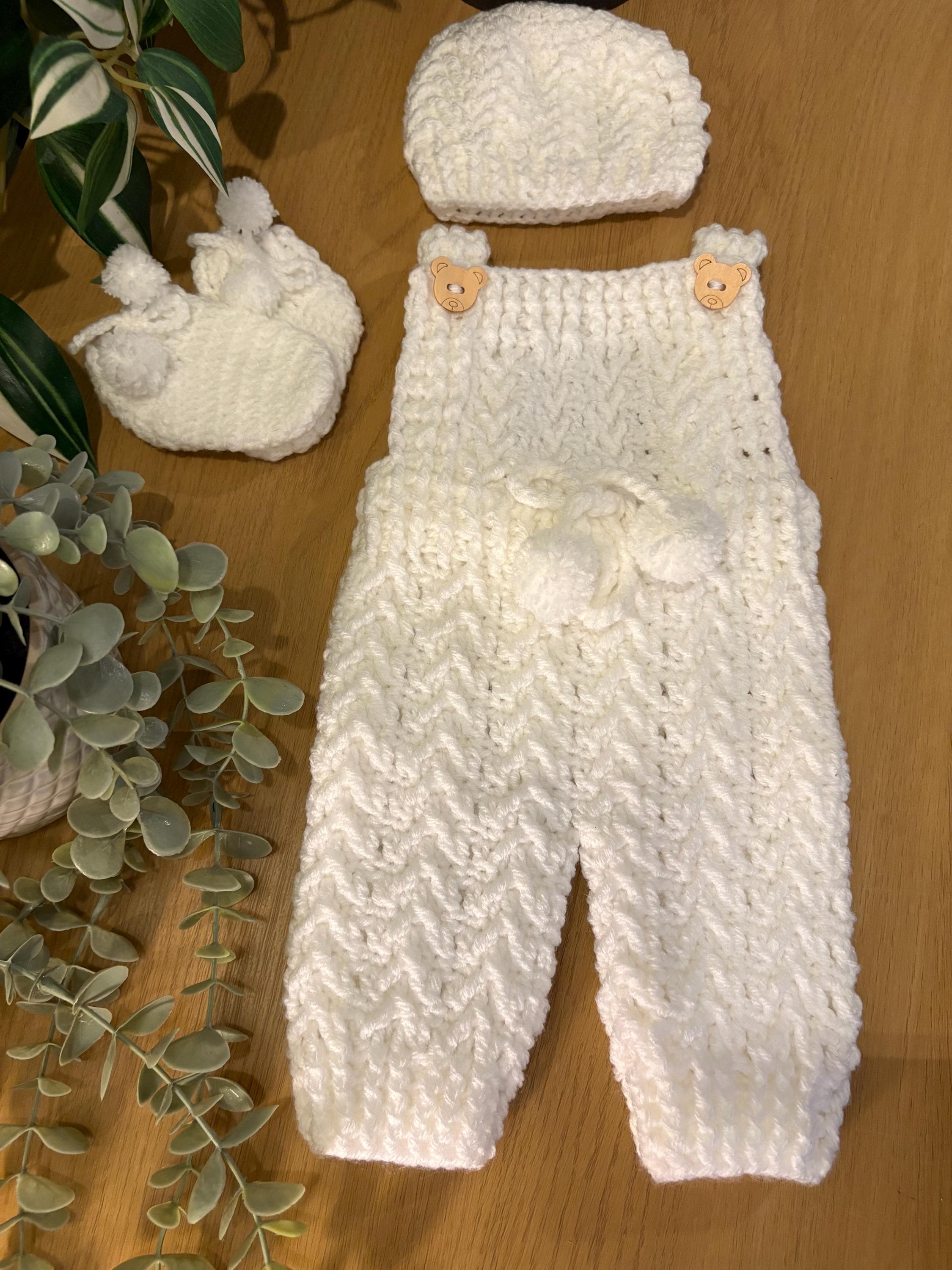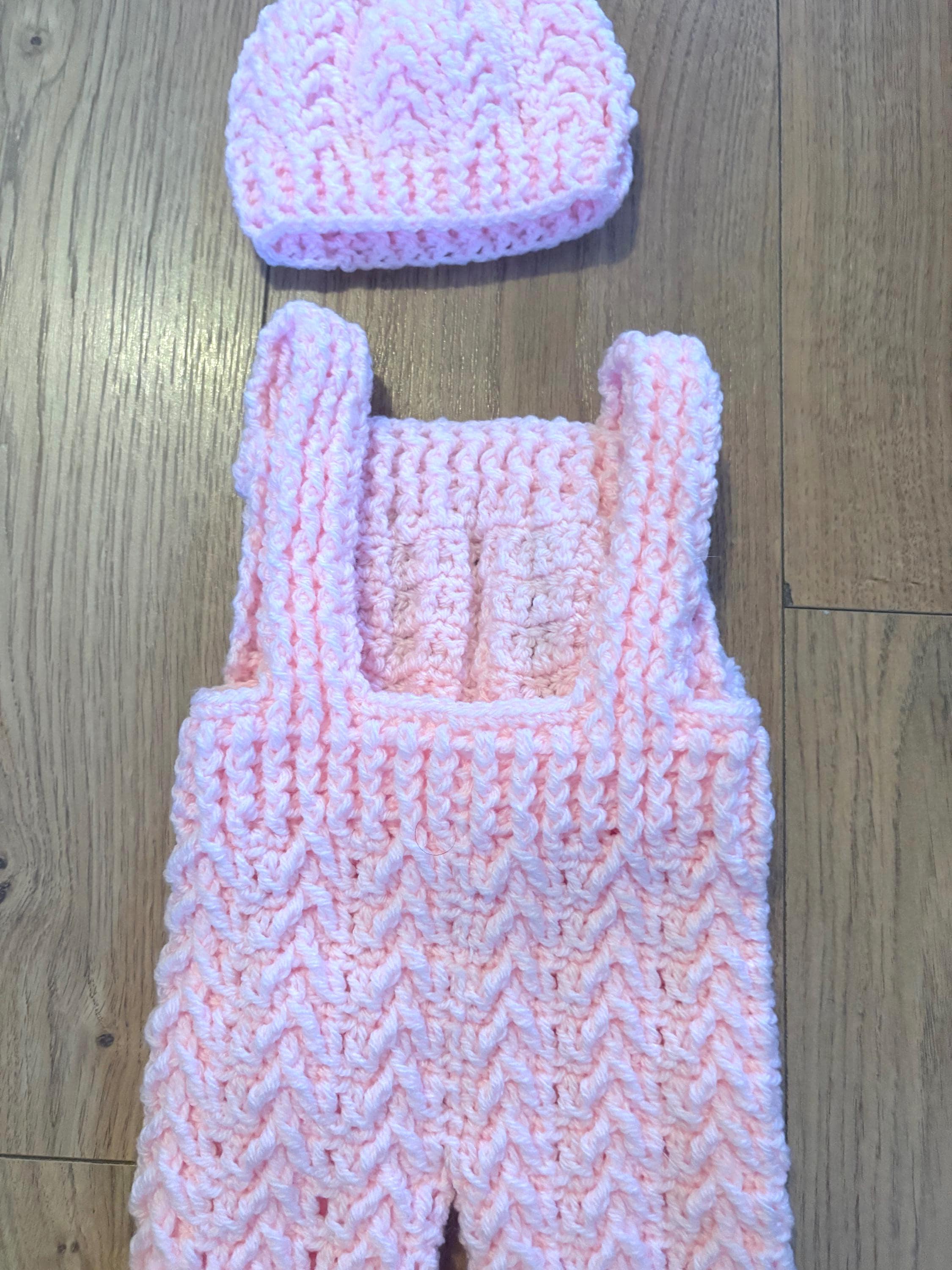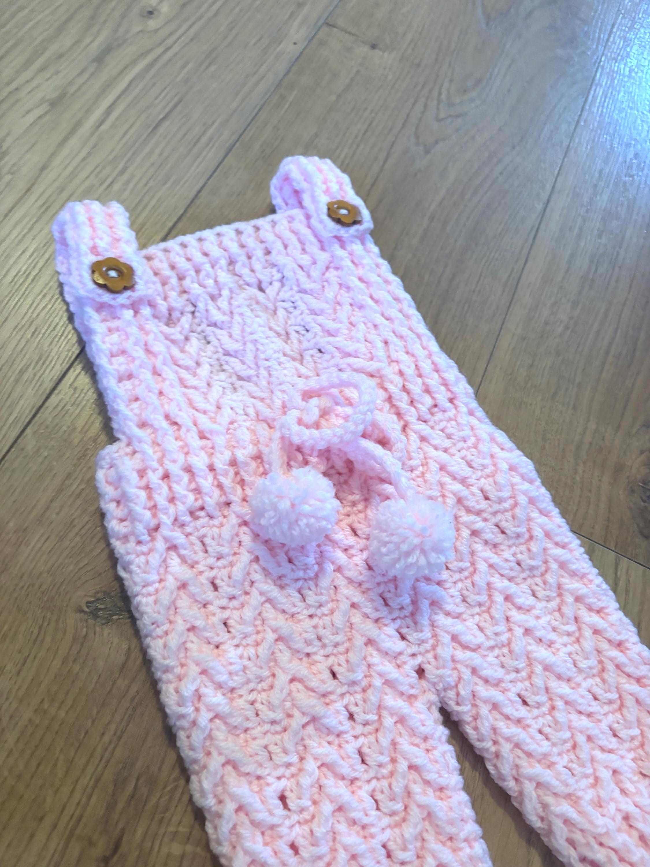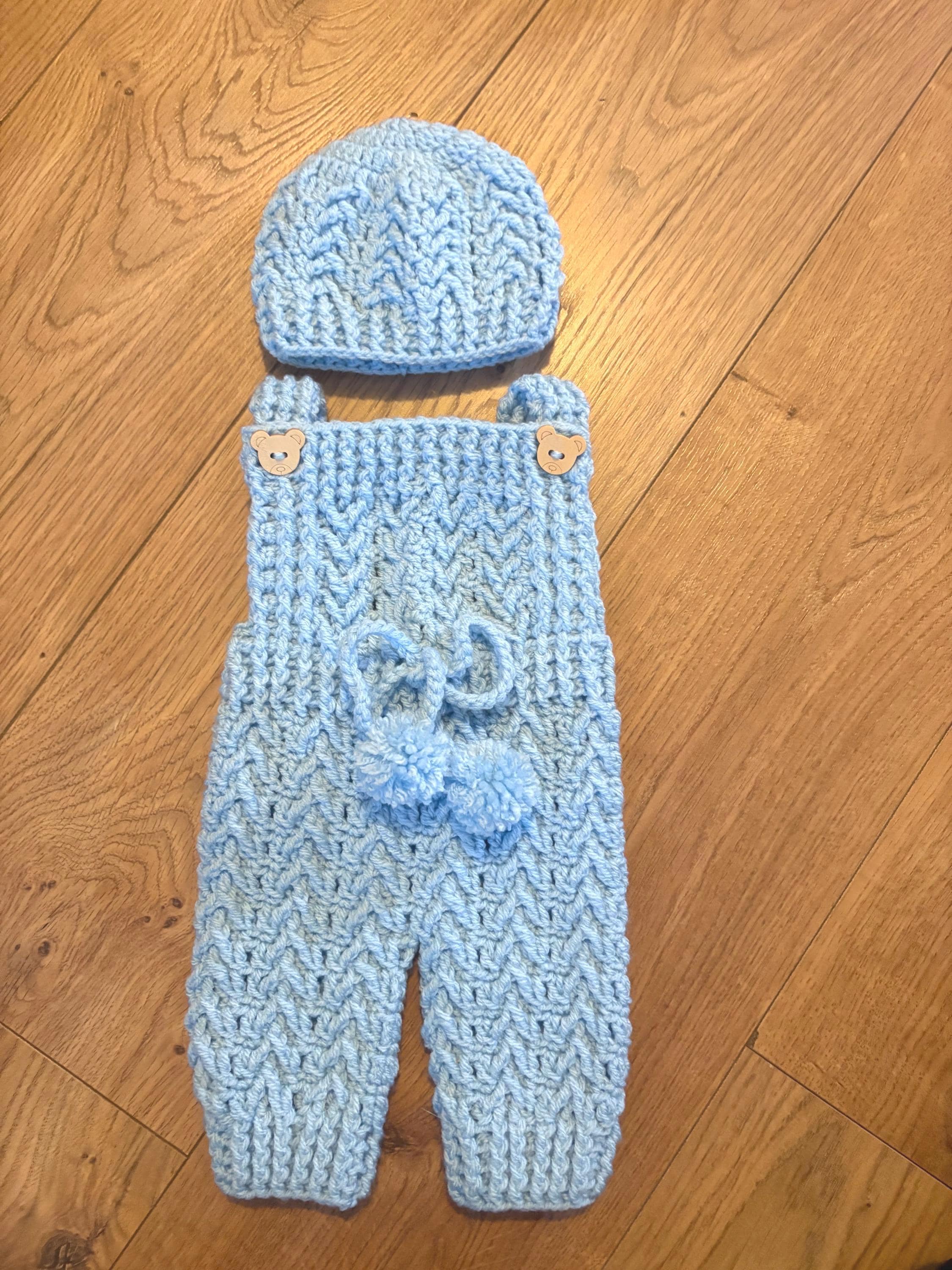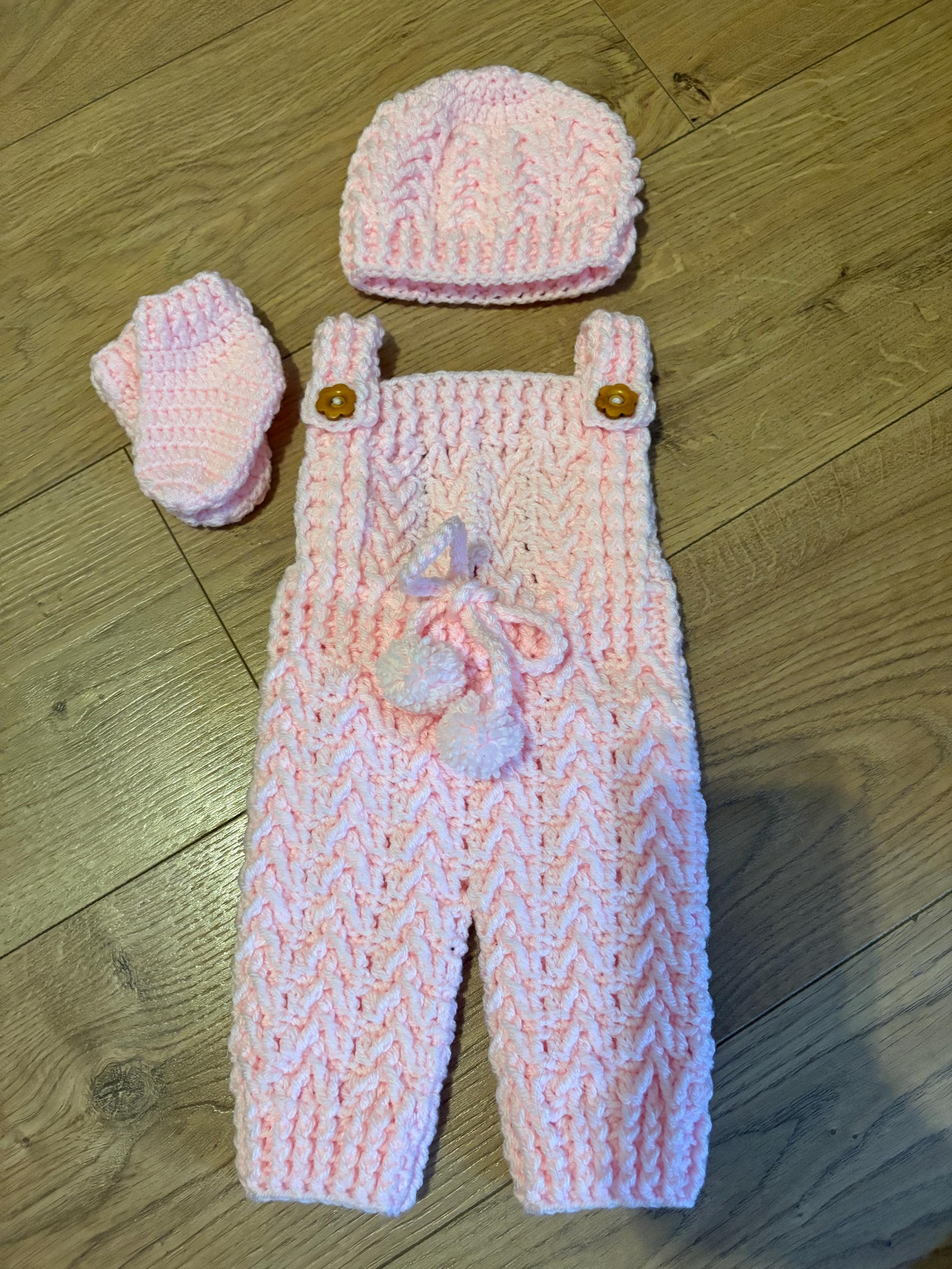 Adorable crochet baby outfit includes overalls, matching cardigan, hat and socks. Available in pink, blue or white. Perfect going home outfit or gift. Made with premium acrylic yarn which is machine washable at 40 degrees and can be tumble dried on a low heat.