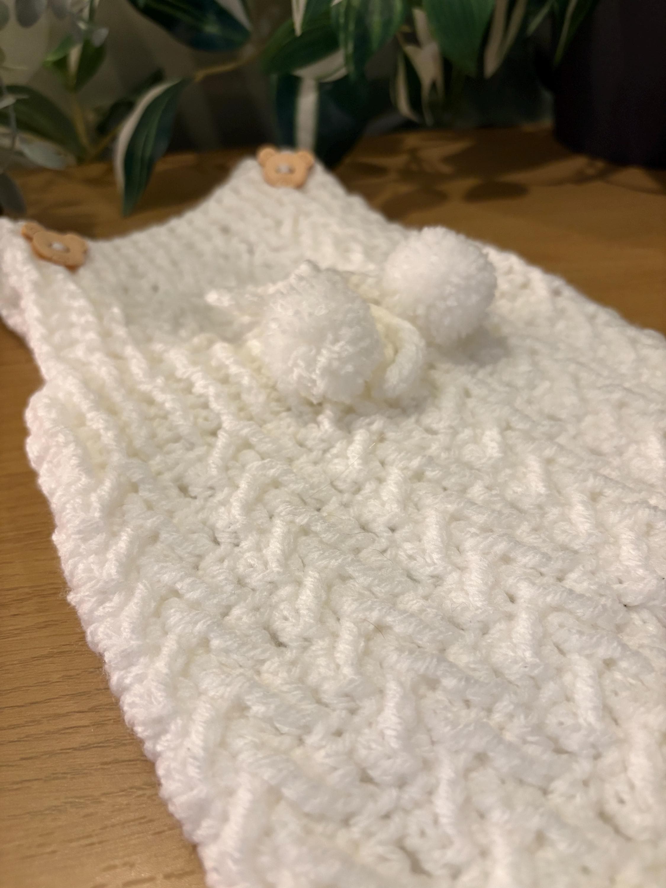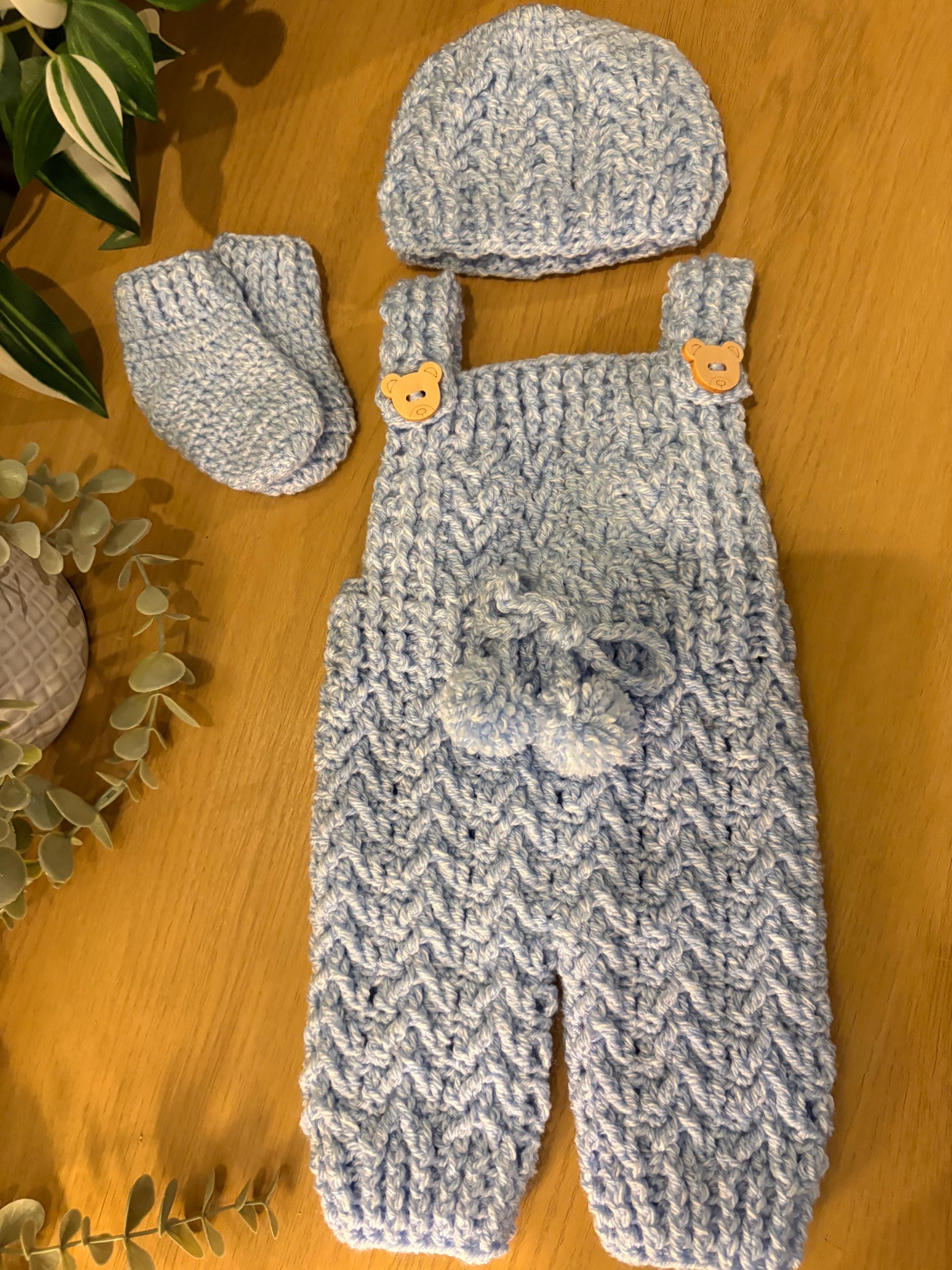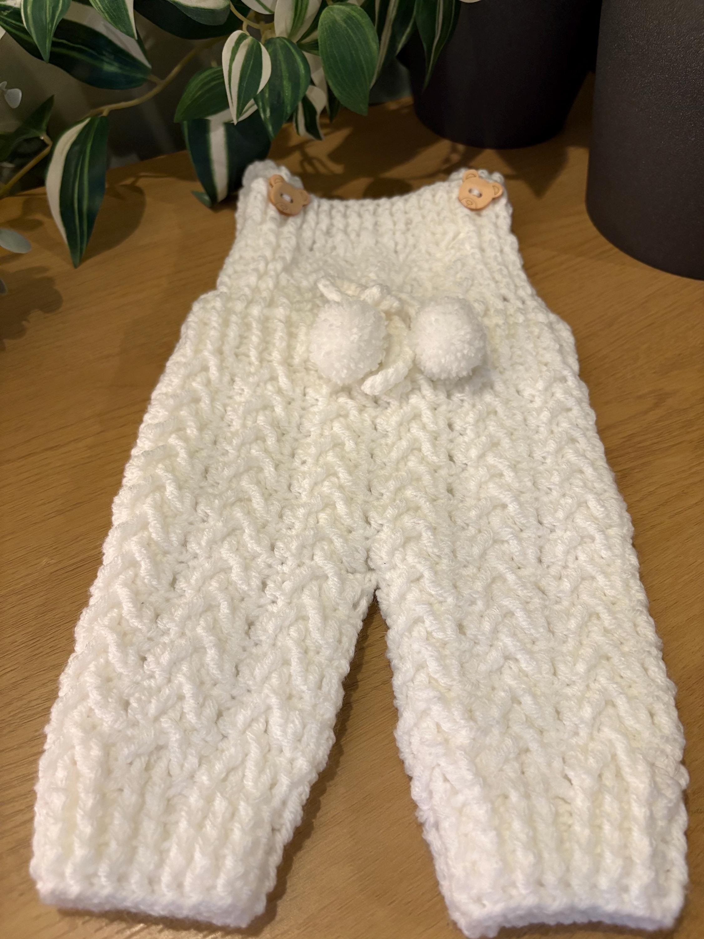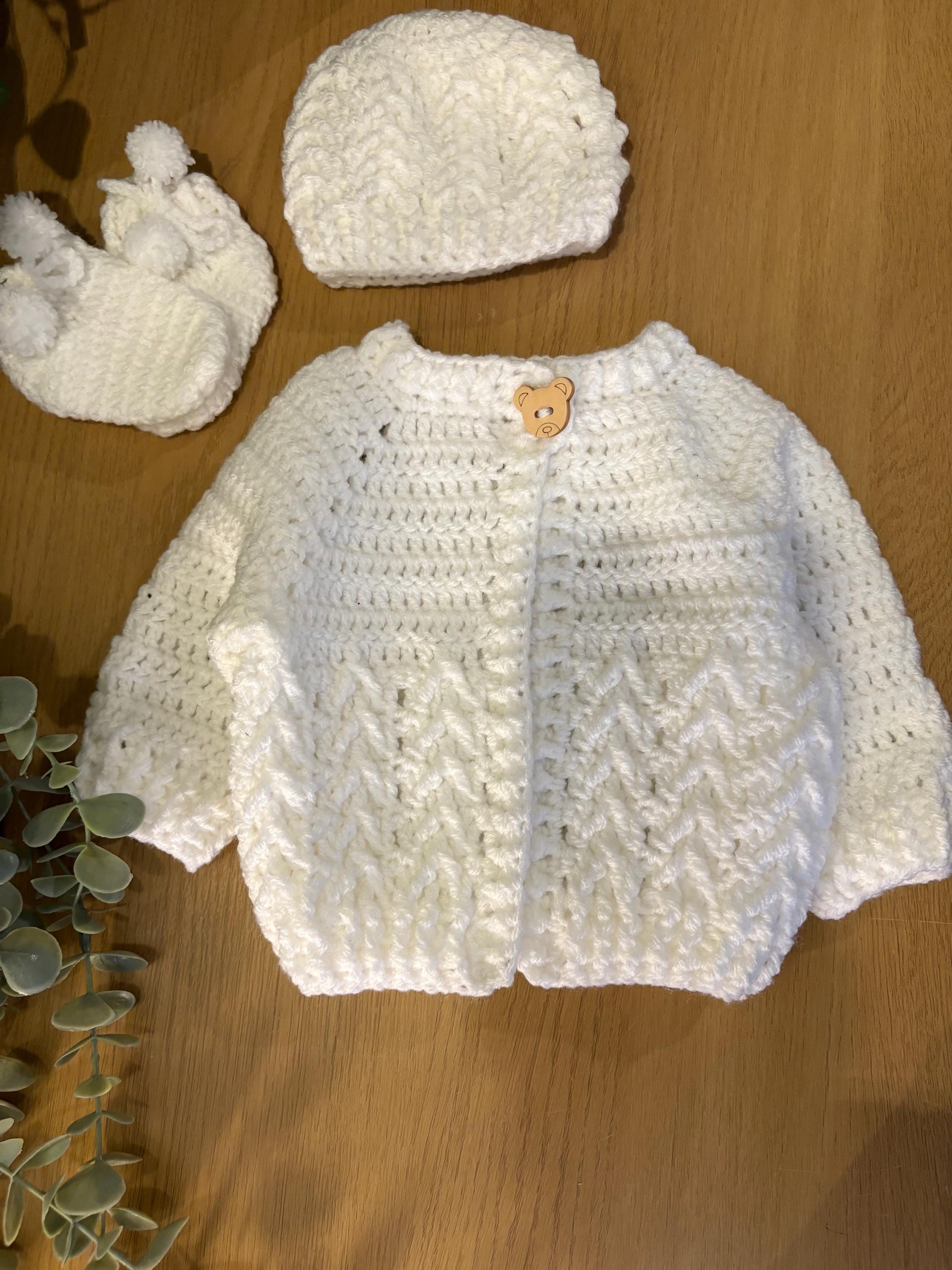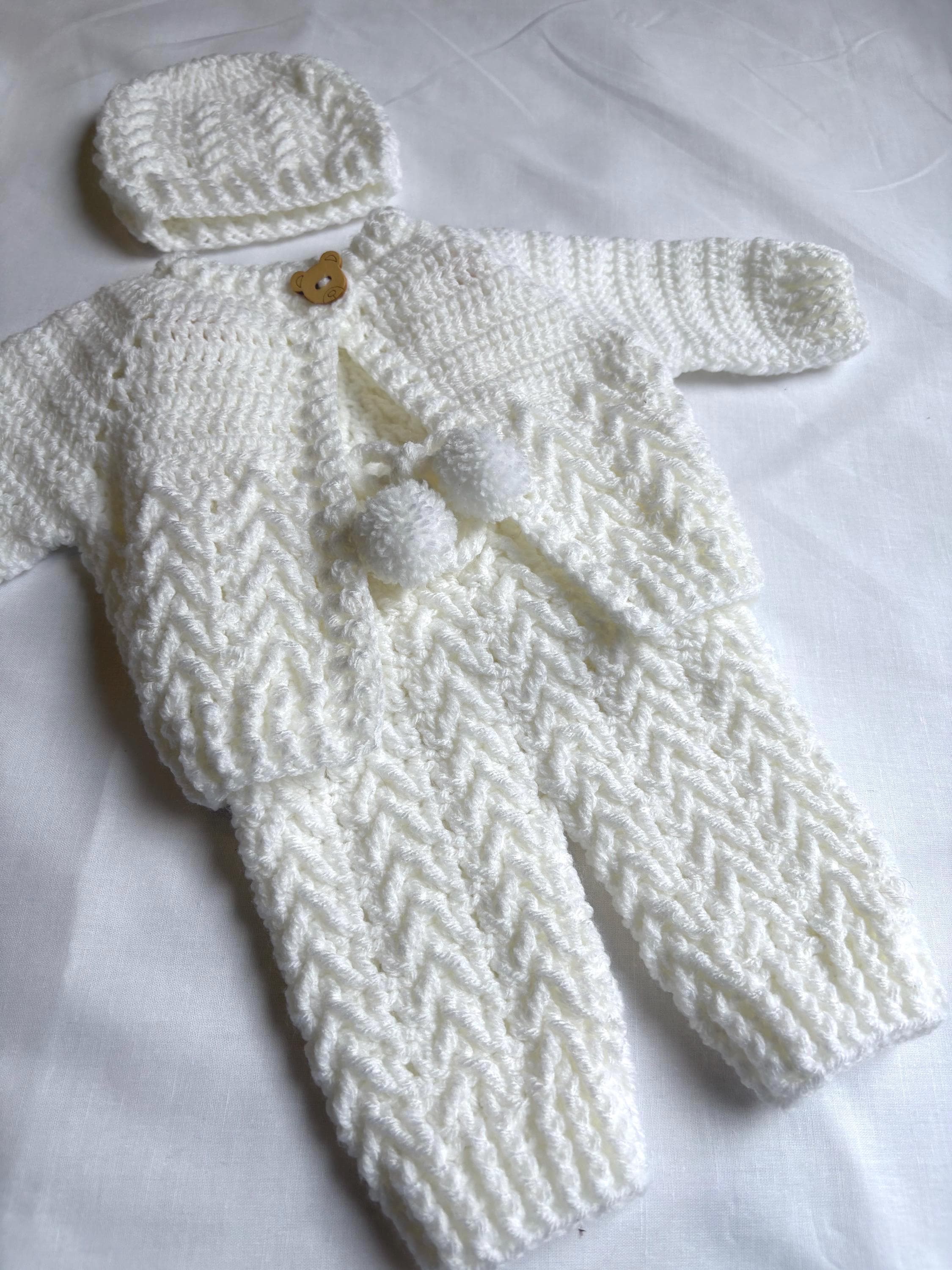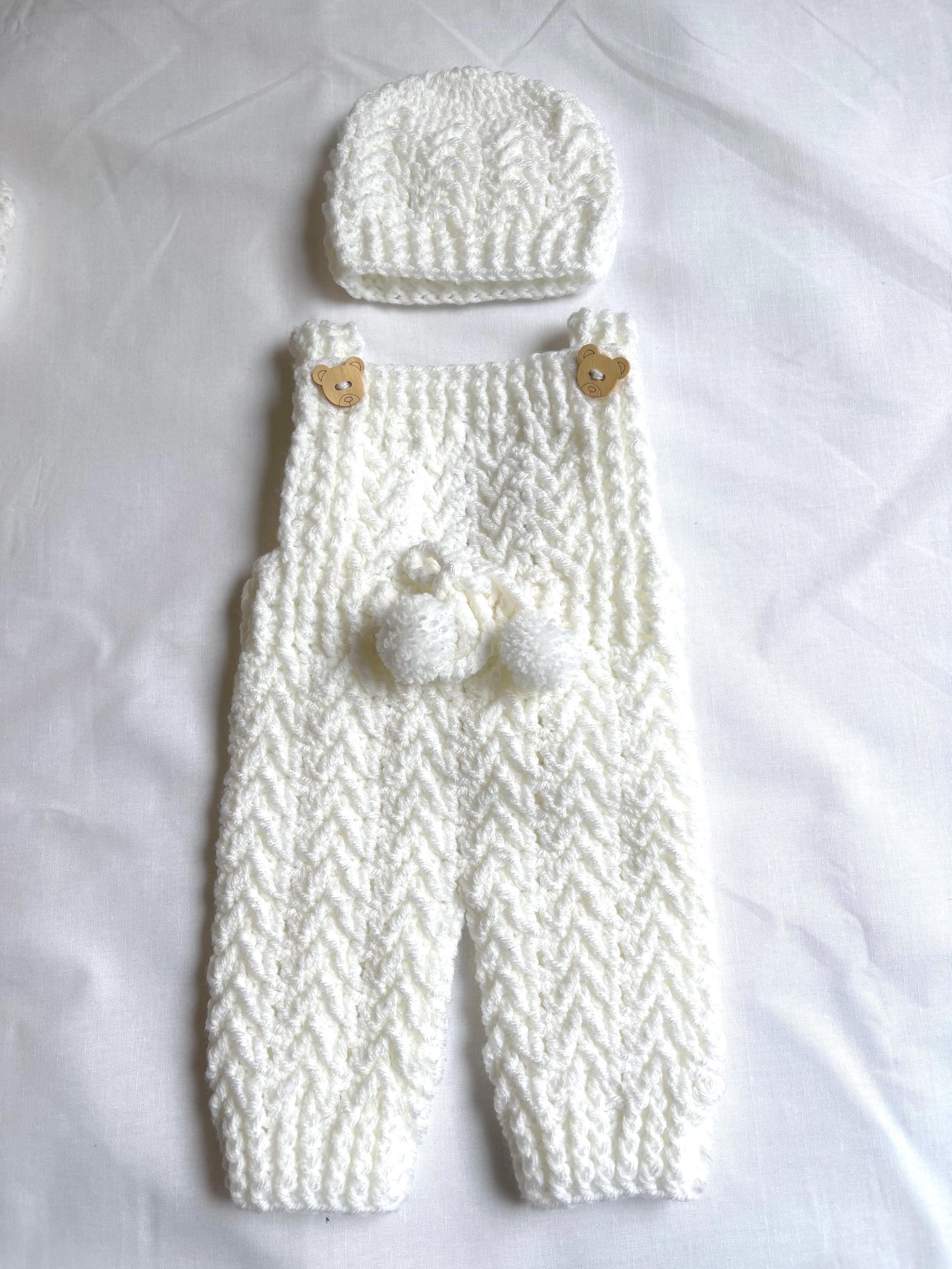 Adorable crochet baby outfit includes overalls, matching cardigan, hat and socks. Available in pink, blue or white. Perfect going home outfit or gift. Made with premium acrylic yarn which is machine washable at 40 degrees and can be tumble dried on a low heat.