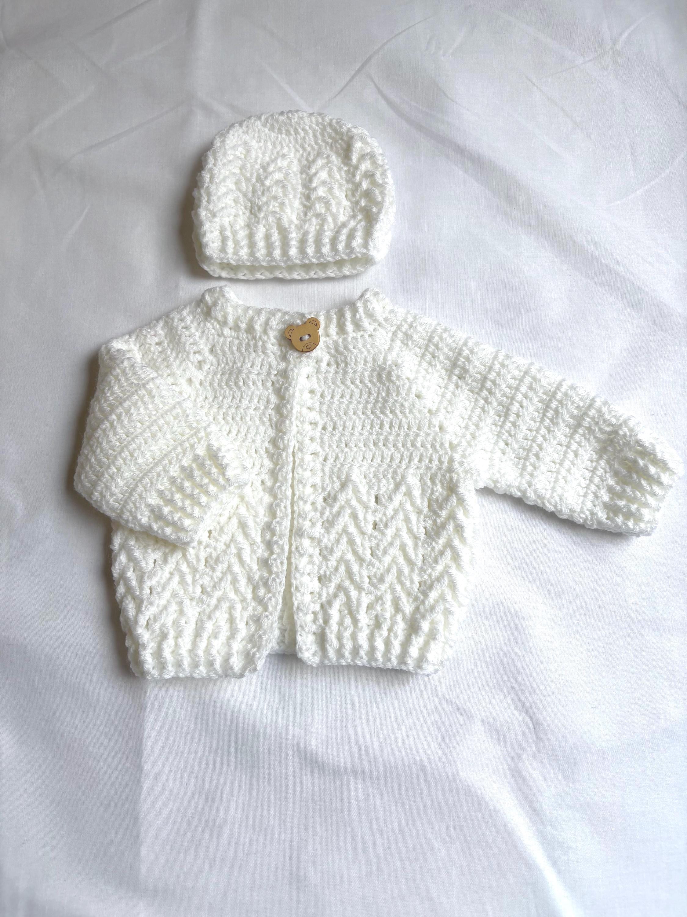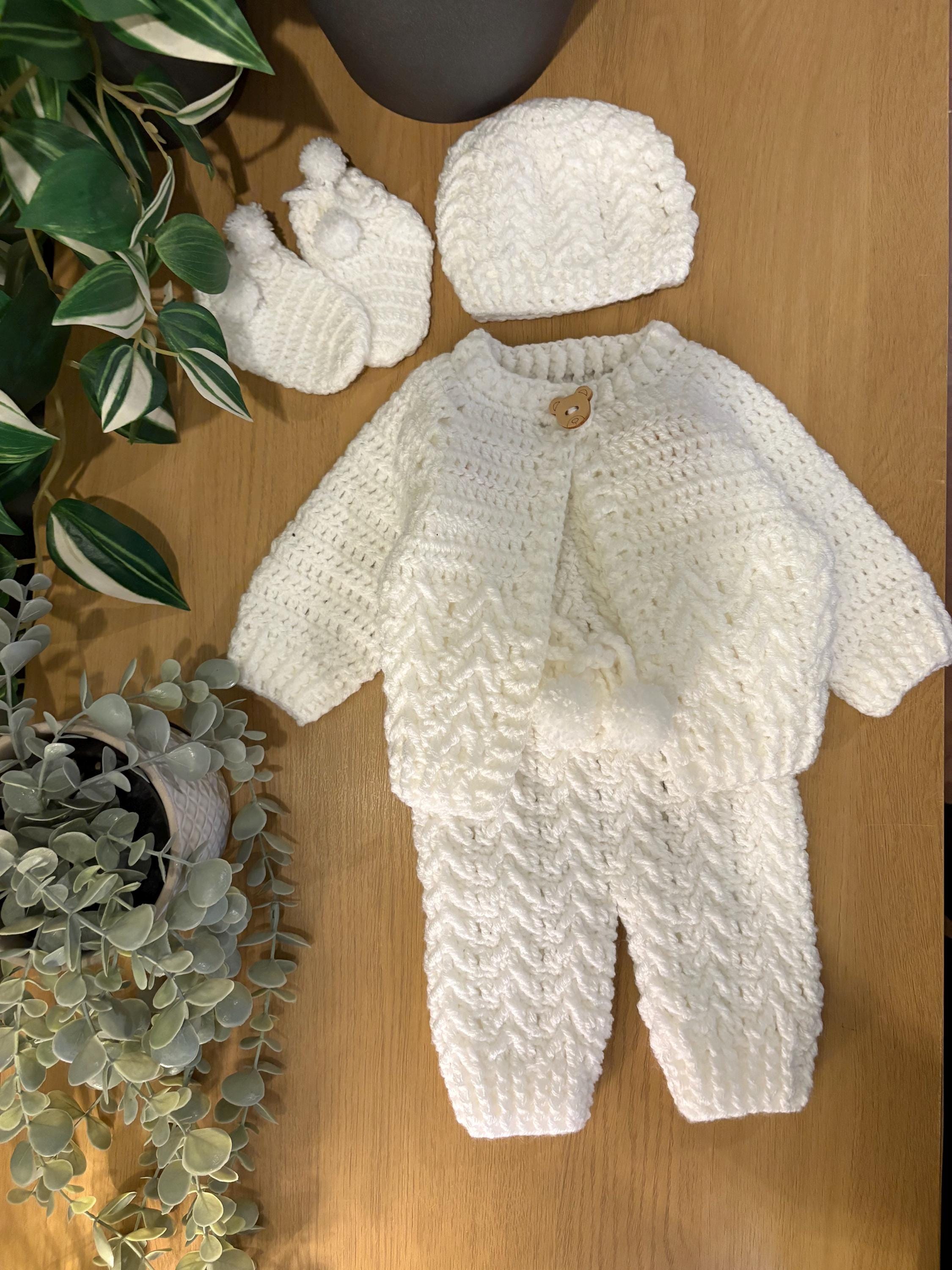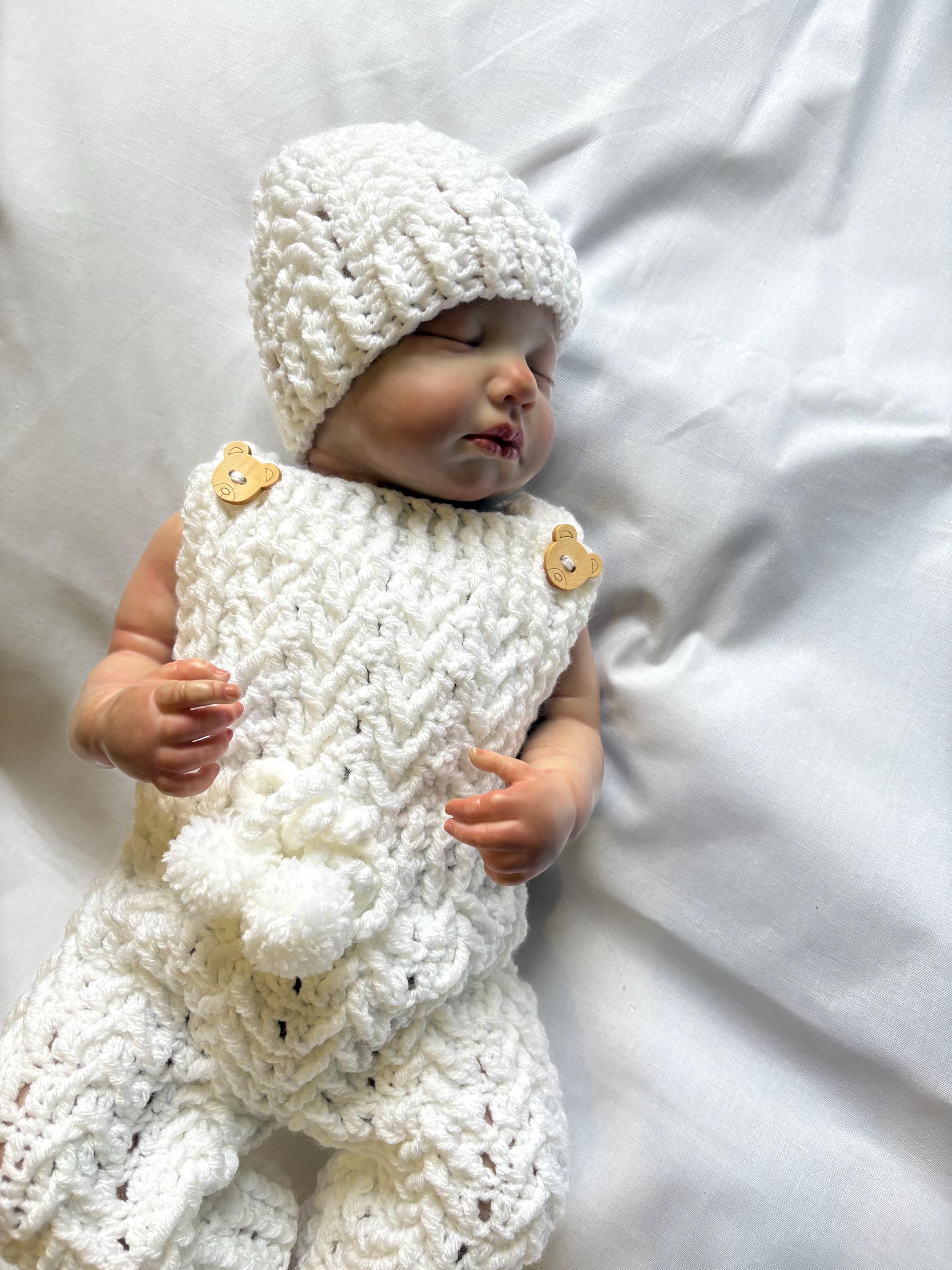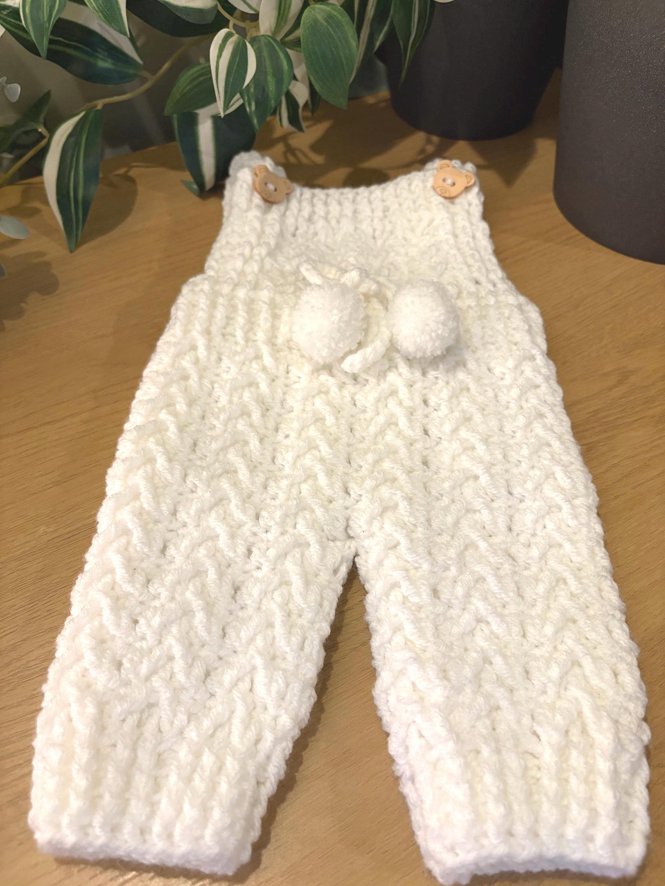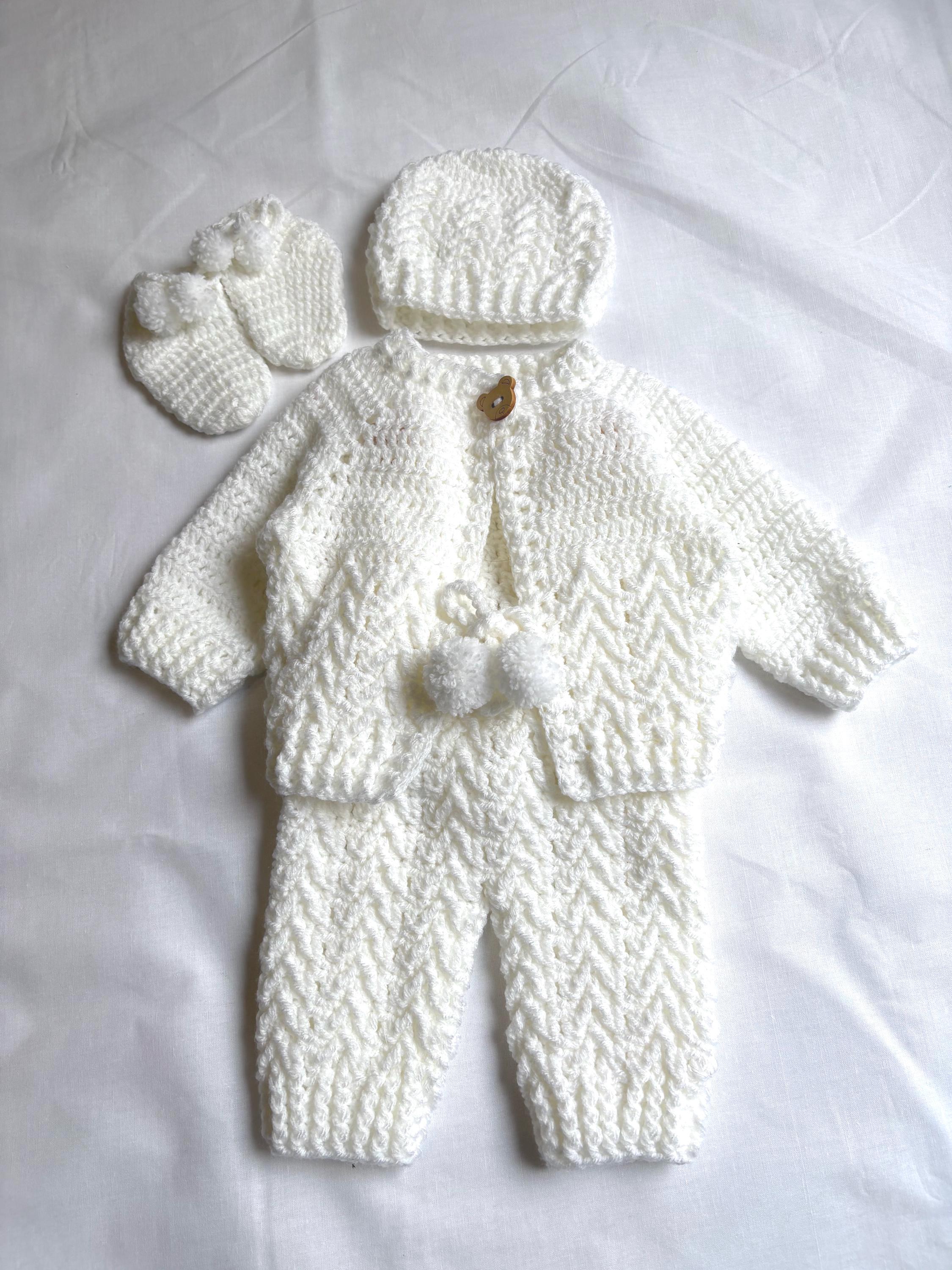 Adorable crochet baby outfit includes overalls, matching cardigan, hat and socks. Available in pink, blue or white. Perfect going home outfit or gift. Made with premium acrylic yarn which is machine washable at 40 degrees and can be tumble dried on a low heat.