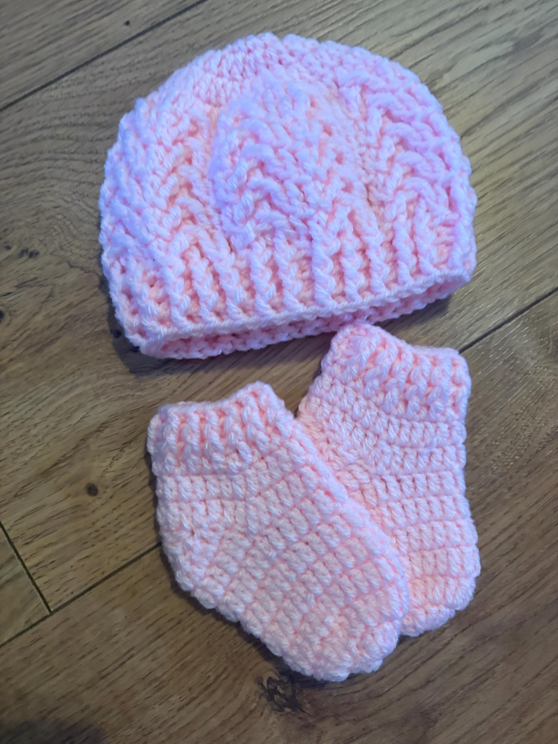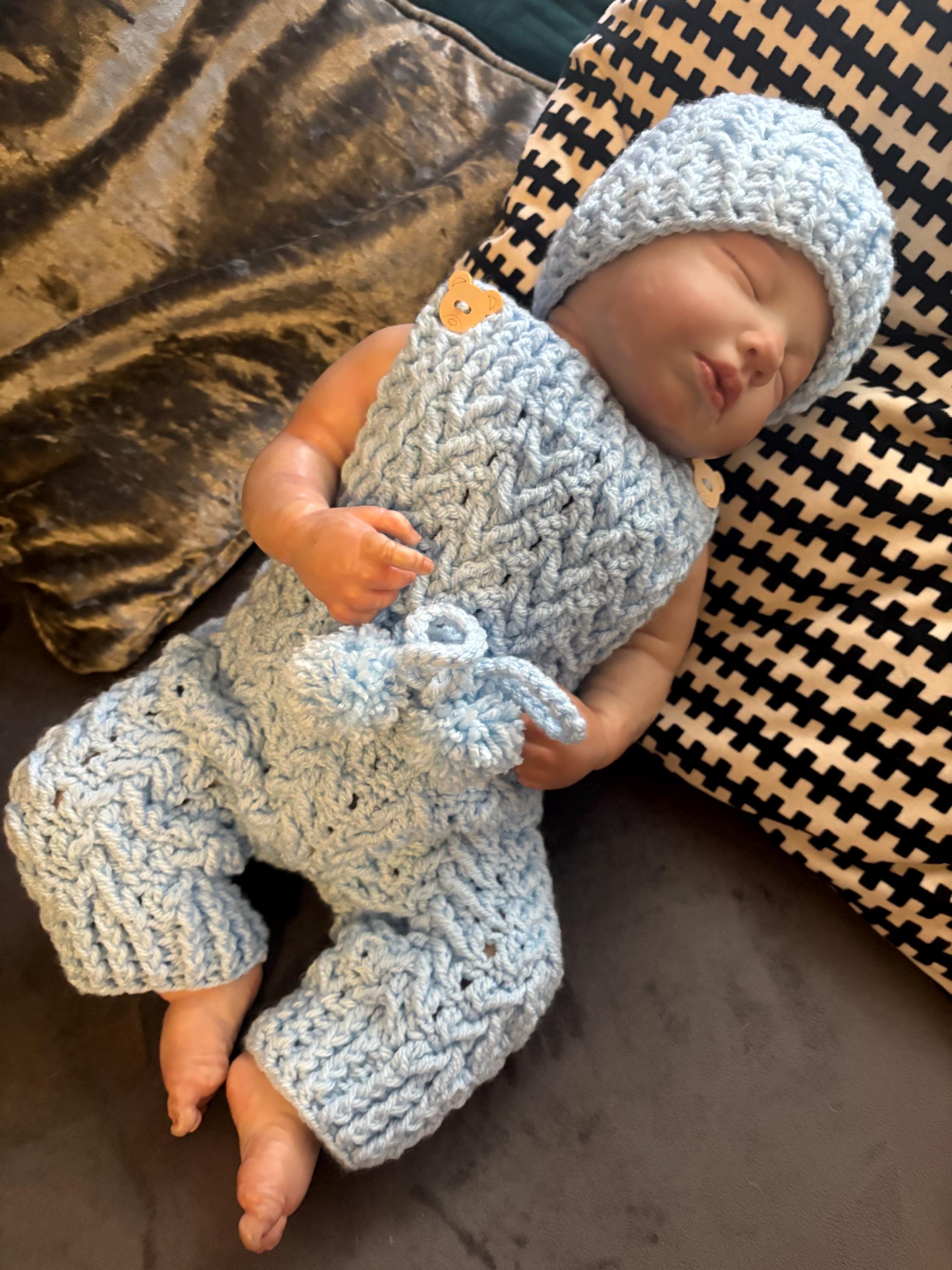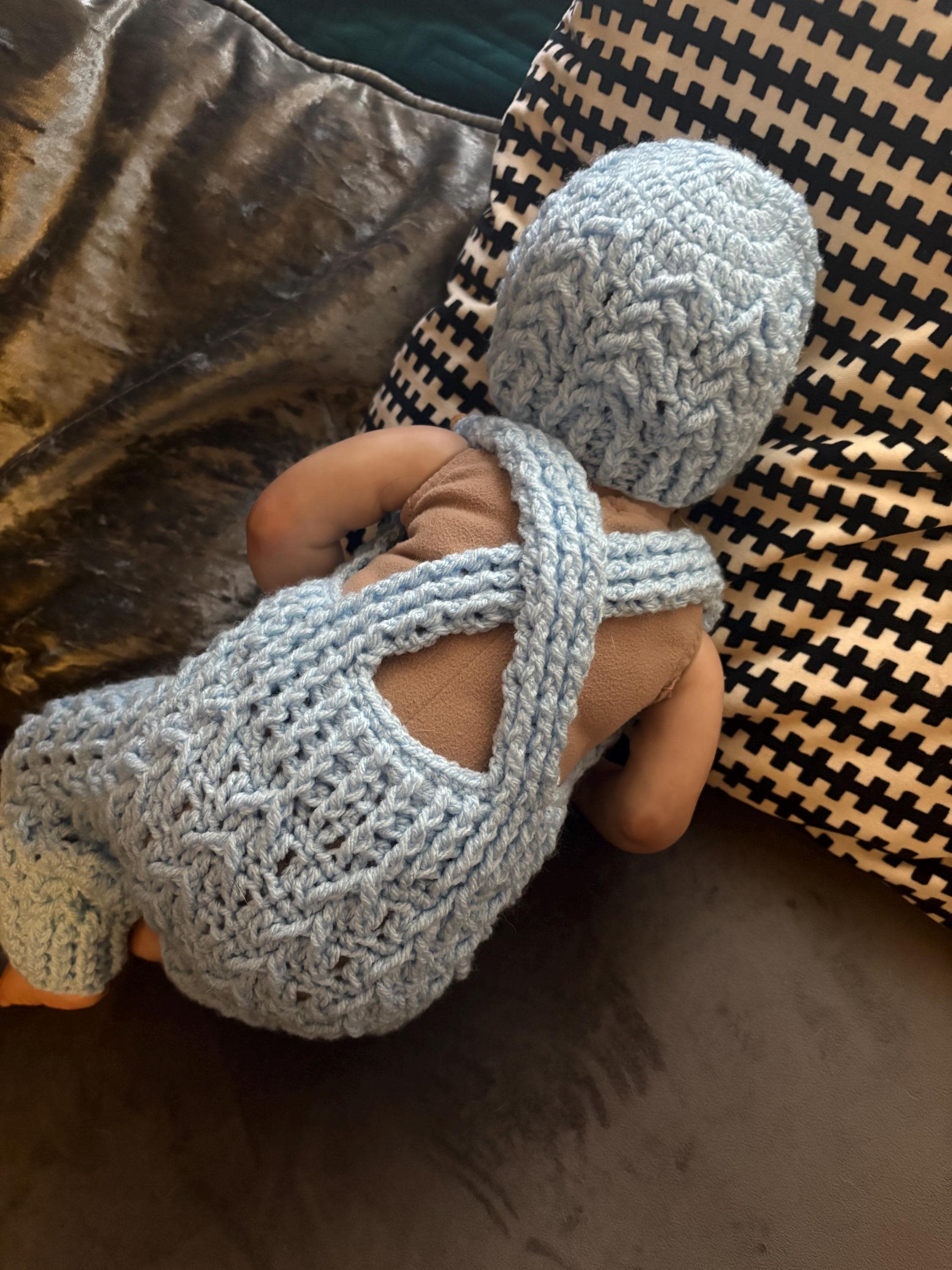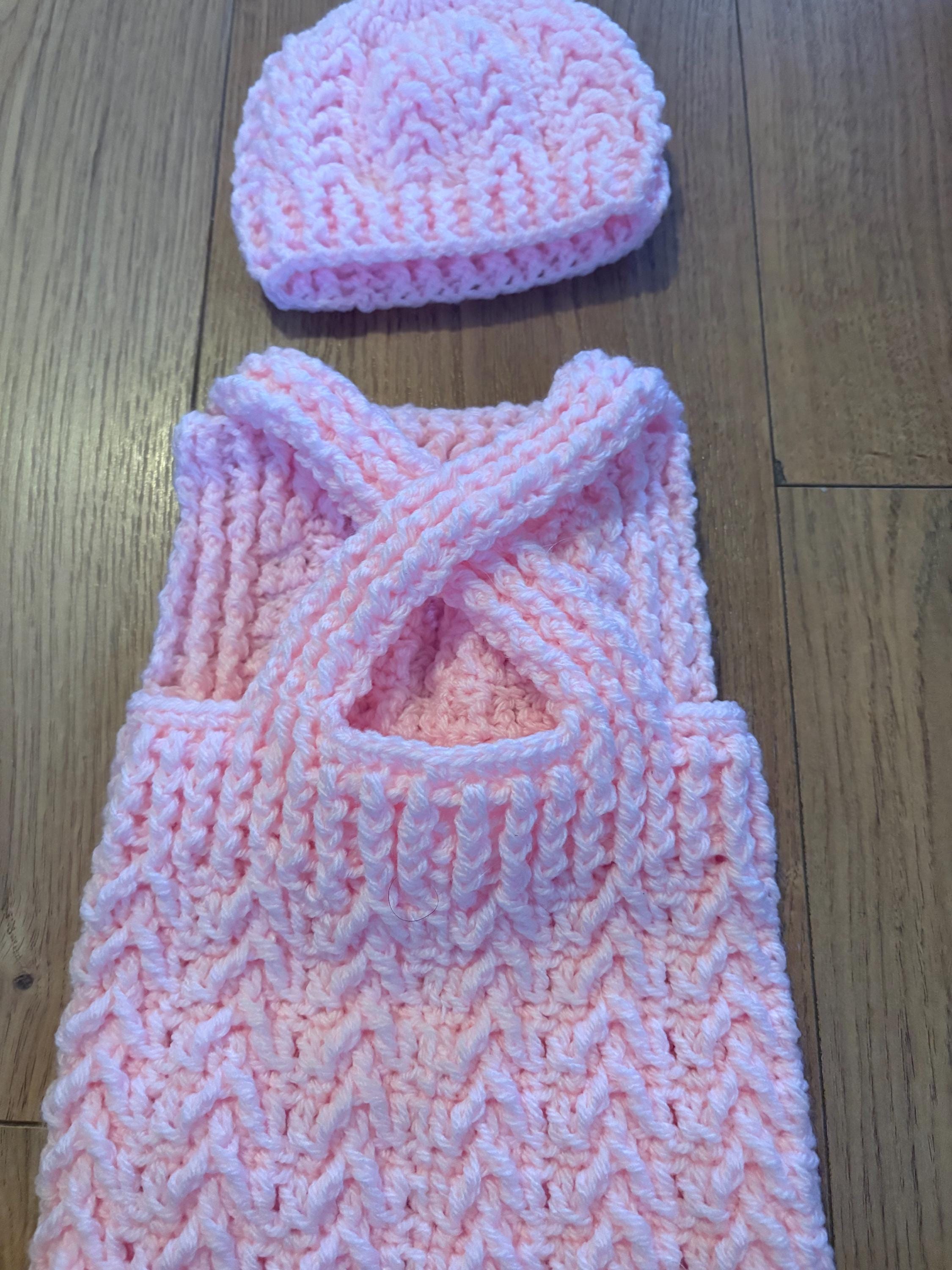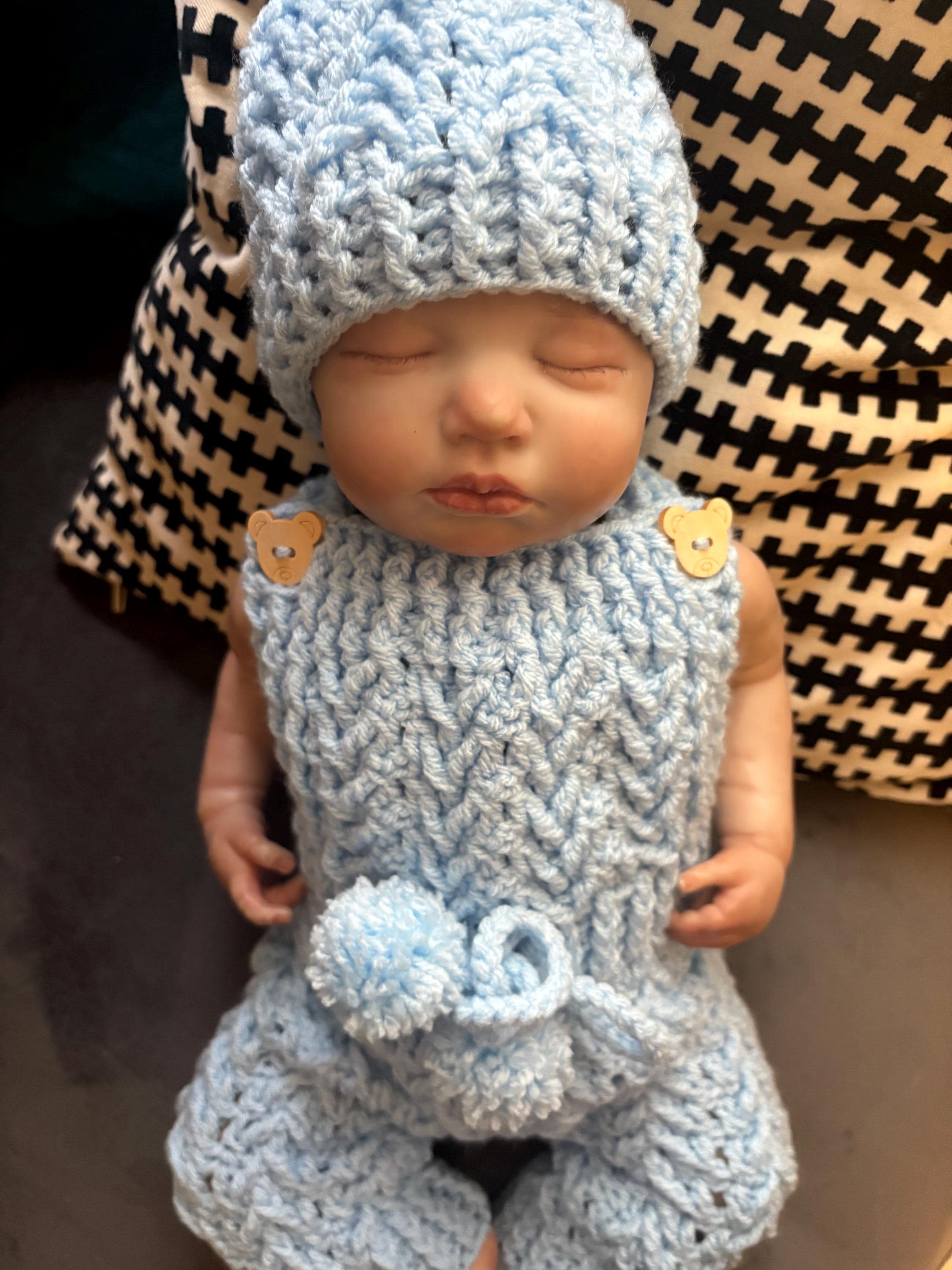 Adorable crochet baby outfit includes overalls, matching cardigan, hat and socks. Available in pink, blue or white. Perfect going home outfit or gift. Made with premium acrylic yarn which is machine washable at 40 degrees and can be tumble dried on a low heat.