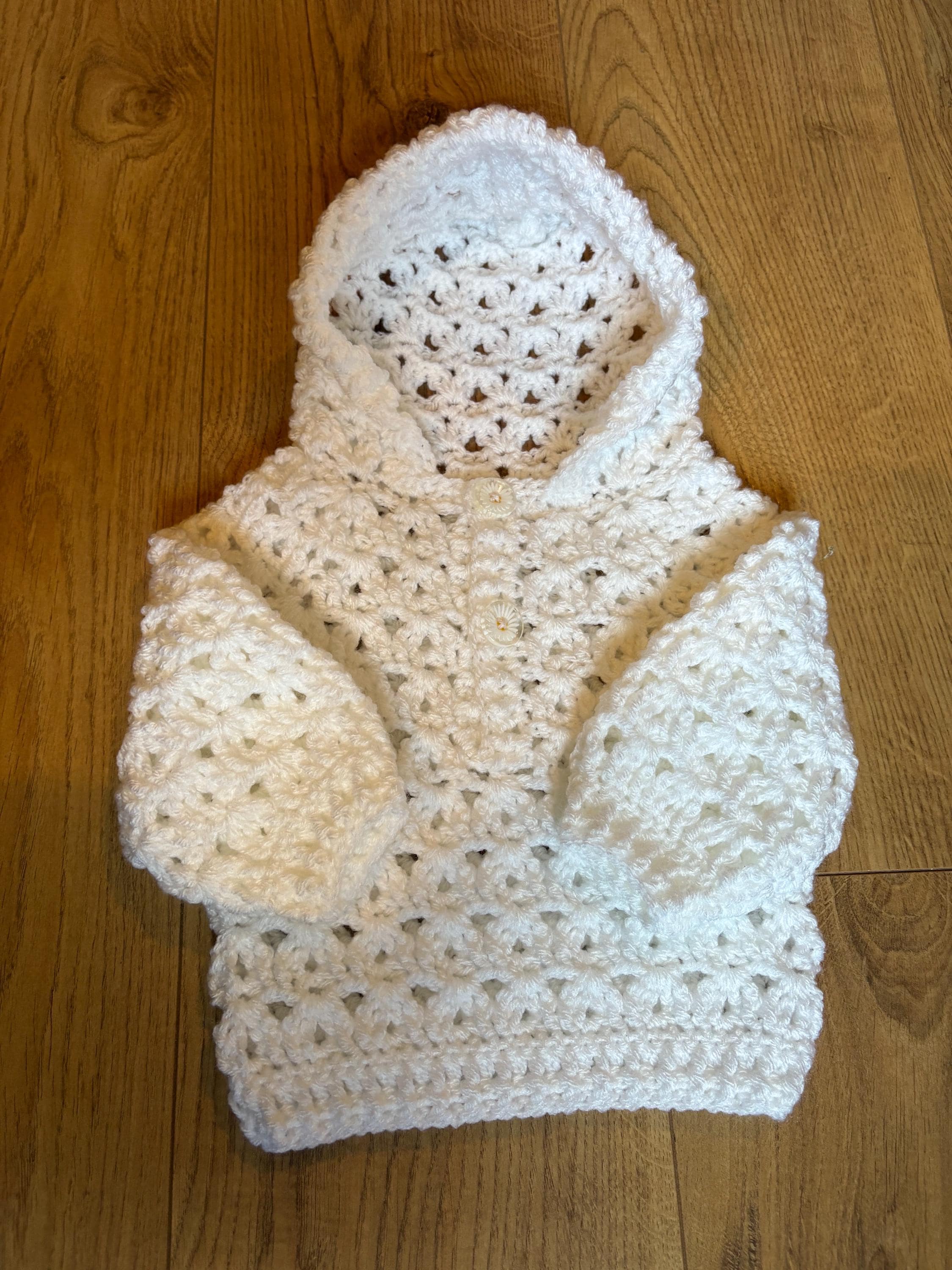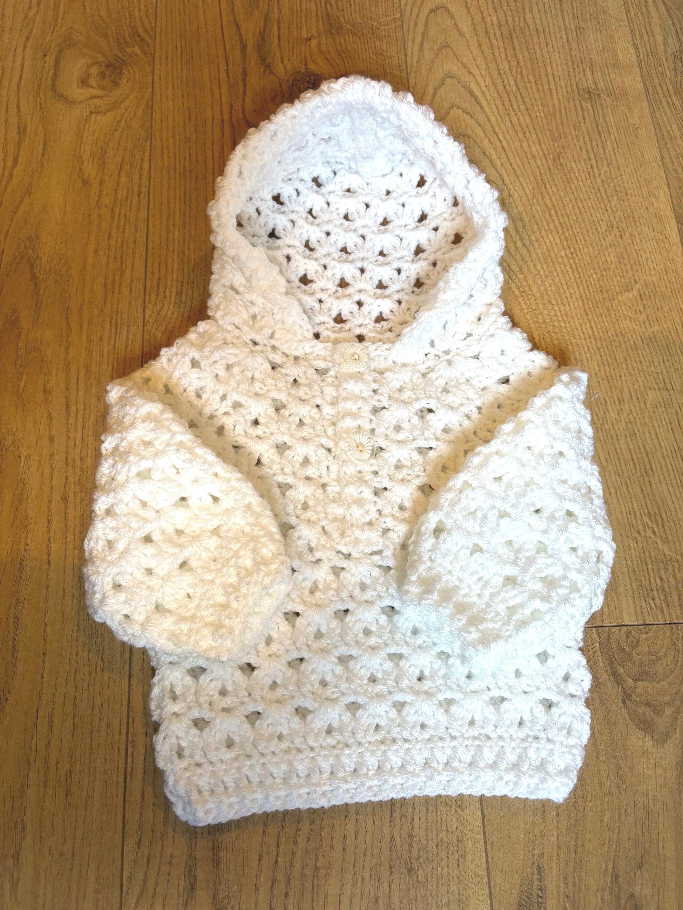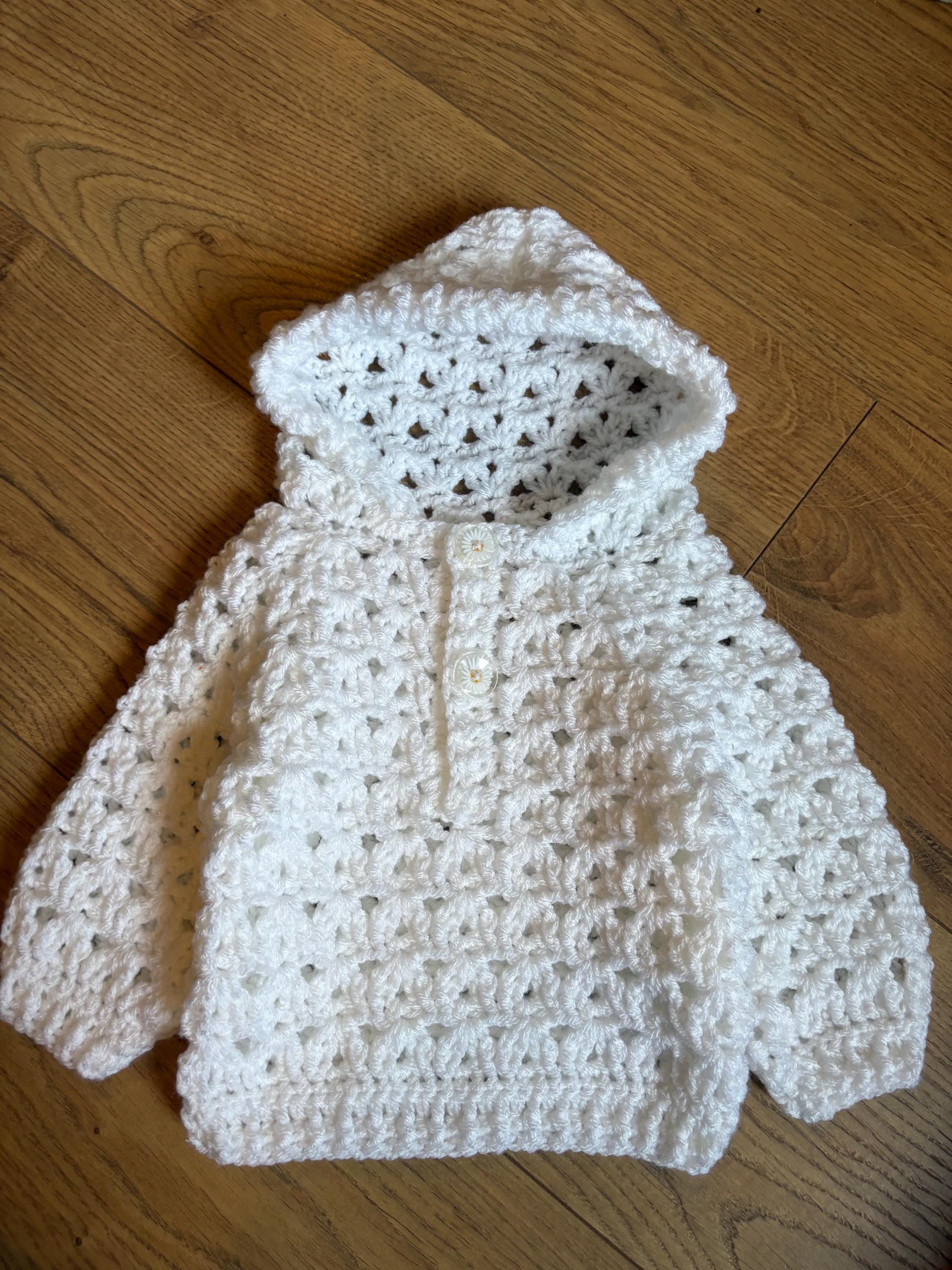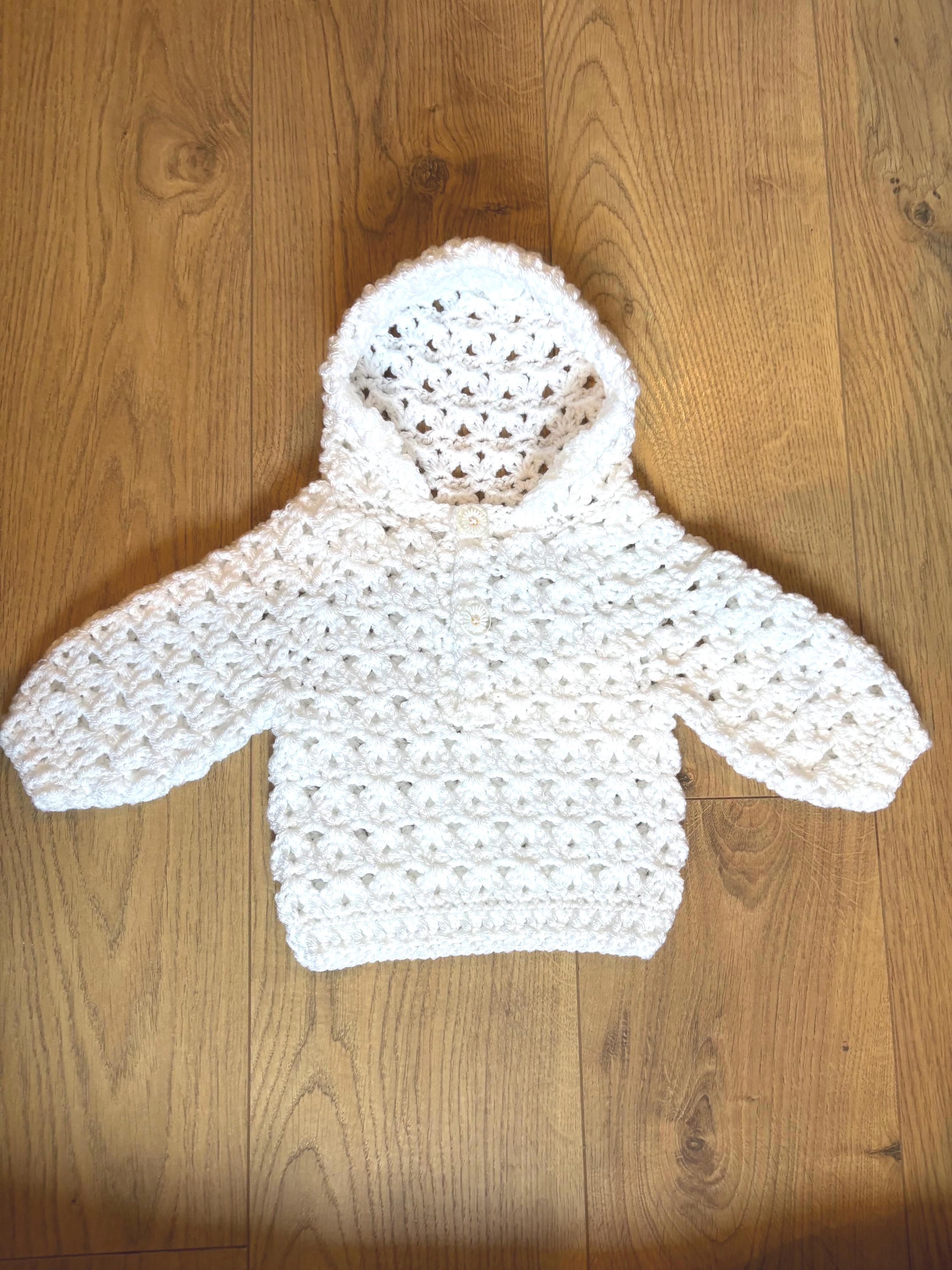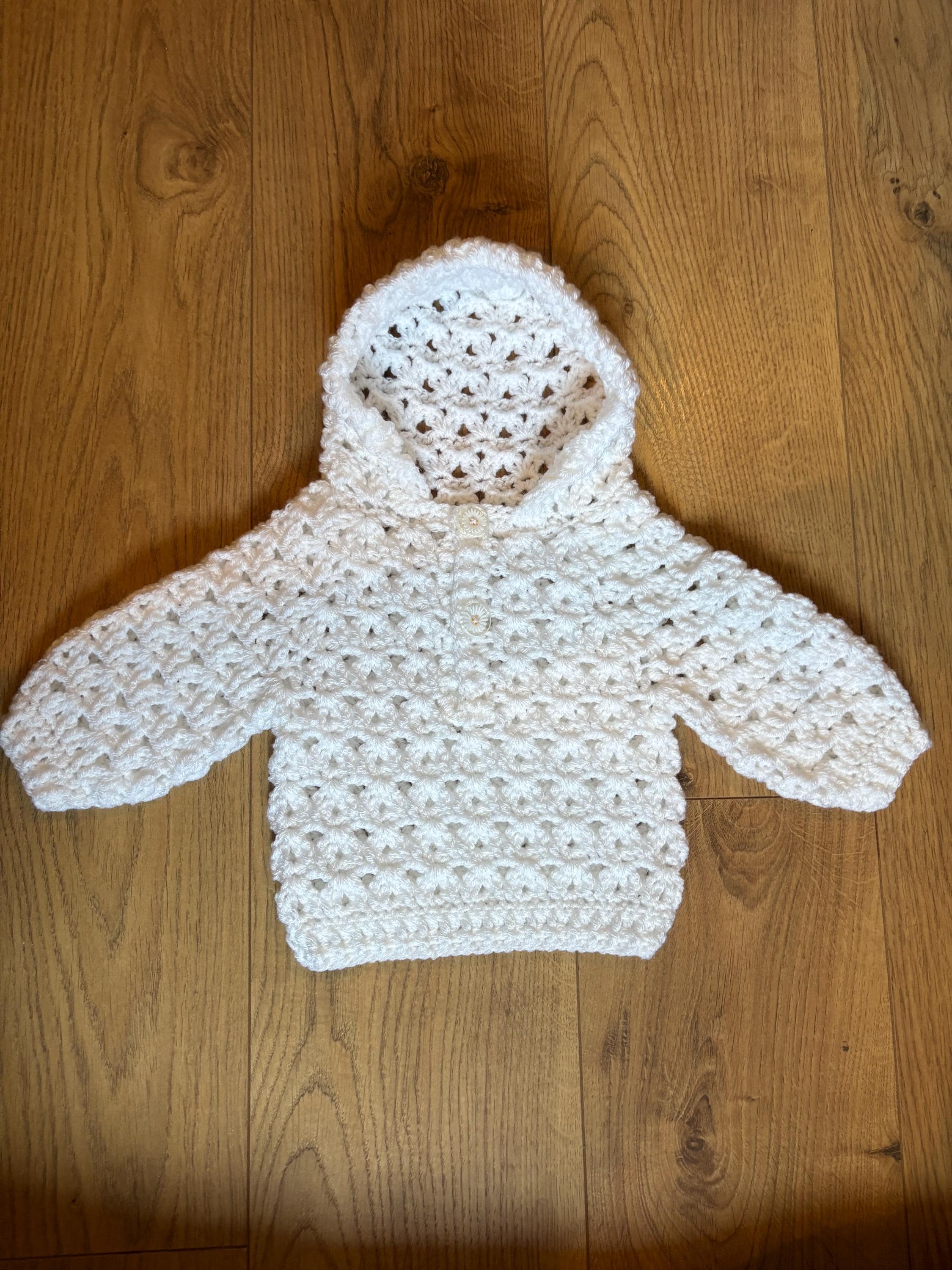 Gorgeous hand crafted crochet baby pullover/jumper perfect for keeping little one cosy and stylish. This pullover features long sleeves and hood with cute daisy buttons at the front. It is machine washable at 40 degrees for easy care and made with soft acrylic yarn.