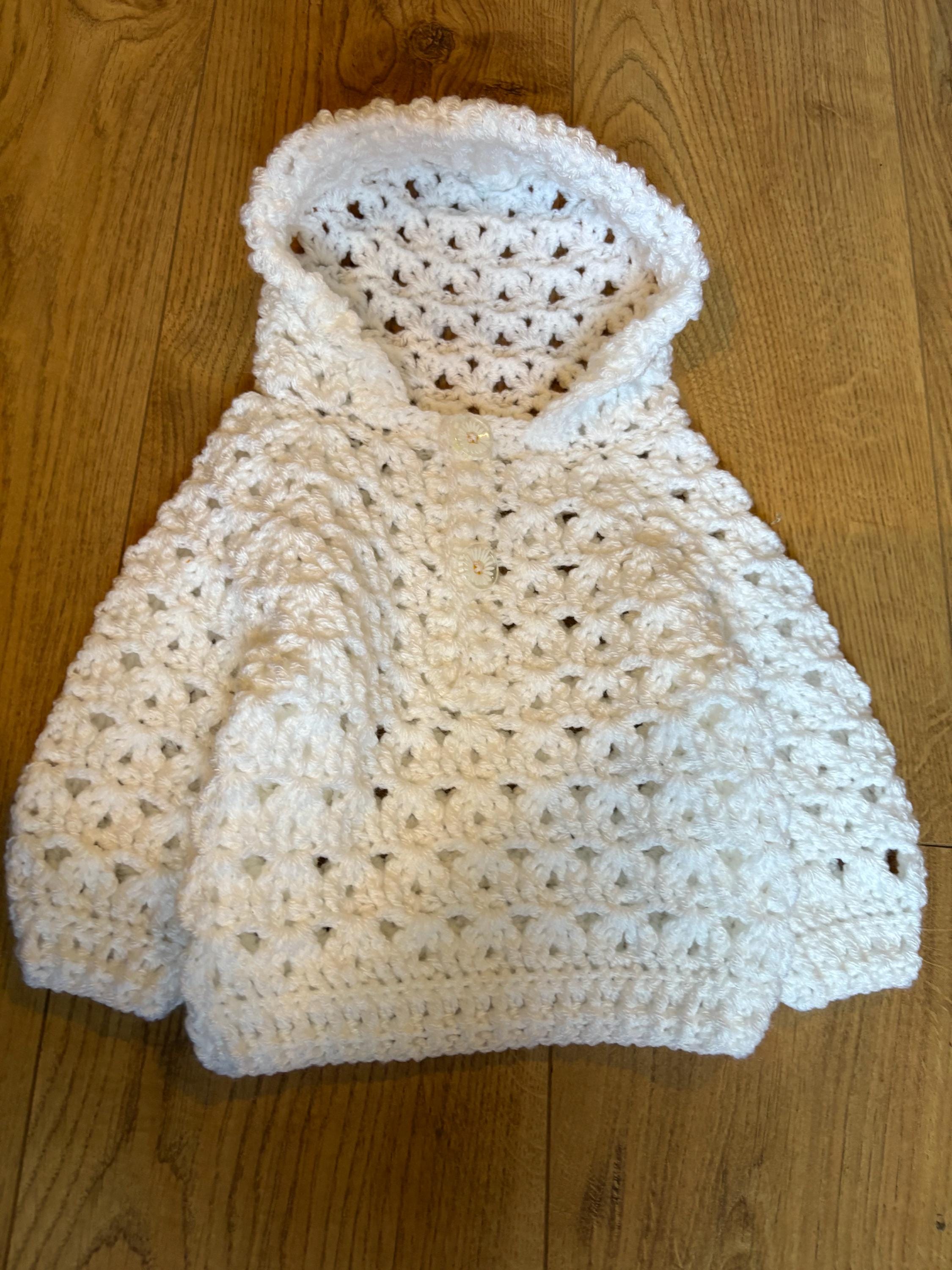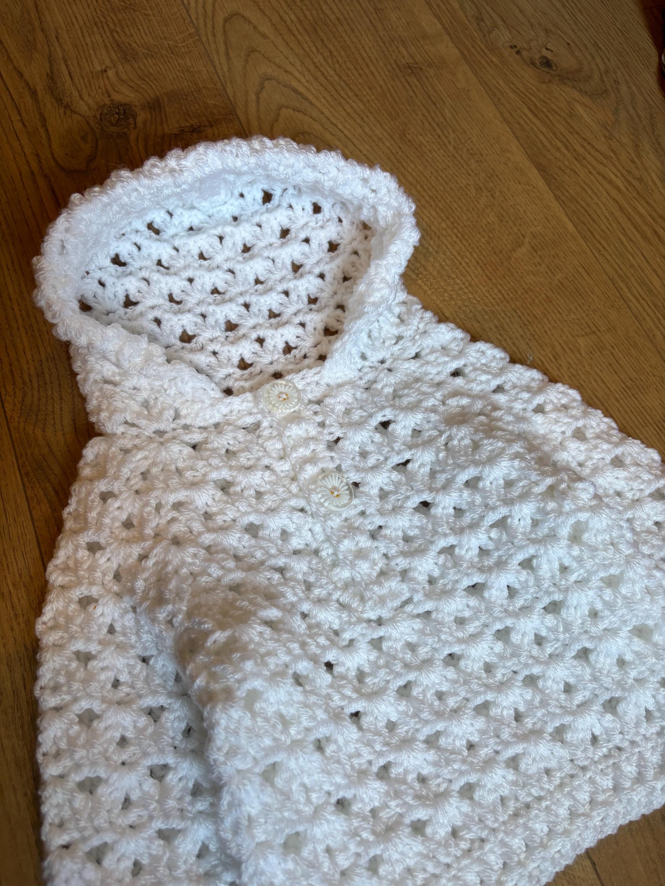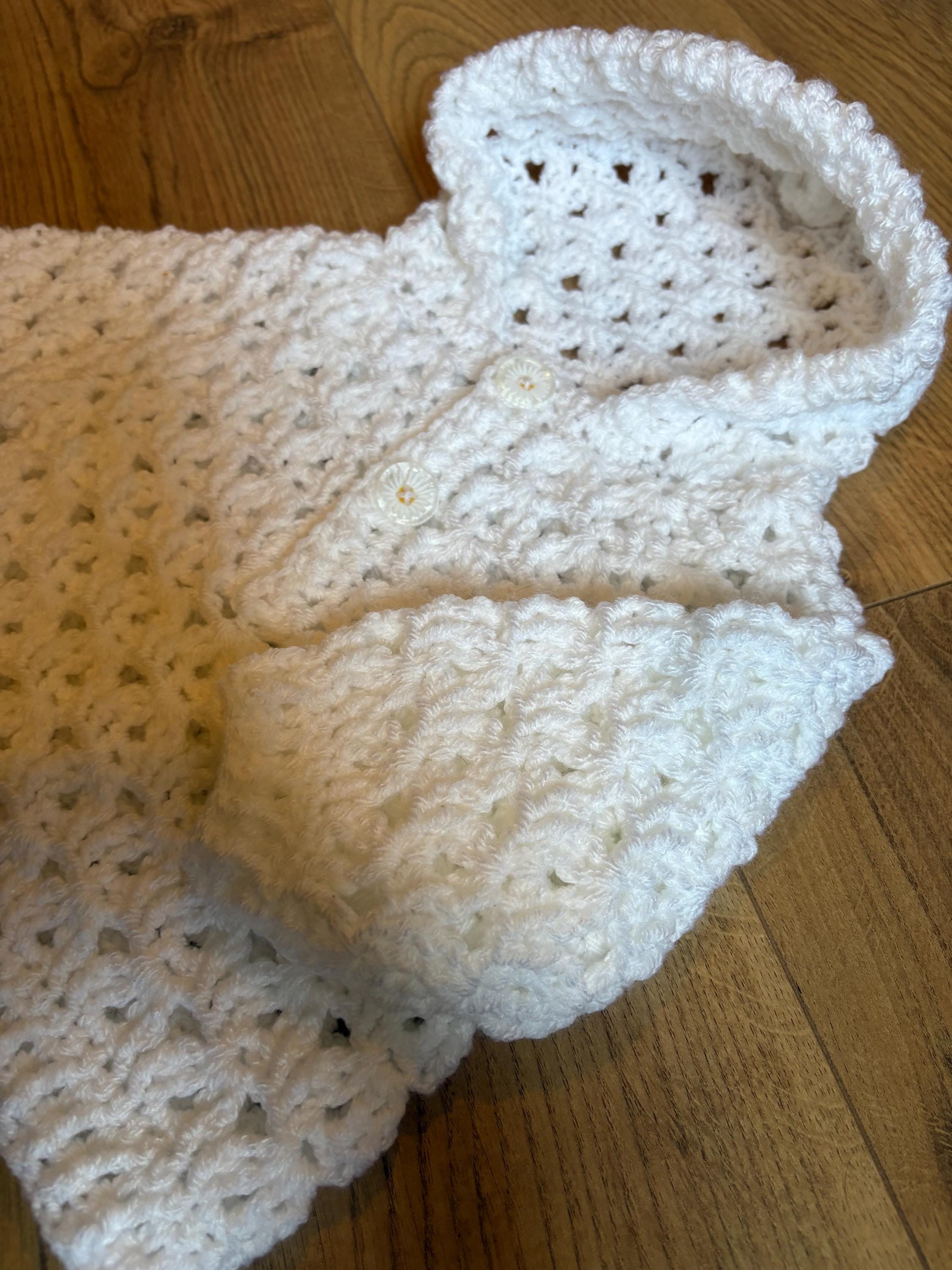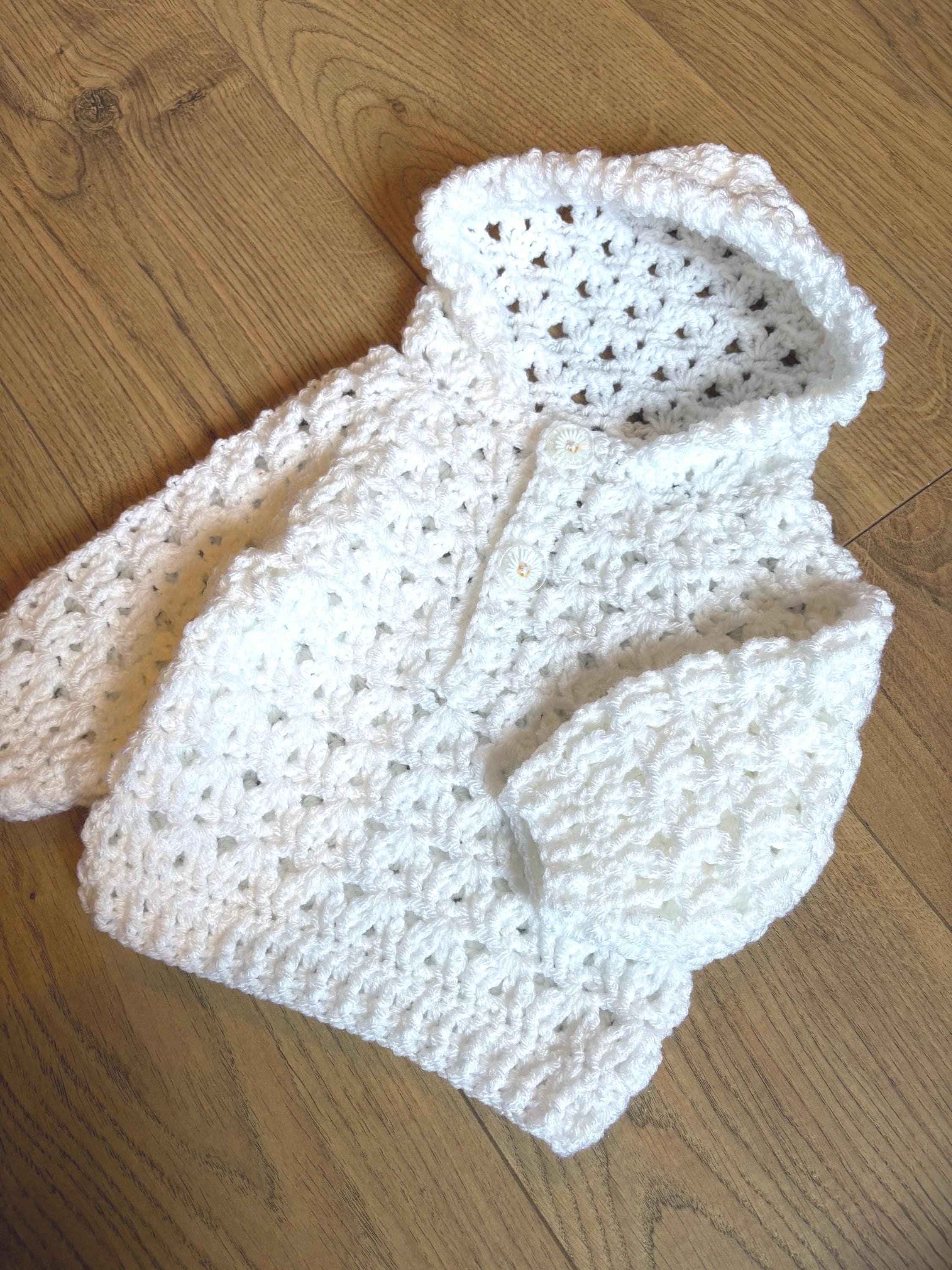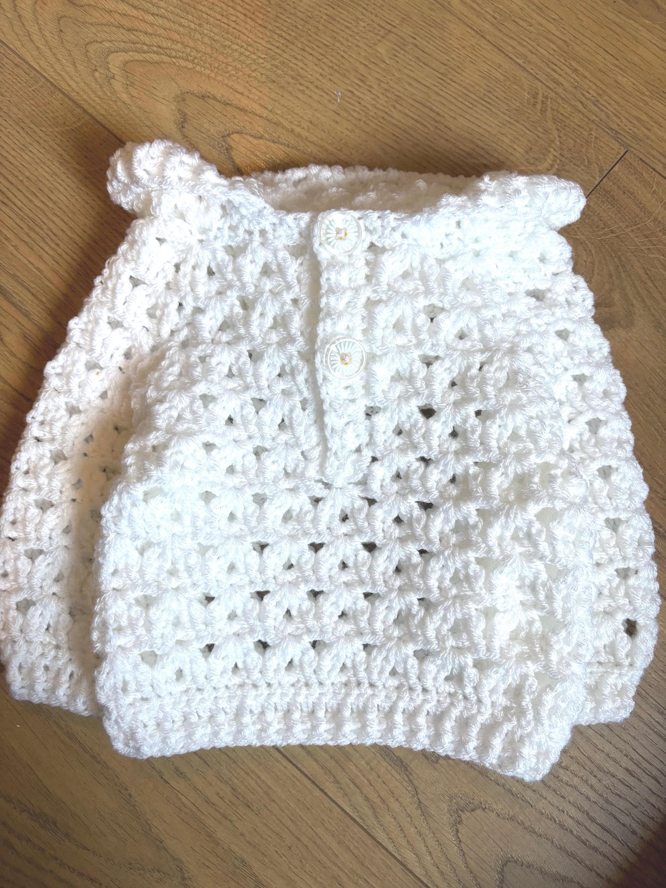 Gorgeous hand crafted crochet baby pullover/jumper perfect for keeping little one cosy and stylish. This pullover features long sleeves and hood with cute daisy buttons at the front. It is machine washable at 40 degrees for easy care and made with soft acrylic yarn.
