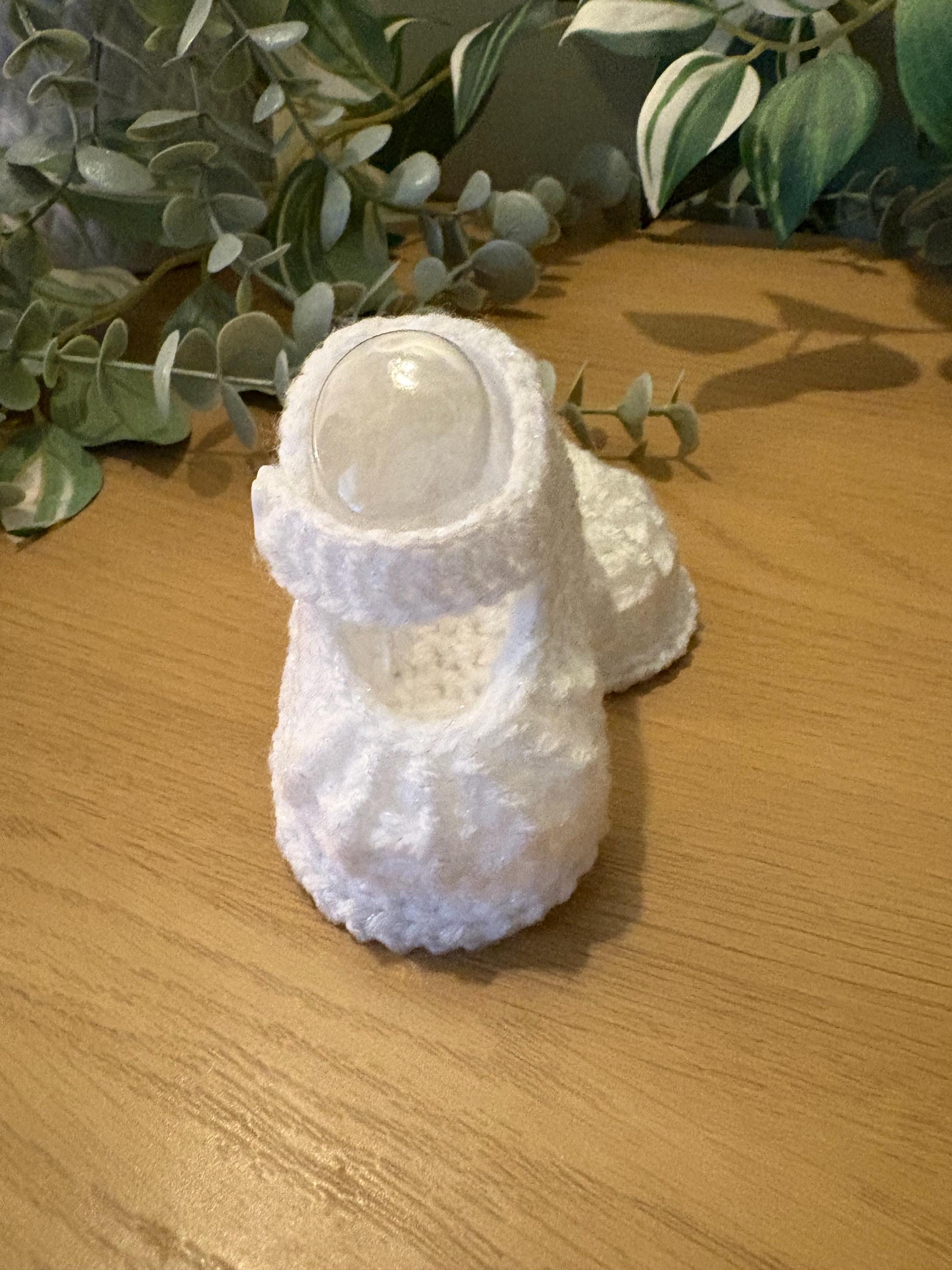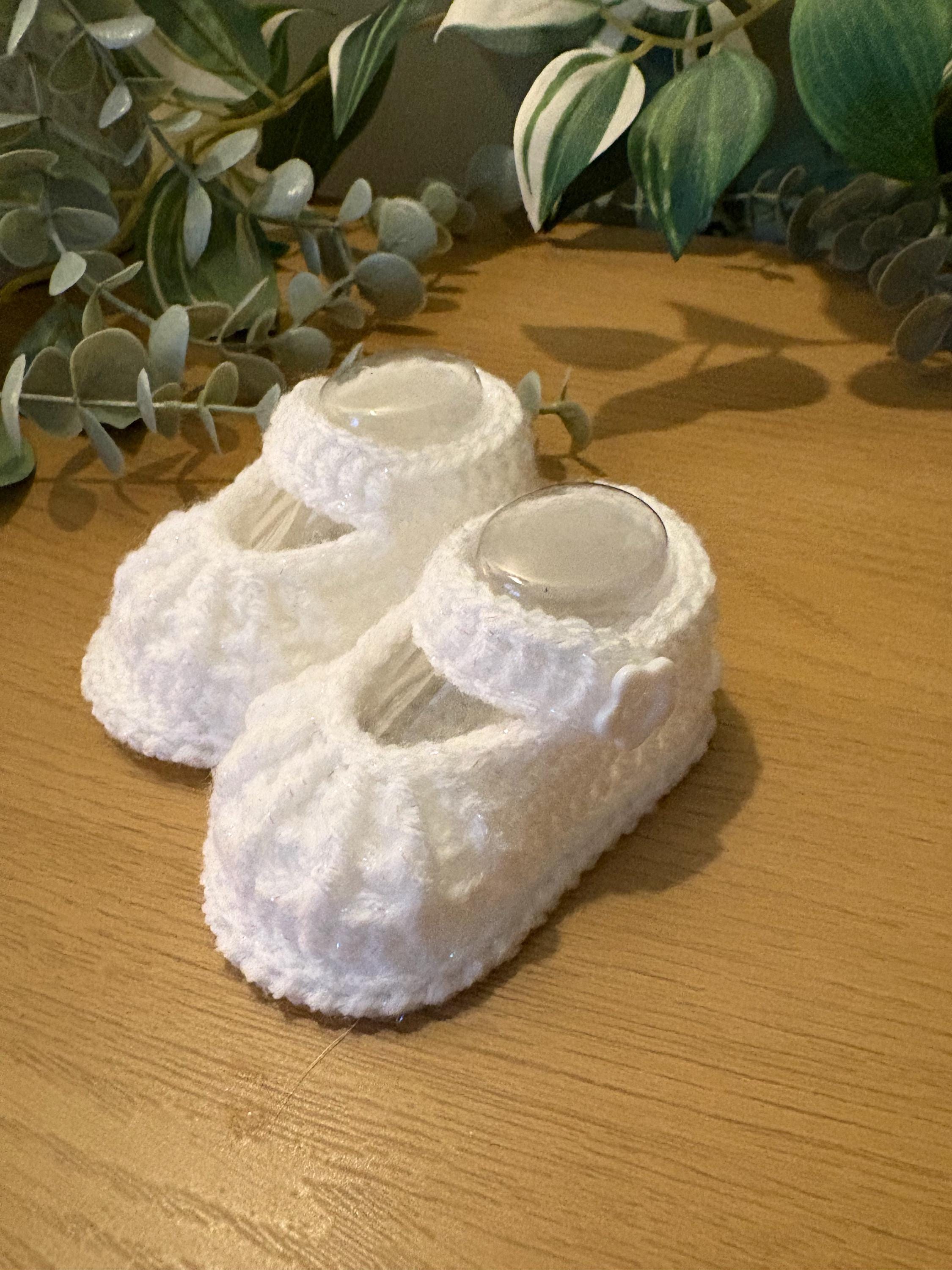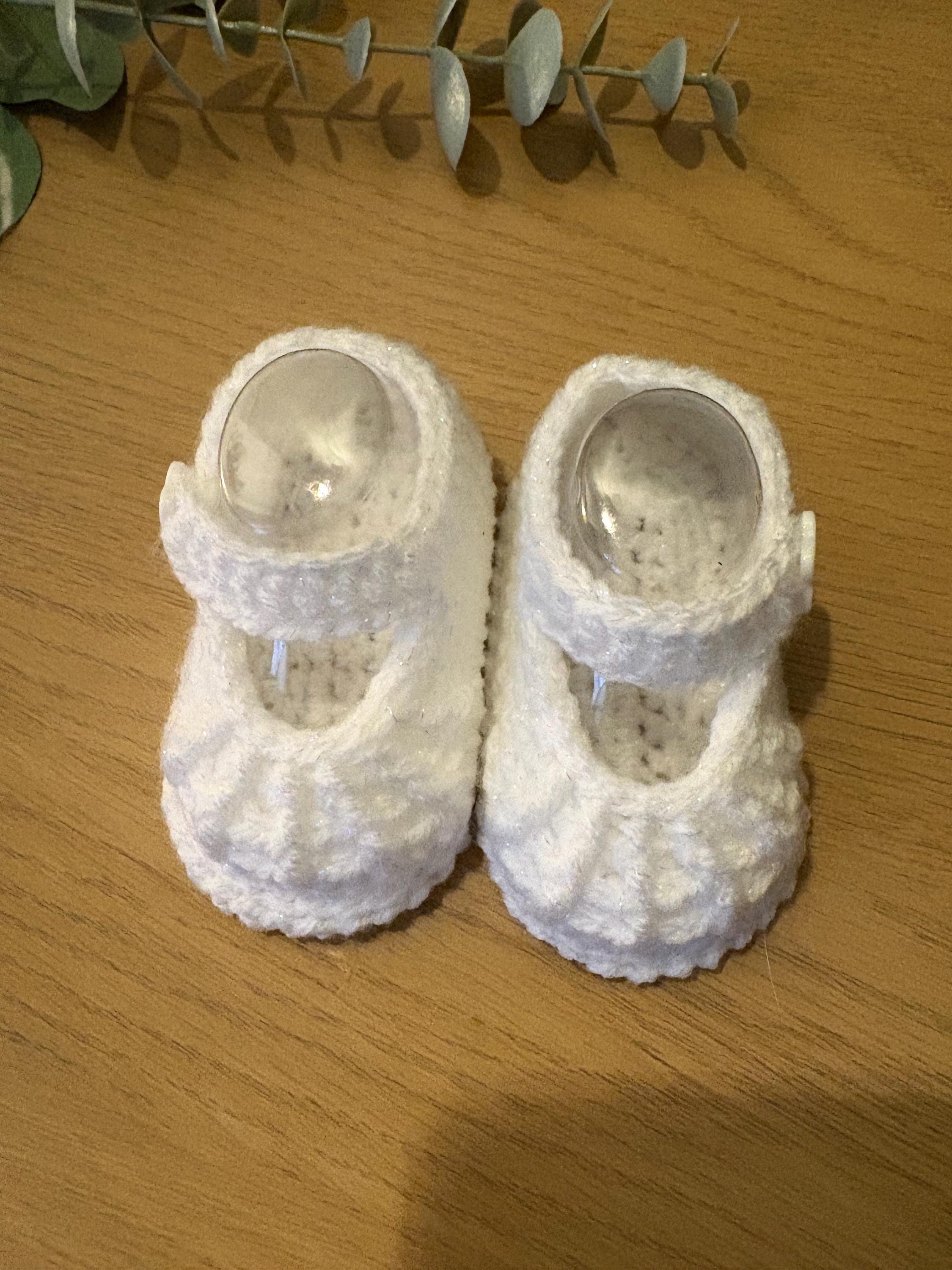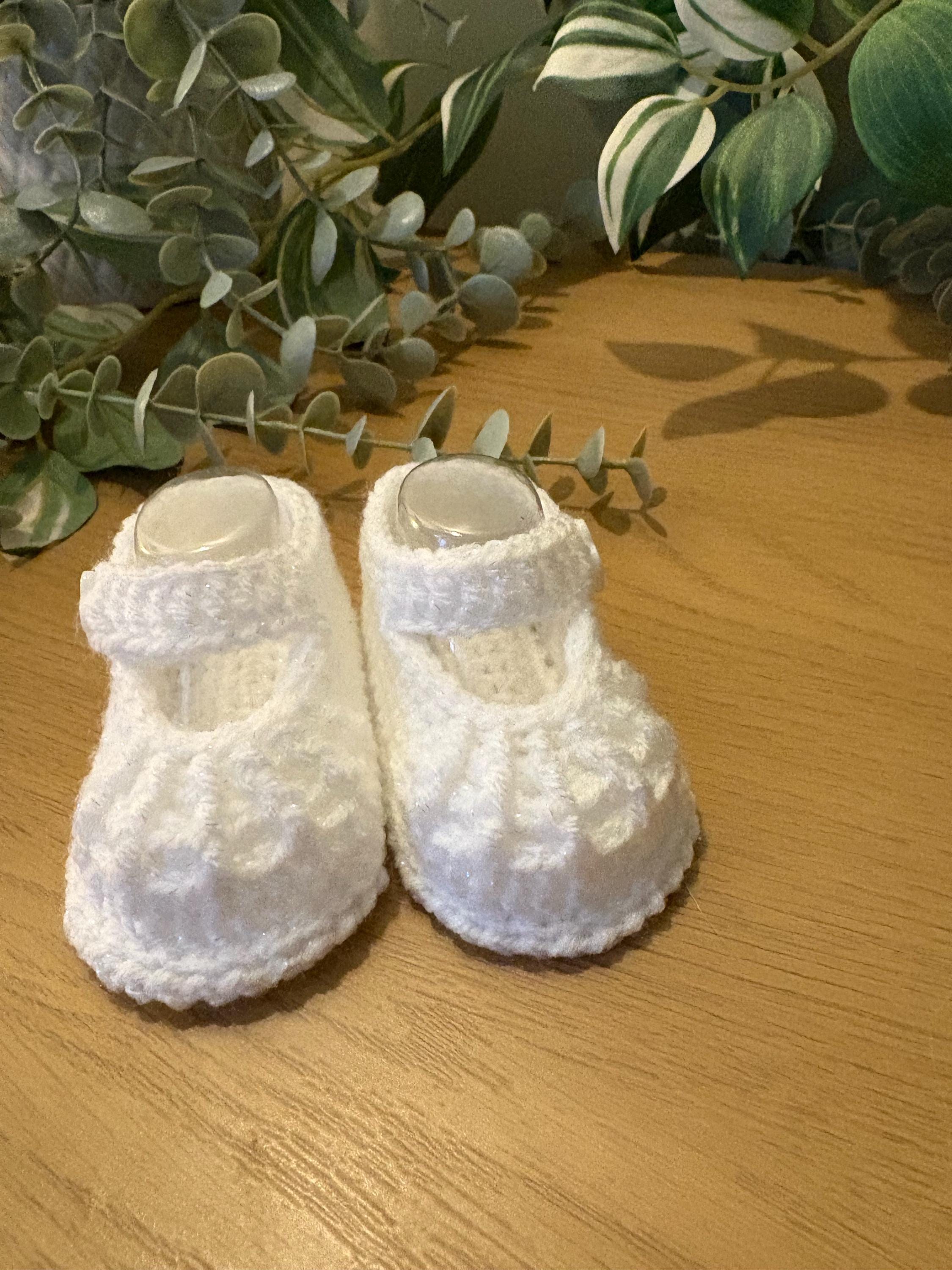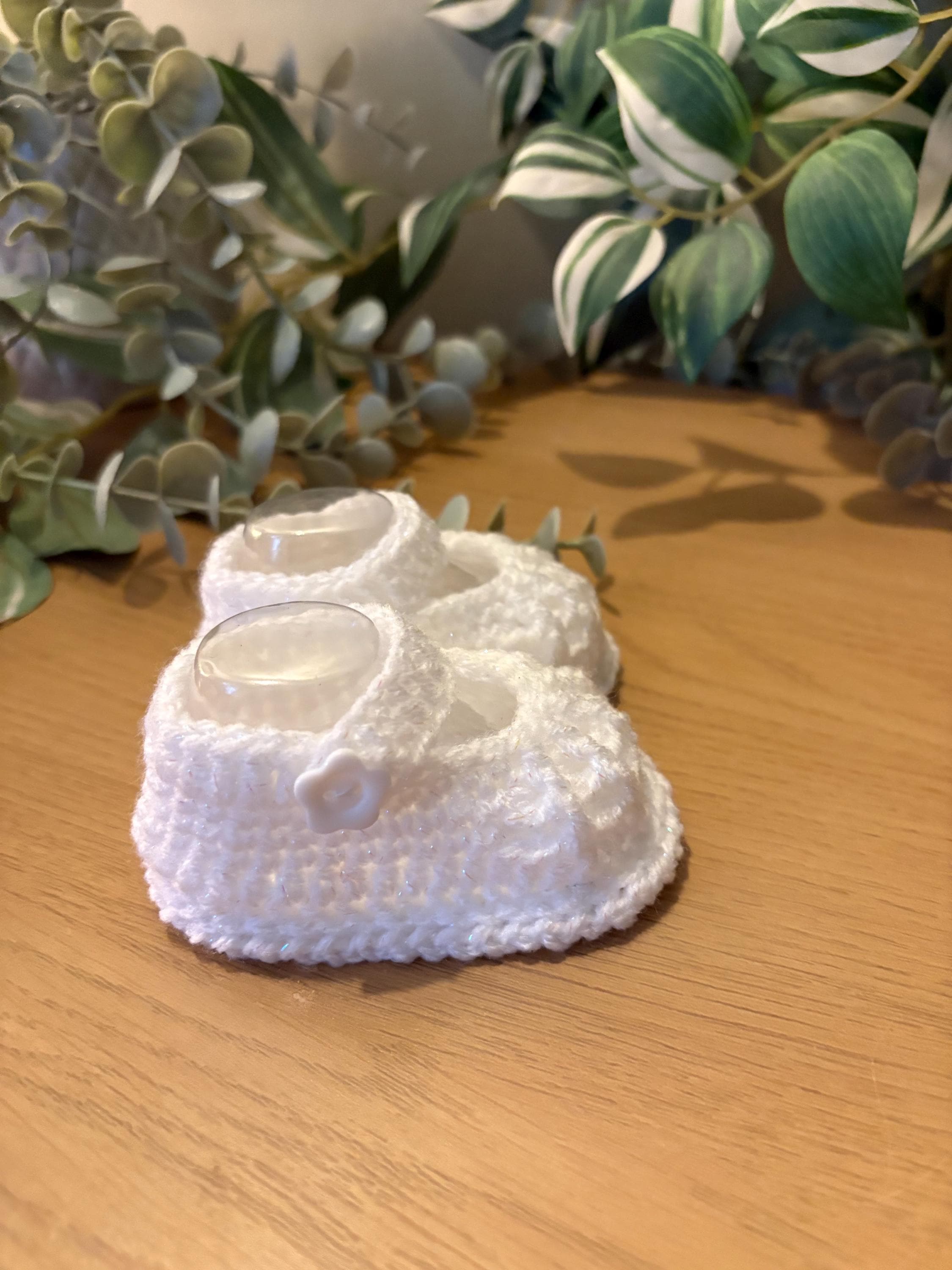 White touch of sparkle handmade baby booties crocheted in a Mary Jane style with flower button. Matching dress available in my shop. Complementary plastic insterts included to maintain perfect shape of shoes after washing. Machine wash up to 40 degrees and air dry with plastic inserts inside for best results.