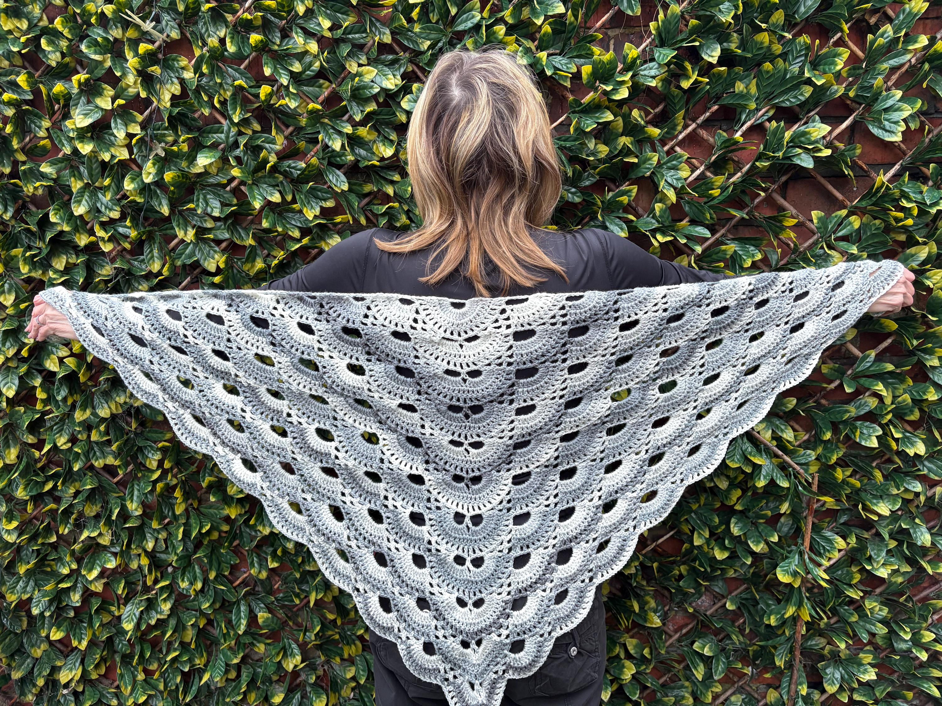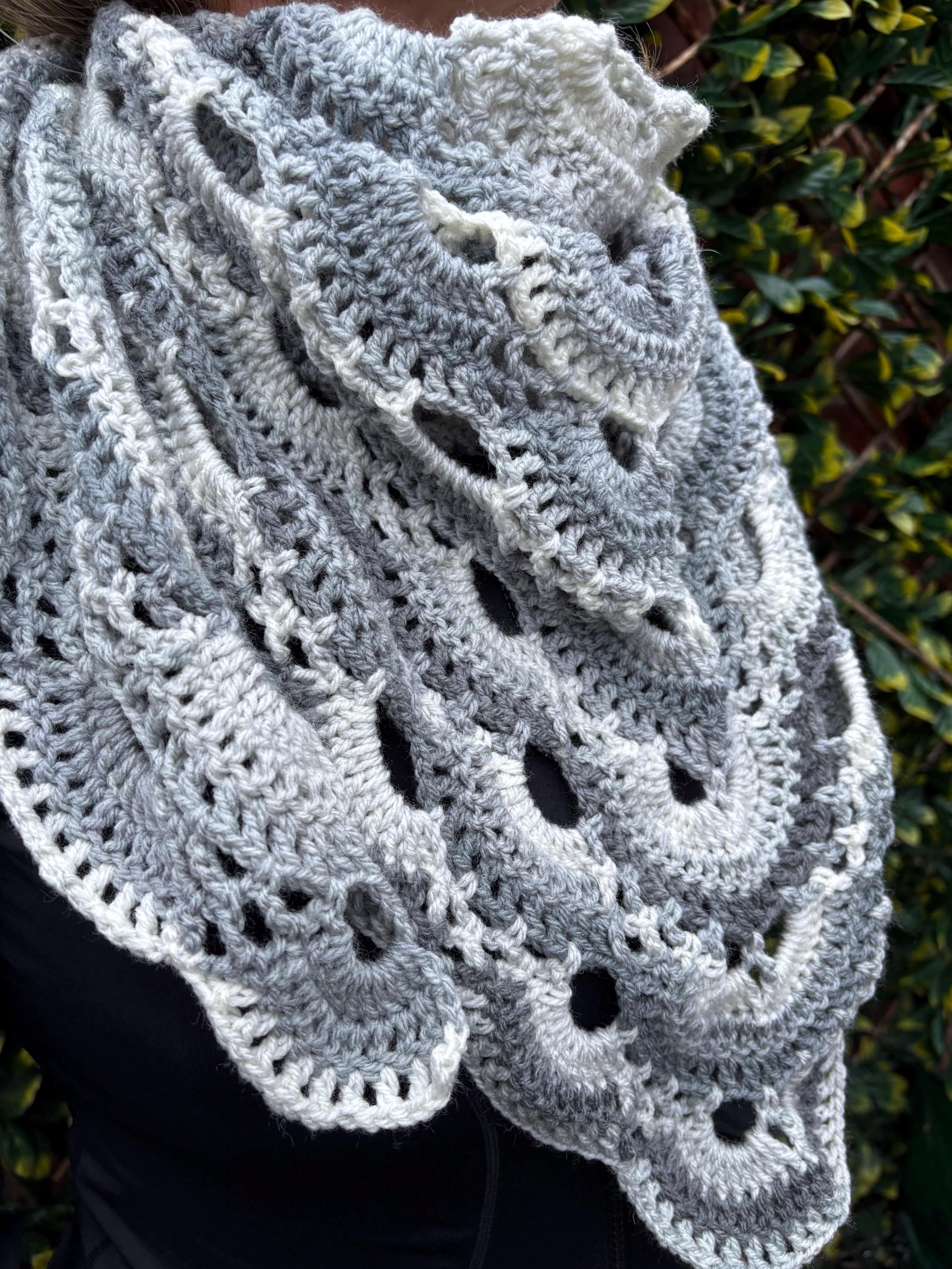 Beautiful hand crochet triangle scarf/shawl, stylish colourway in greys and cream. Large size as shown in pictures, lovely soft high quality light weight variegated yarn used, acrylic/wool blend. Machine washable at 40 degrees.