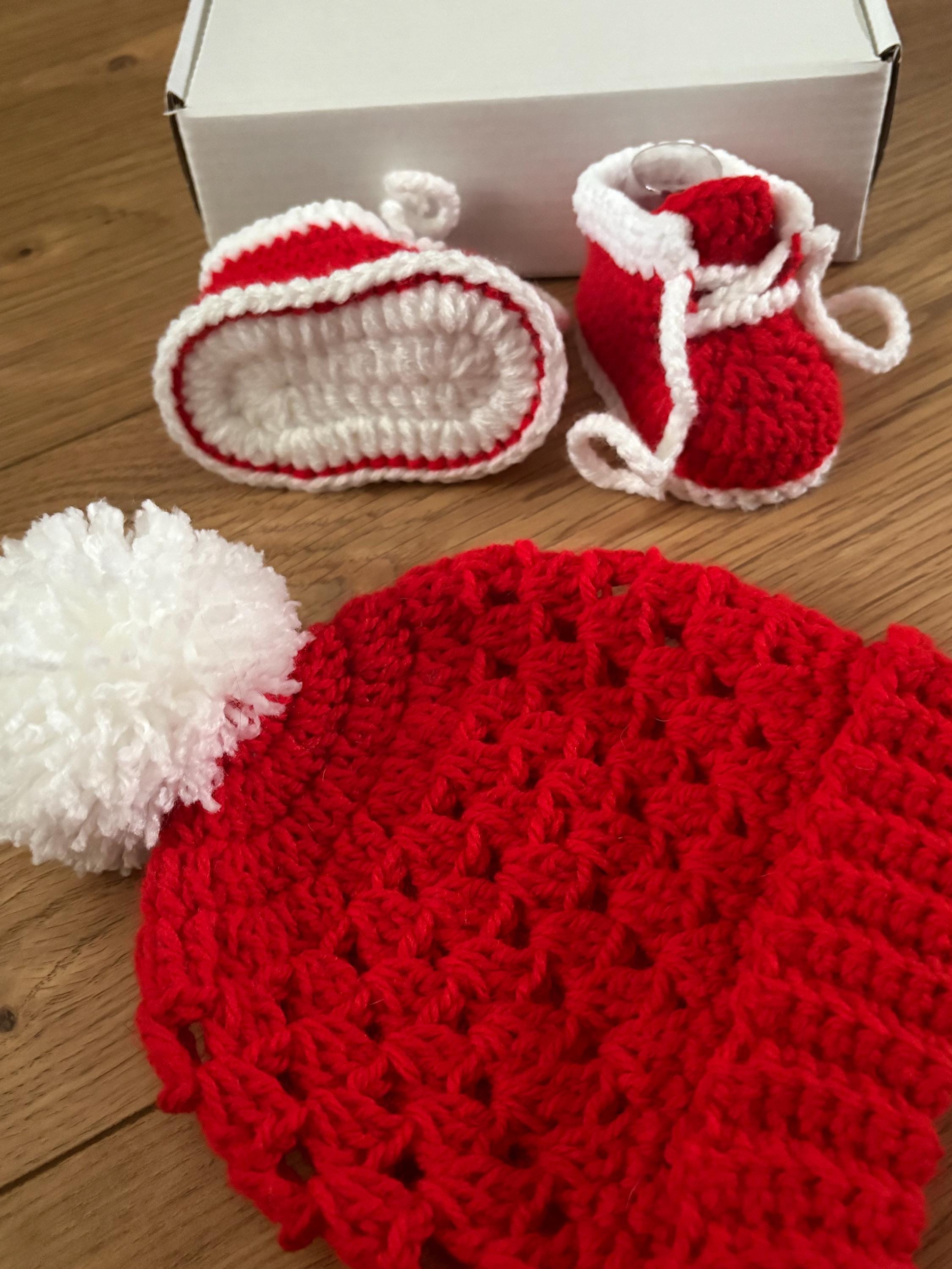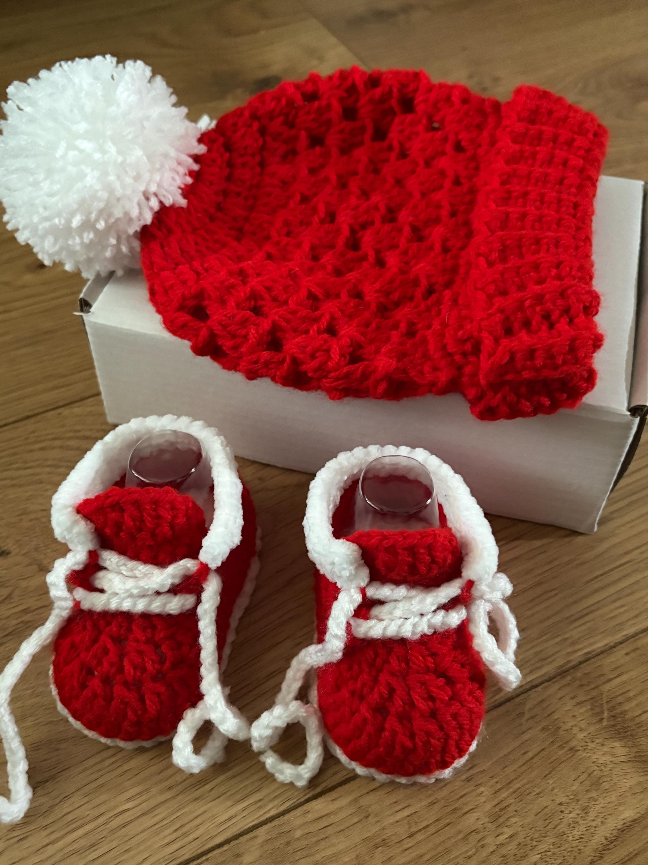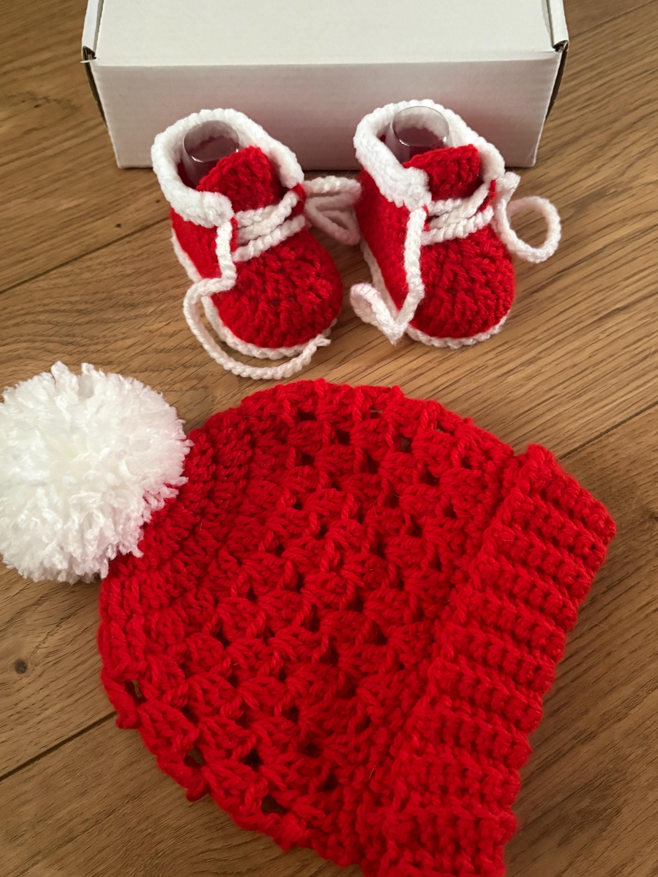 This adorable crochet set includes a comfy classic granny stitch hat with ribbed fold up edging and pom pom. The matching booties are complete with handmade laces and soft chenille yarn trim. The rest of the project is crafted using soft acrylic yarn in red and white to bring some festive cheer to your little one’s wardrobe. Complementary inserts included for the booties to maintain perfect shape after washing. Machine wash up to 40 degrees. Set is suitable for babies 0-3 months.