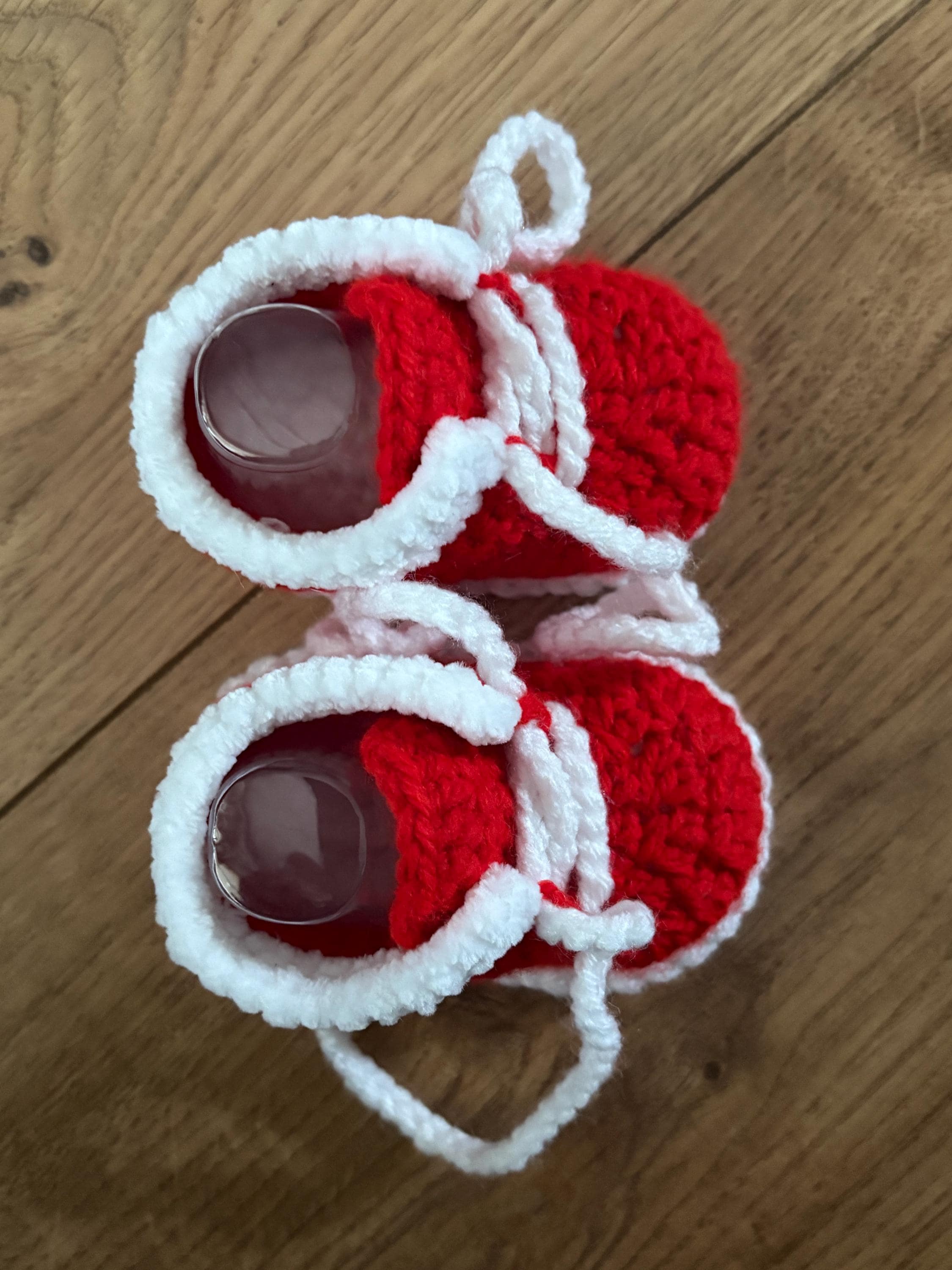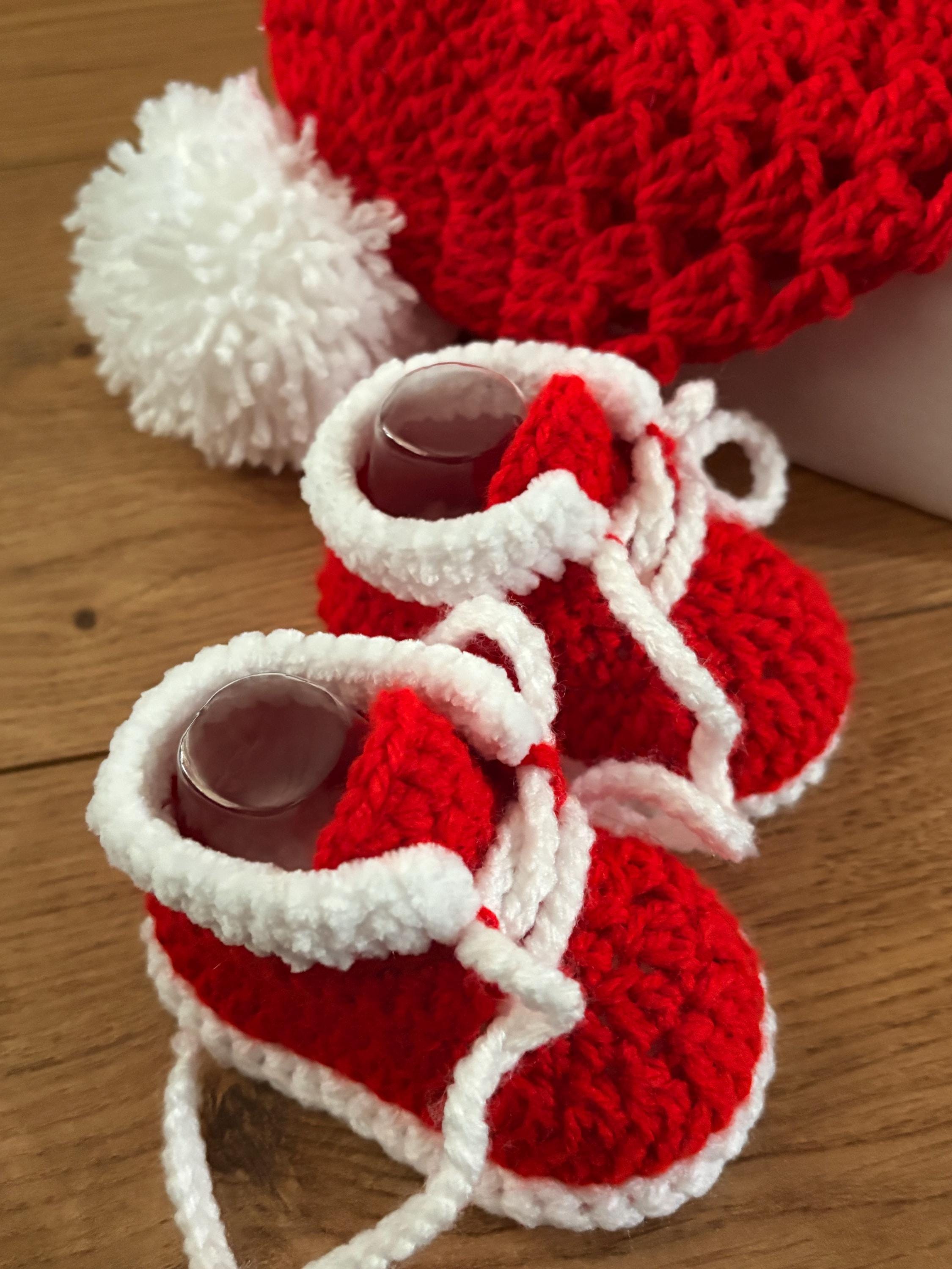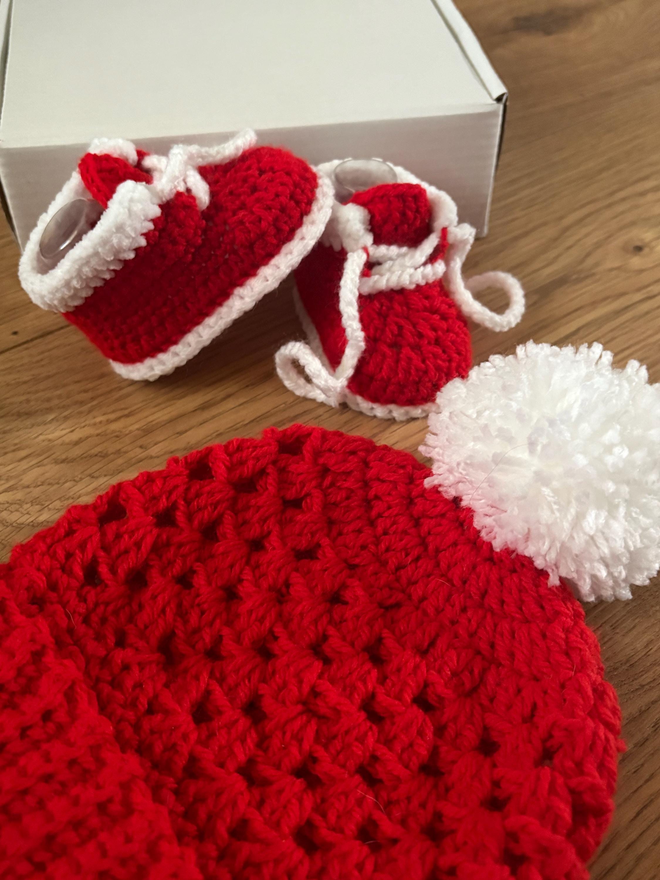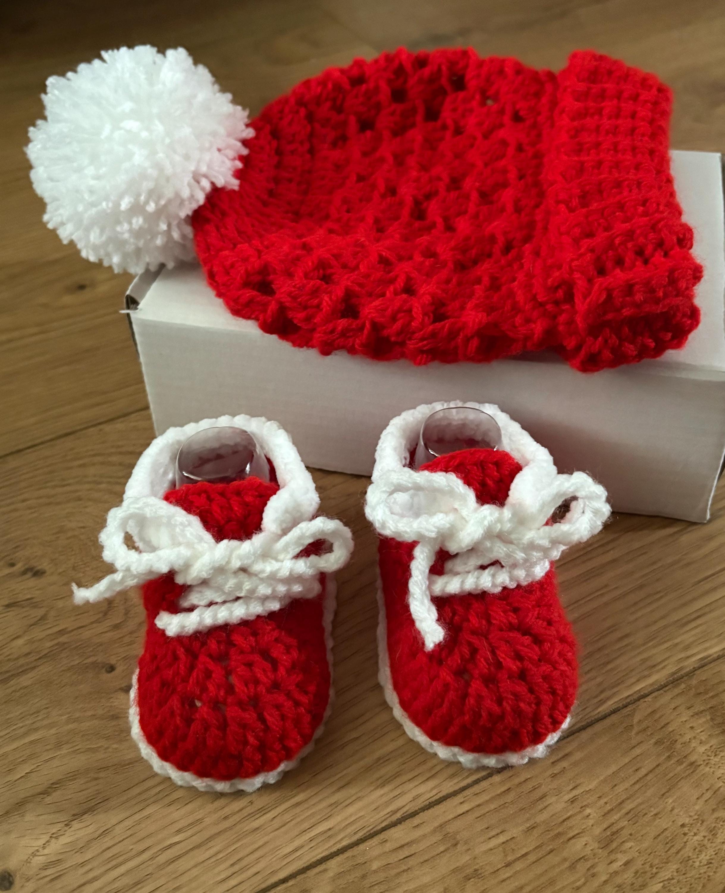 This adorable crochet set includes a comfy classic granny stitch hat with ribbed fold up edging and pom pom. The matching booties are complete with handmade laces and soft chenille yarn trim. The rest of the project is crafted using soft acrylic yarn in red and white to bring some festive cheer to your little one’s wardrobe. Complementary inserts included for the booties to maintain perfect shape after washing. Machine wash up to 40 degrees. Set is suitable for babies 0-3 months.