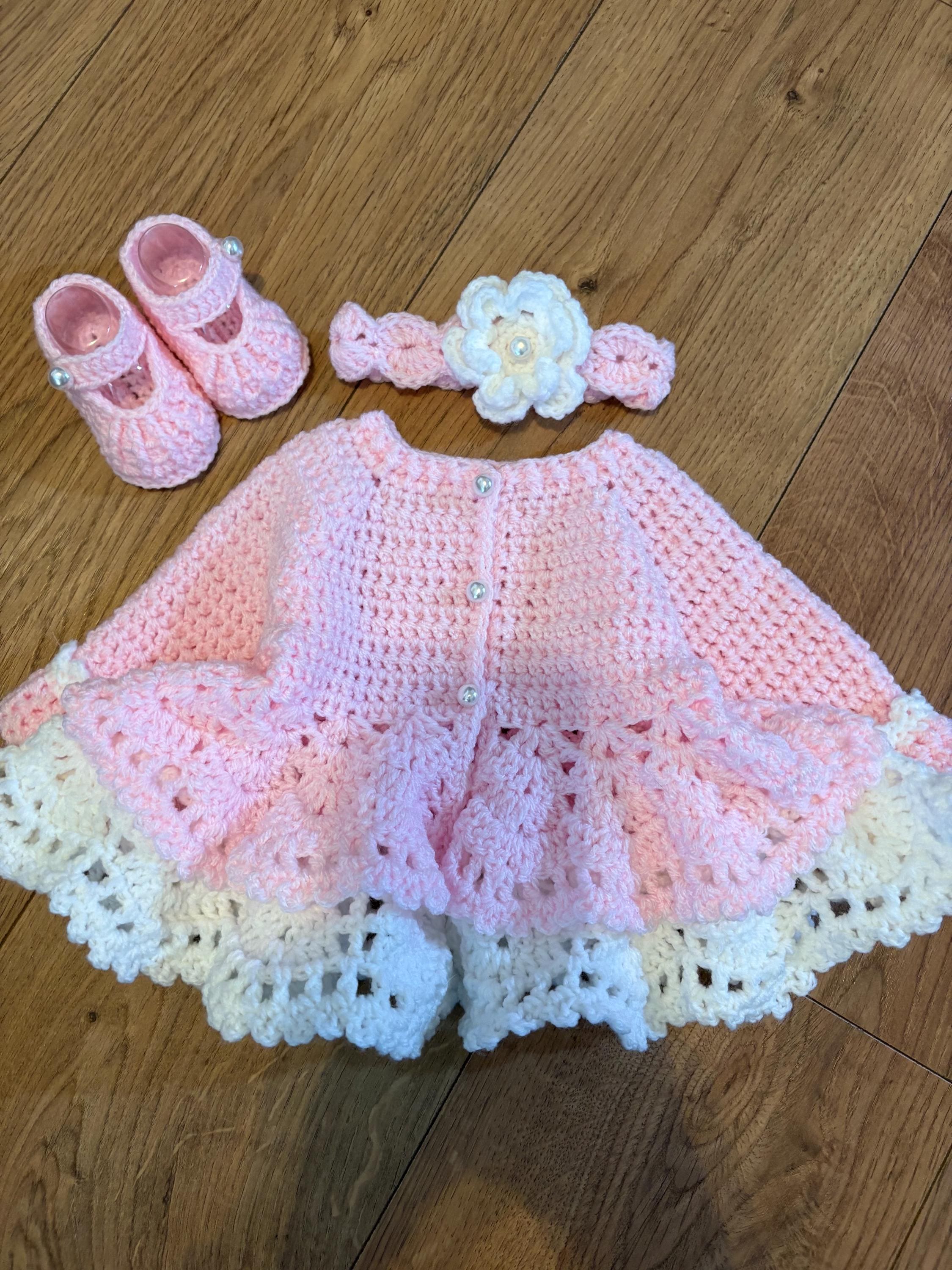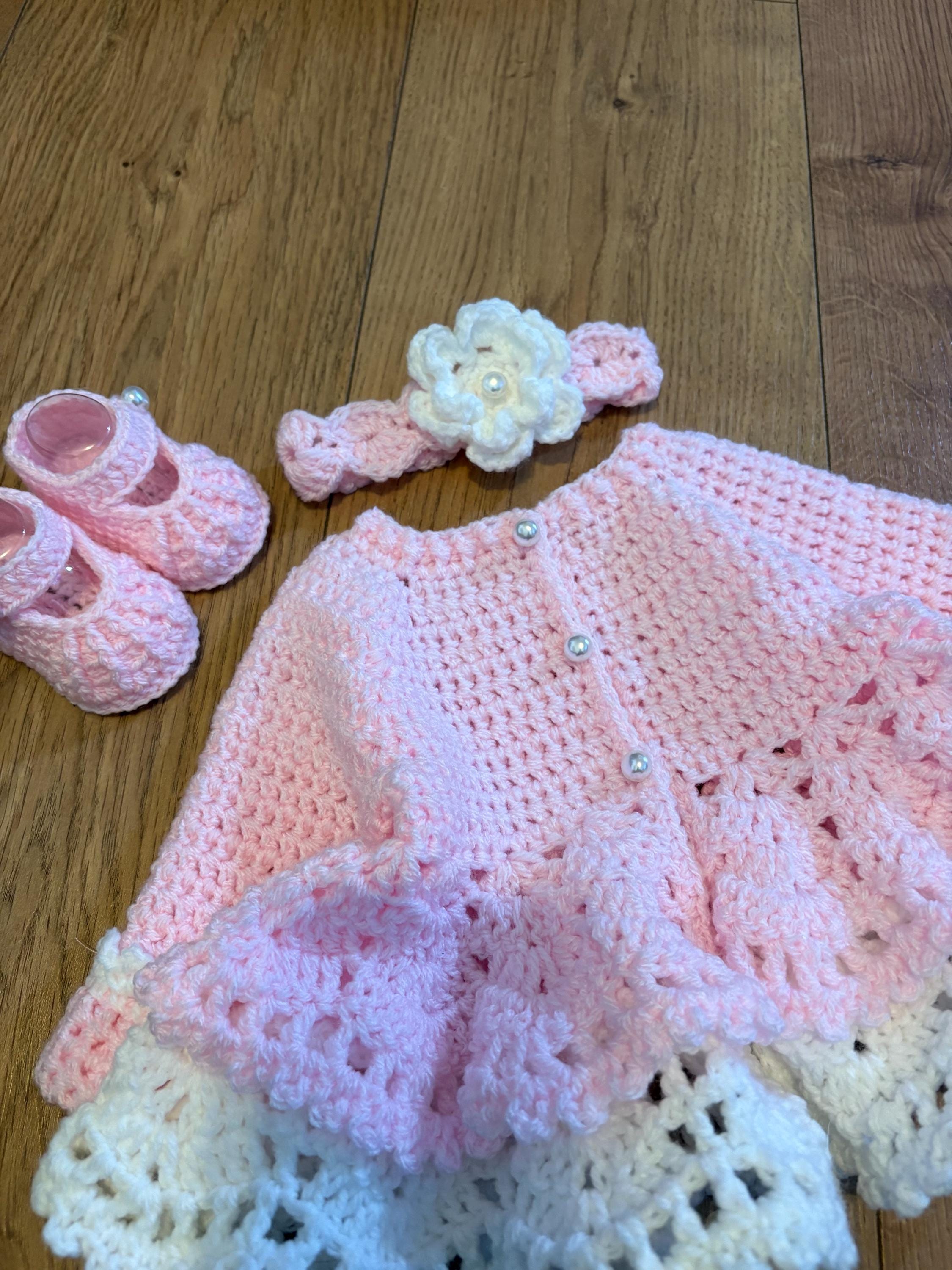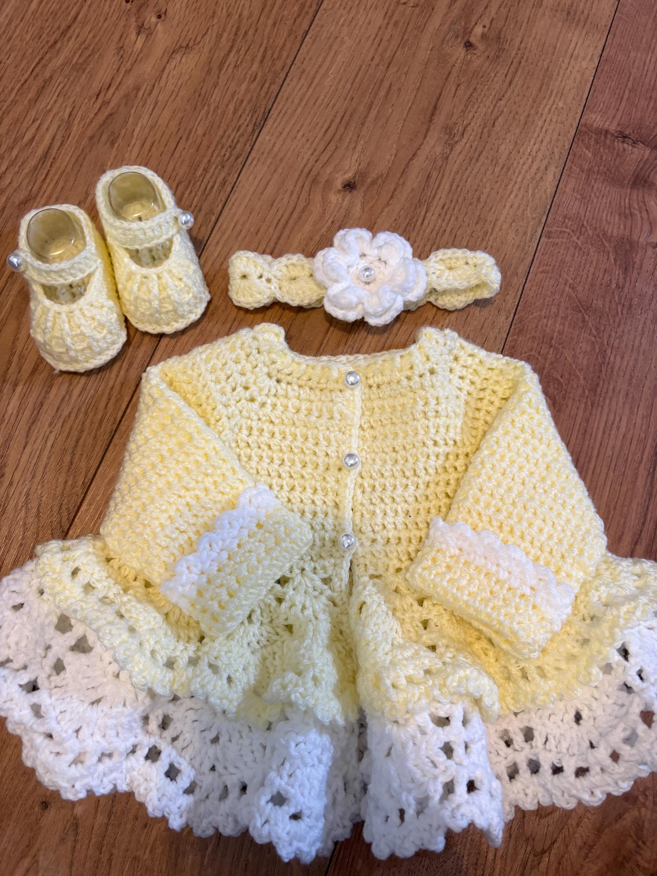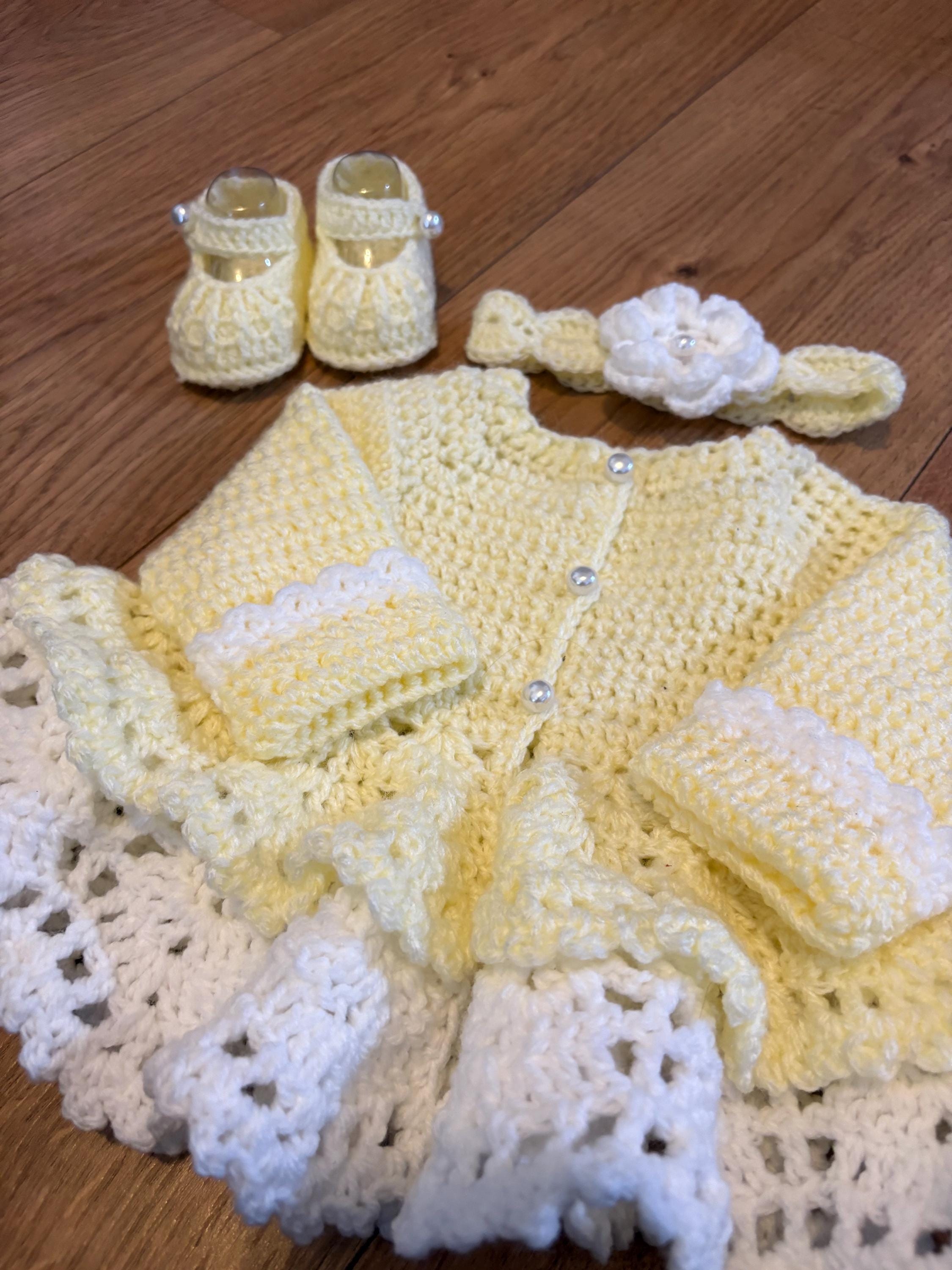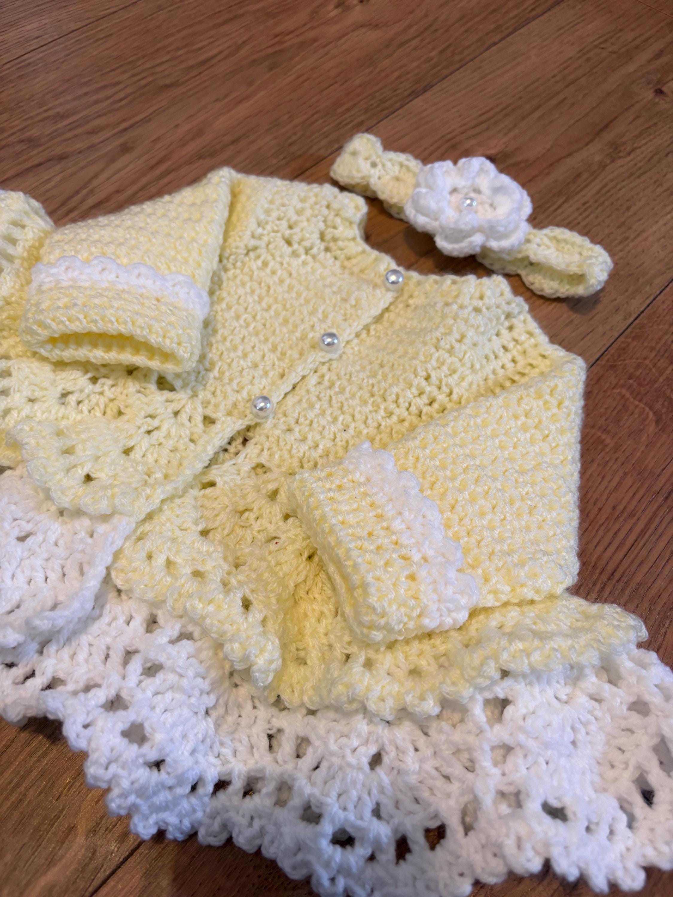 Handmade newborn pink or lemon and white cardigan with layered lace design skirt at the waist and faux pearl buttons. Roll up sleeve design means length can be adjusted. Matching crochet flower headband and Mary Jane shoes included. Shoes are supplied with inset to maintain perfect shape after washing. All items can be machine washed at 40 degrees.