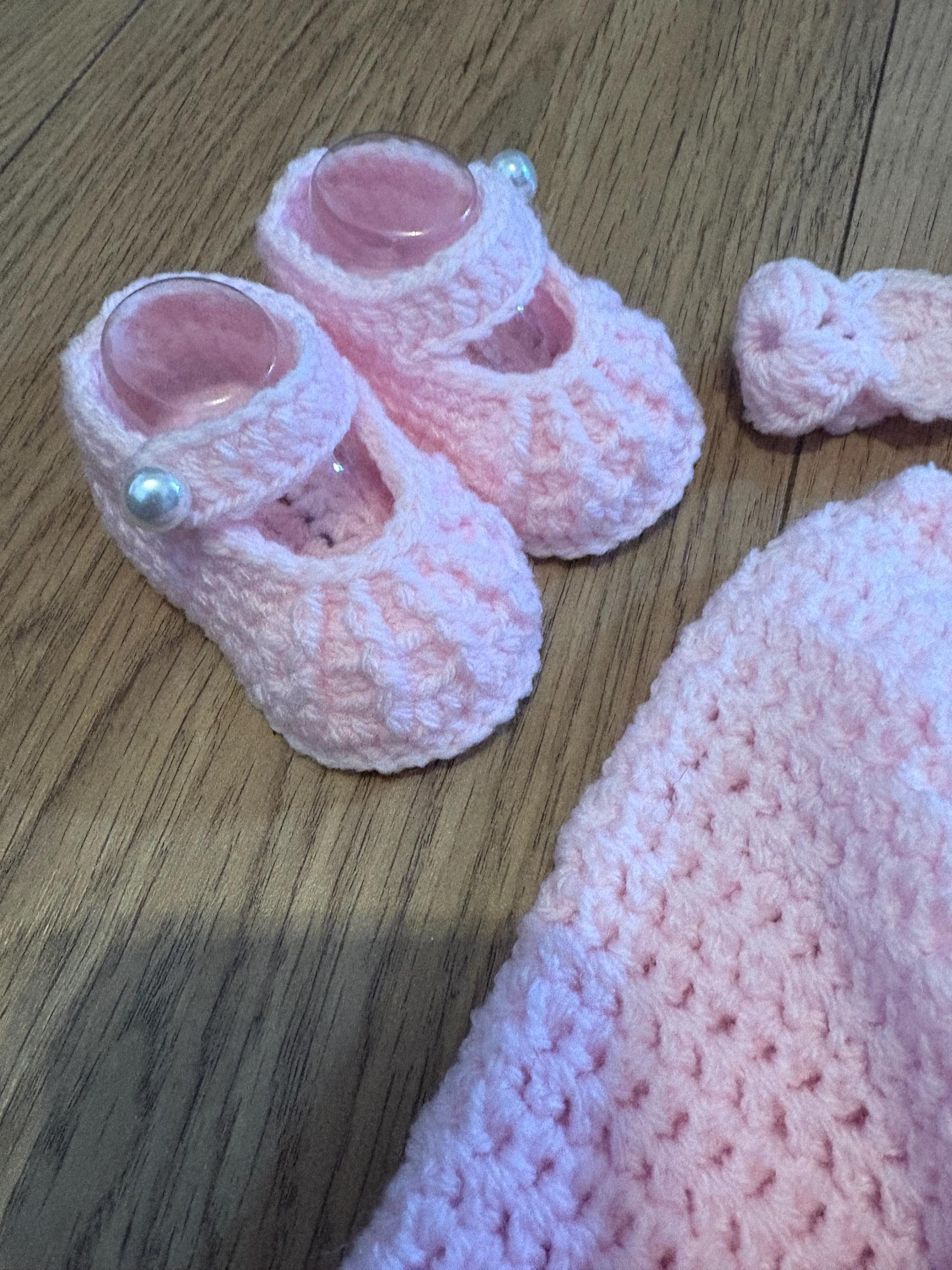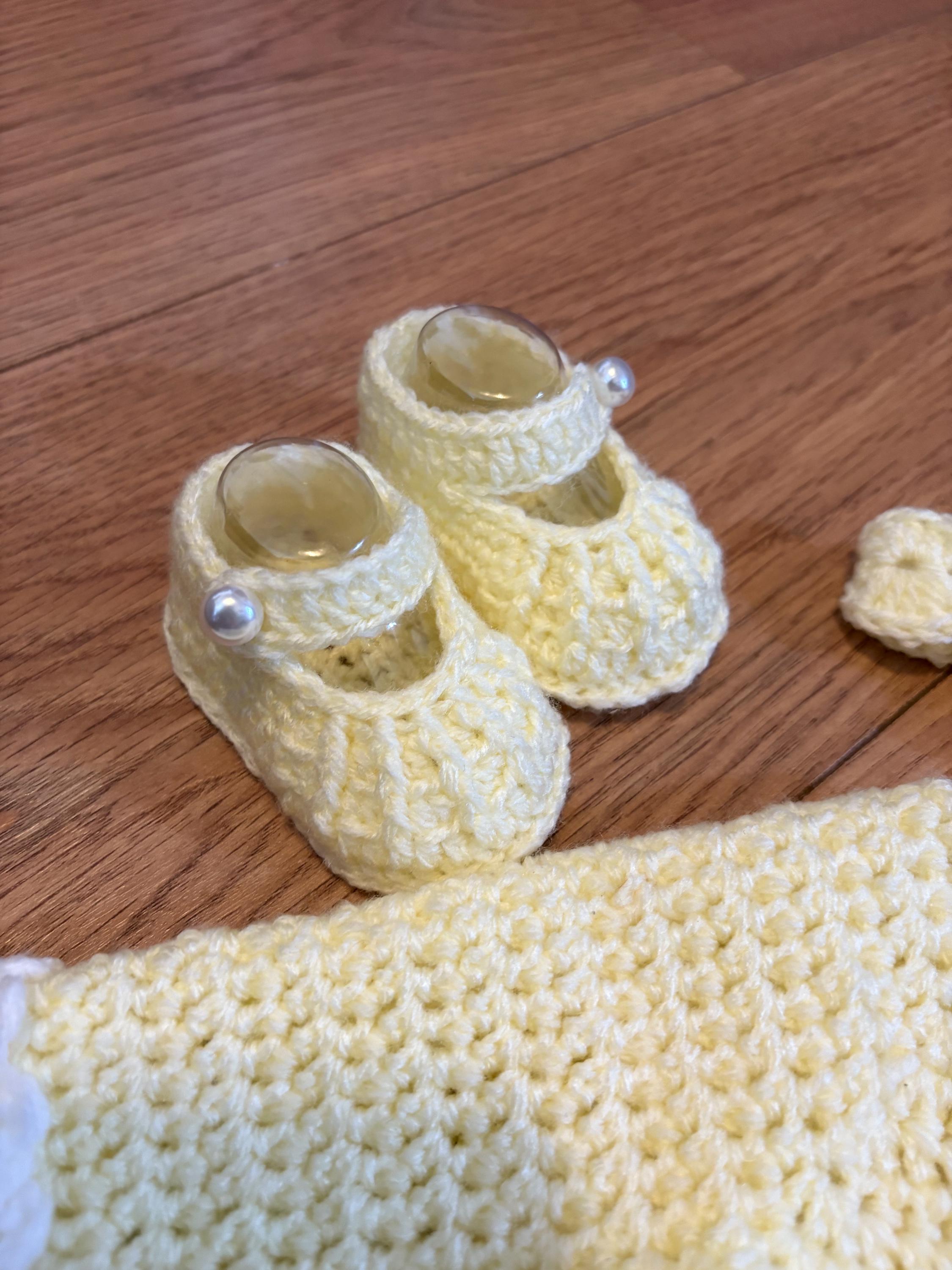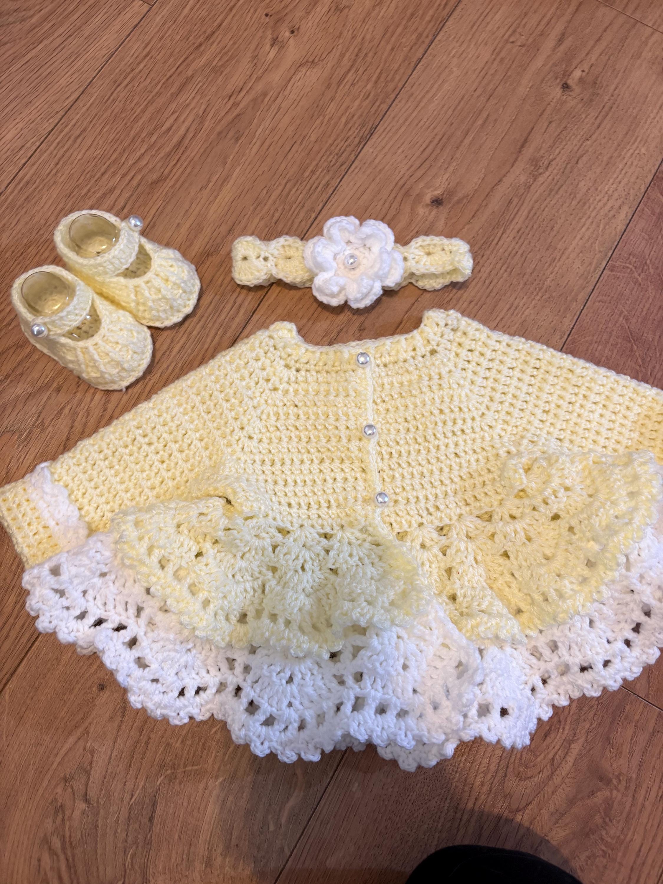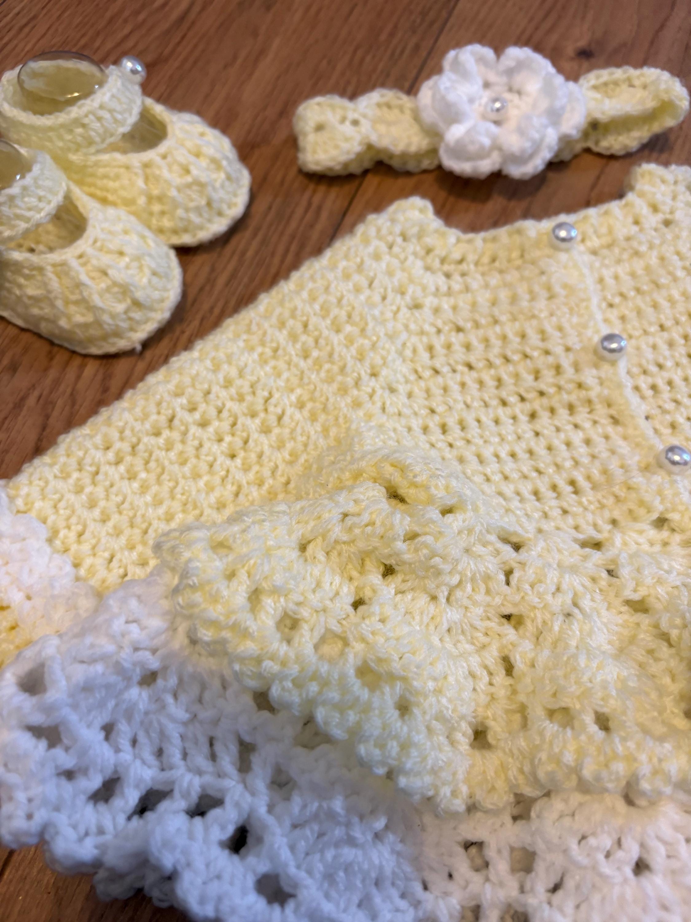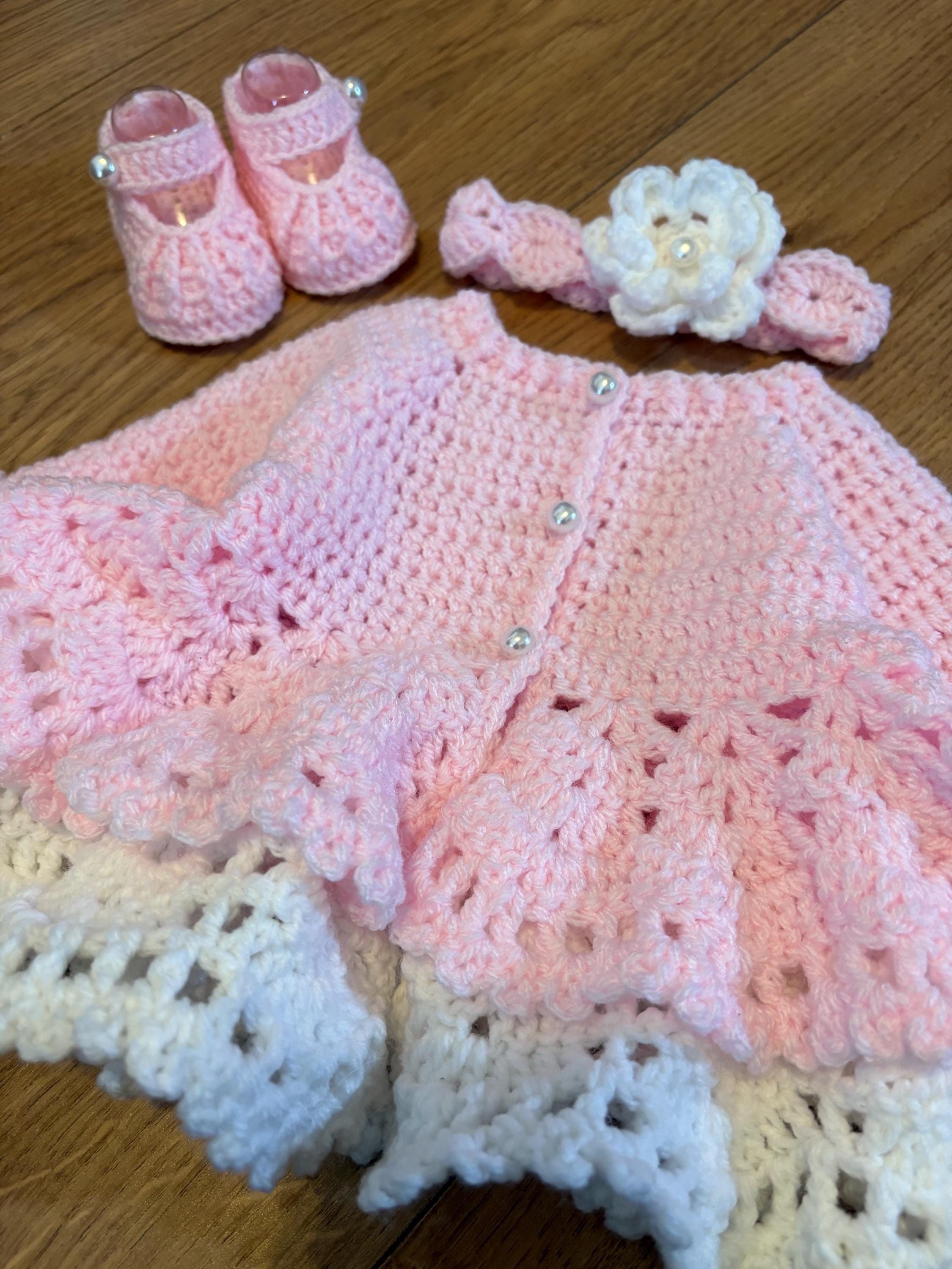 Handmade newborn pink or lemon and white cardigan with layered lace design skirt at the waist and faux pearl buttons. Roll up sleeve design means length can be adjusted. Matching crochet flower headband and Mary Jane shoes included. Shoes are supplied with inset to maintain perfect shape after washing. All items can be machine washed at 40 degrees.