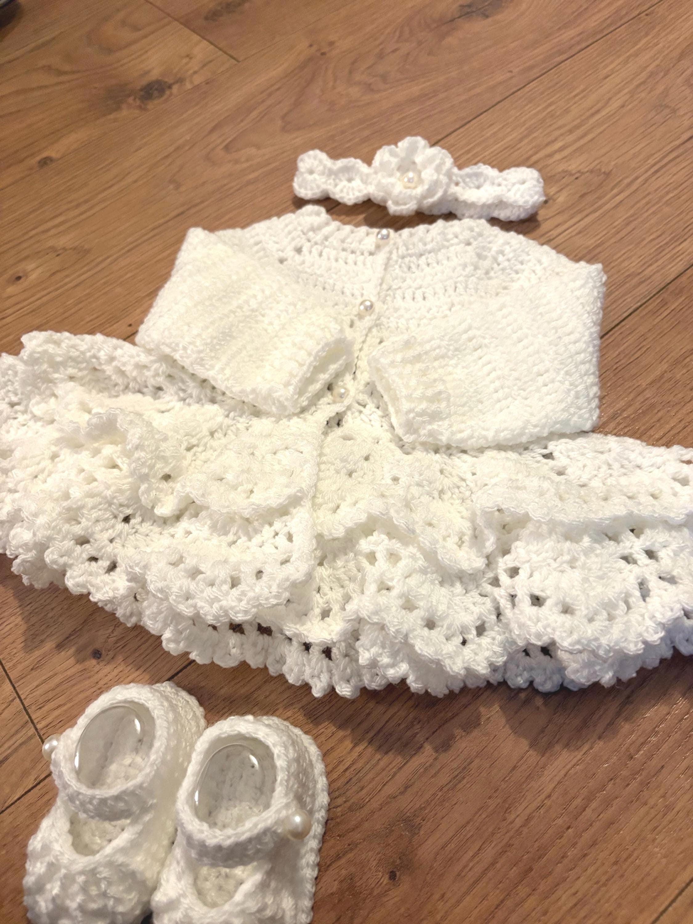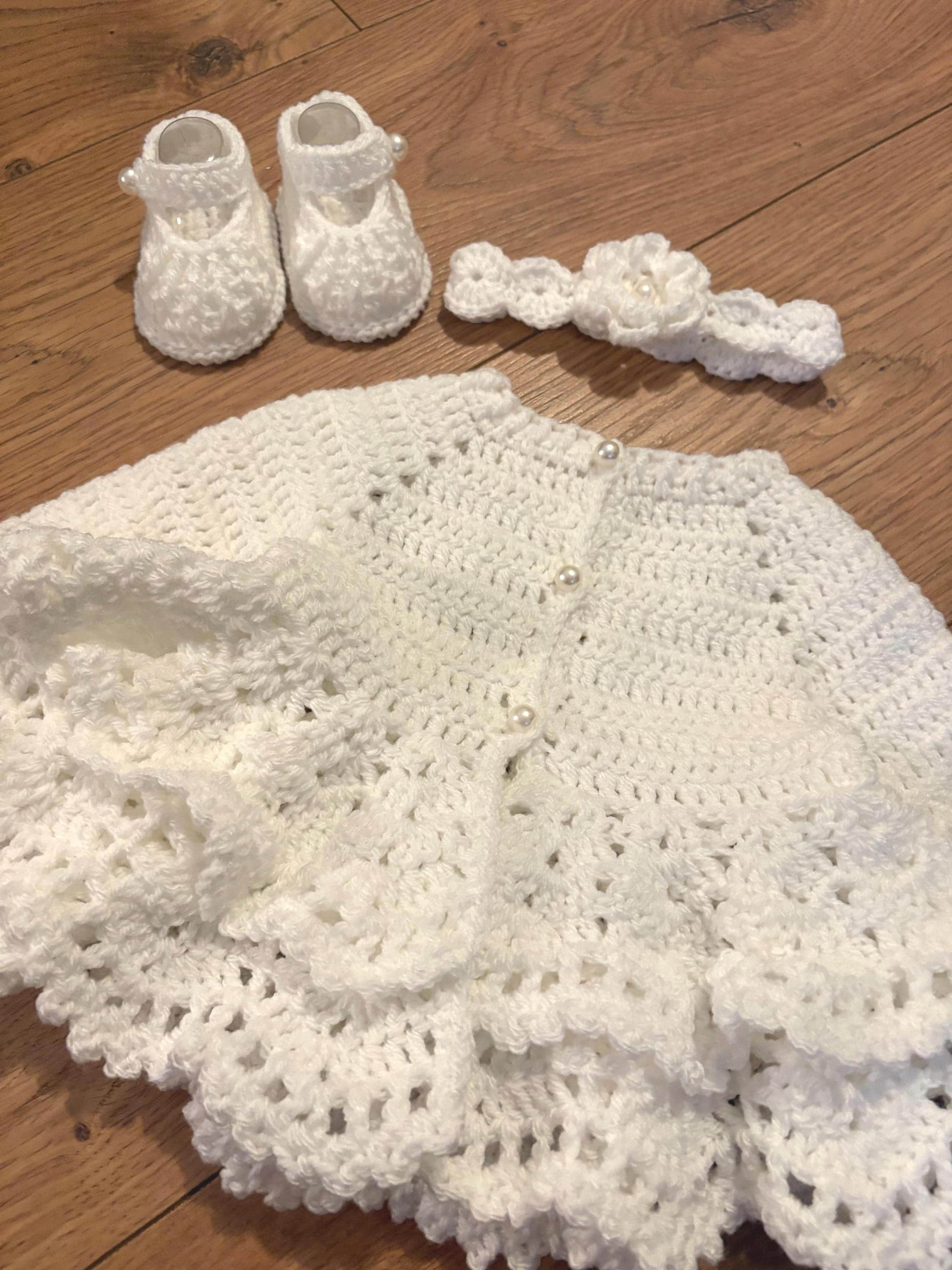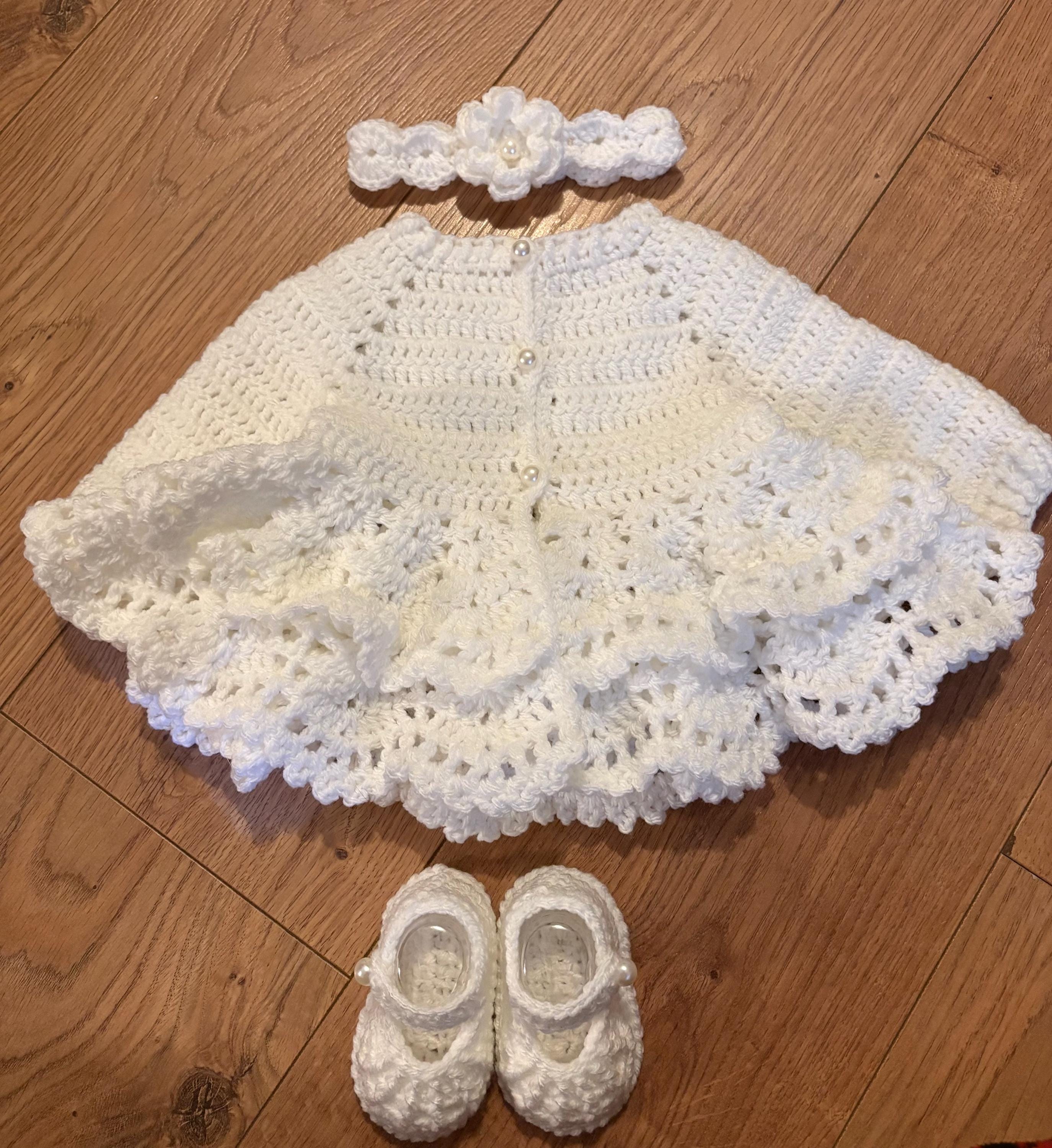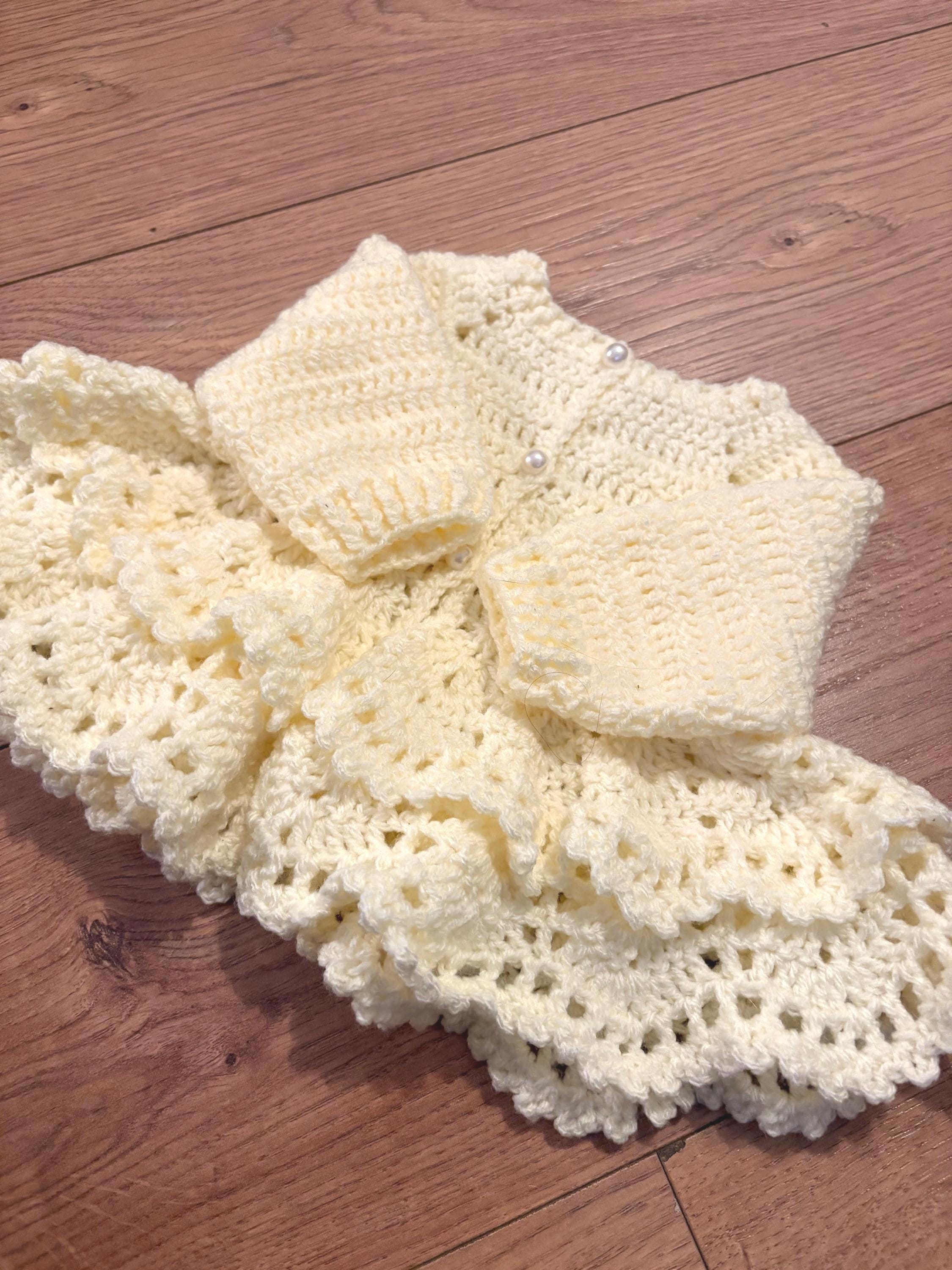 Handmade crochet set includes beautiful baby cardigan with lace stitch layered skirt and faux pearl button closure, matching headband with crochet flower and faux pearl embellishment and Mary Jane style crochet shoes 8cm, also with matching faux pearl closure. Shoes arrive complete with insert to maintain perfect shape after washing. Set is crafted using soft acrylic yarn in classic white or lemon colour and can be machine washed at 40 degrees centigrade and tumble dried on a low heat.