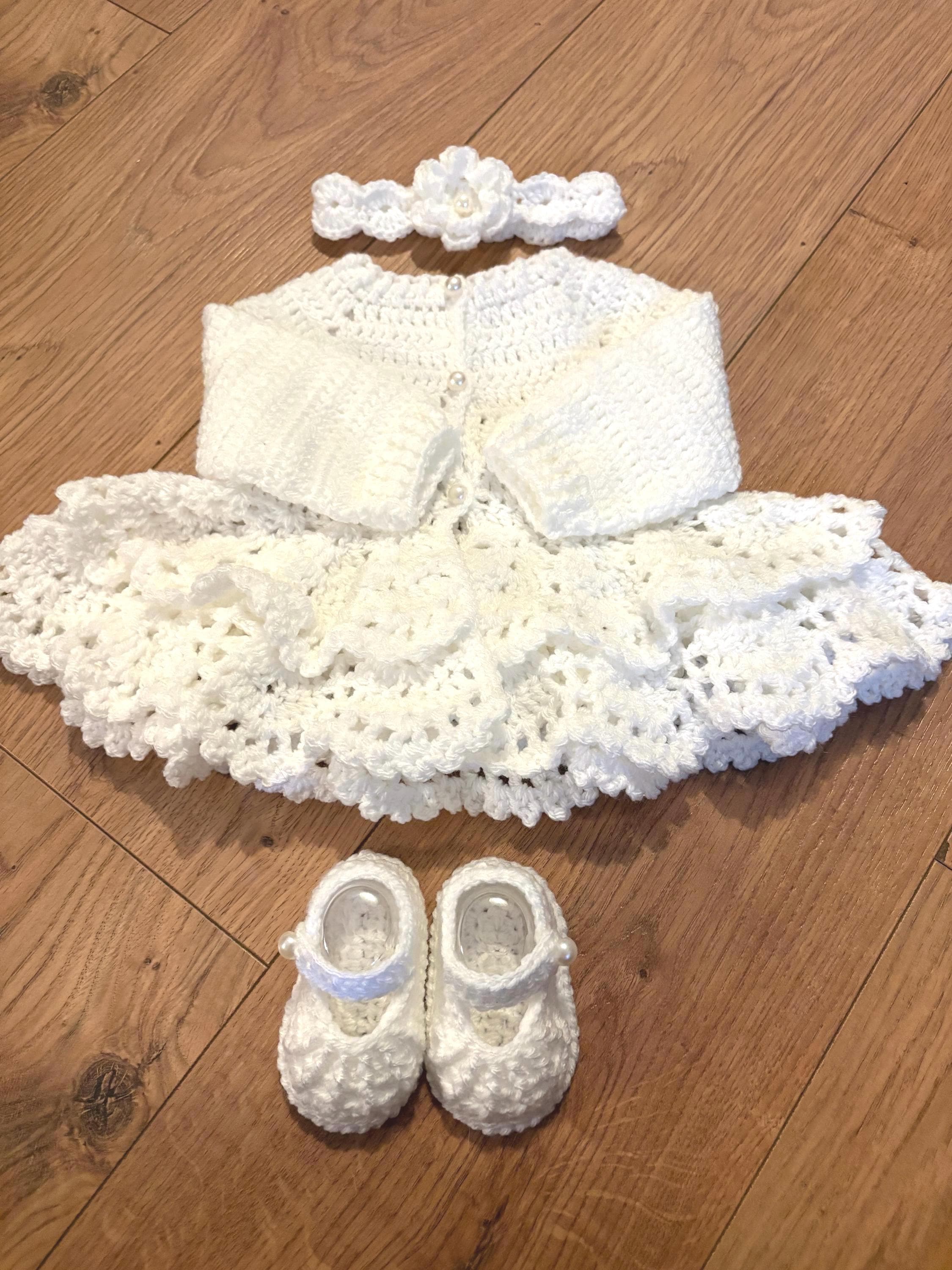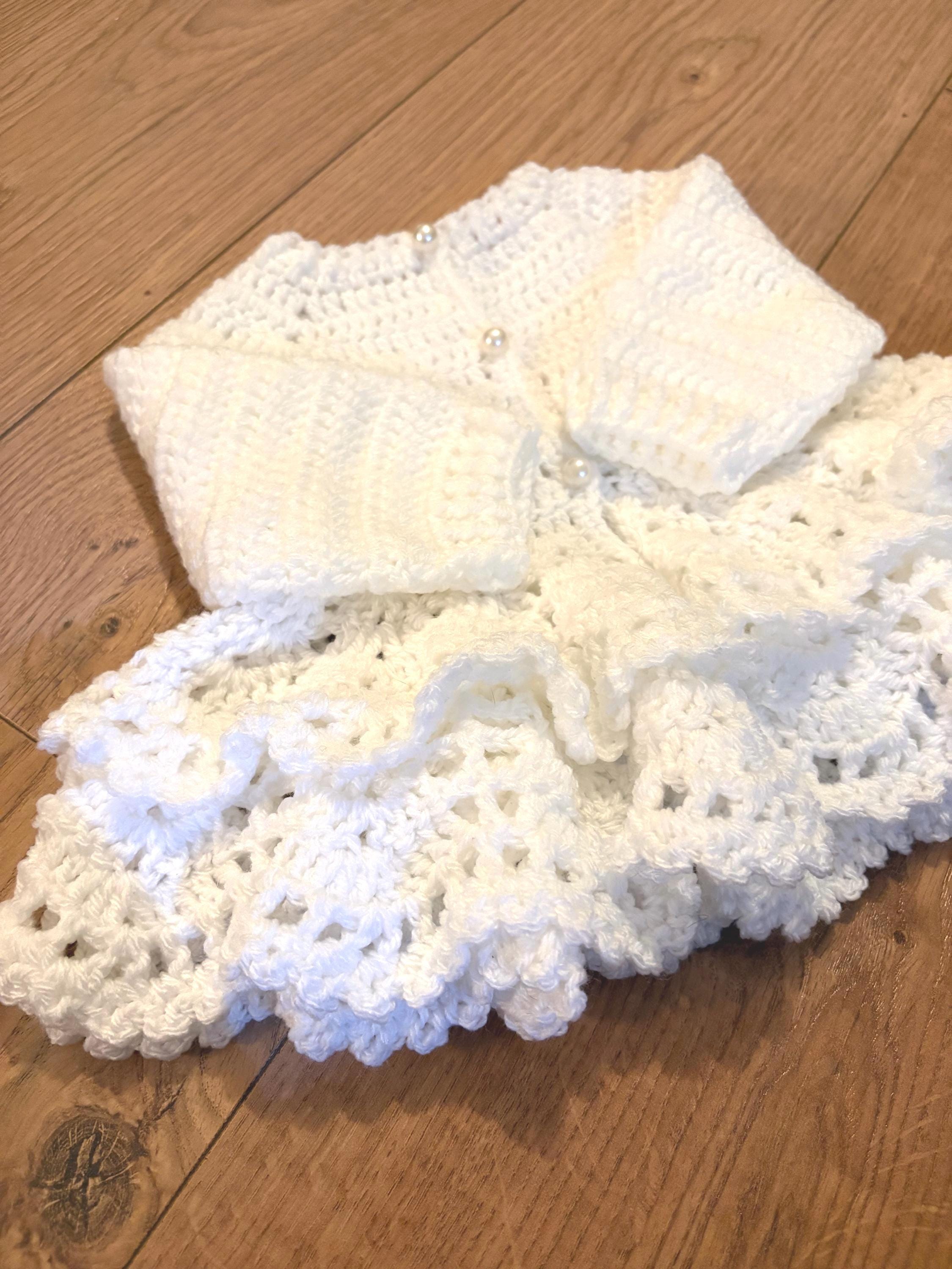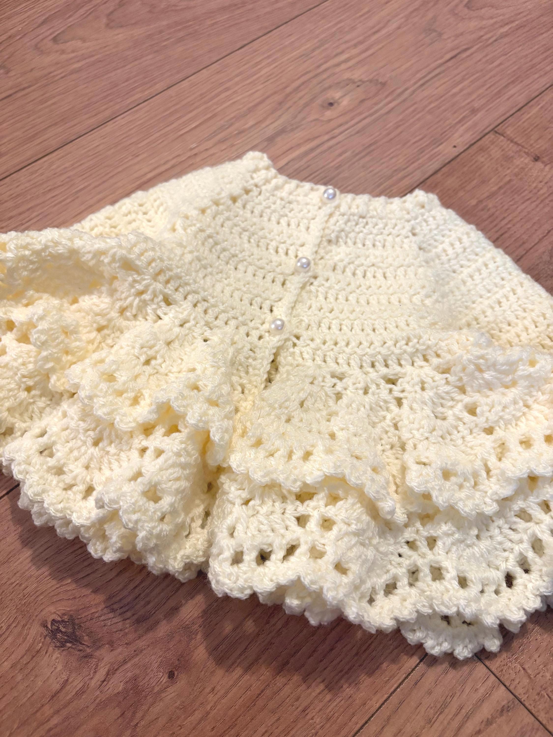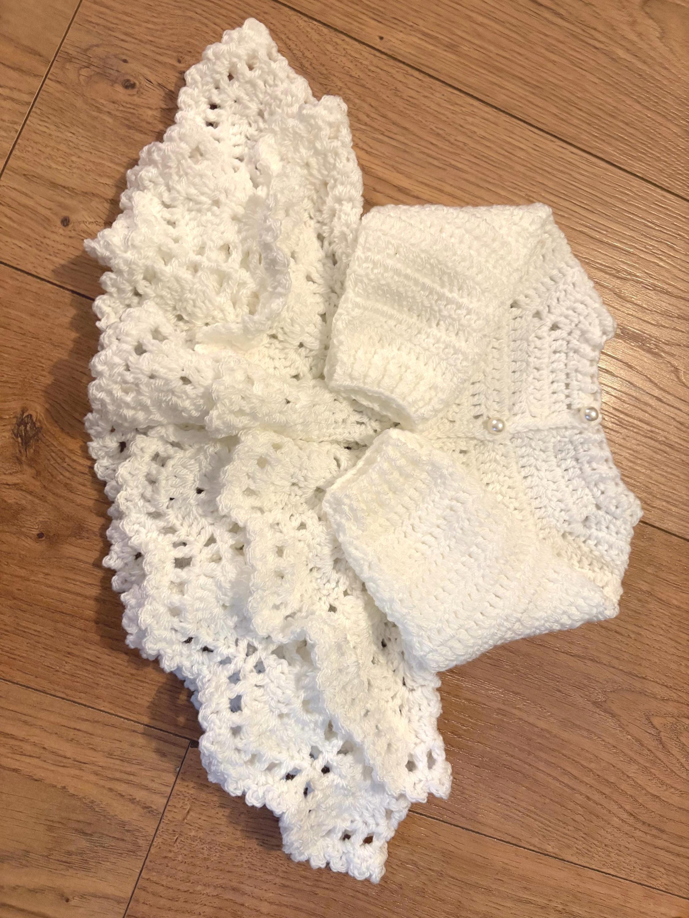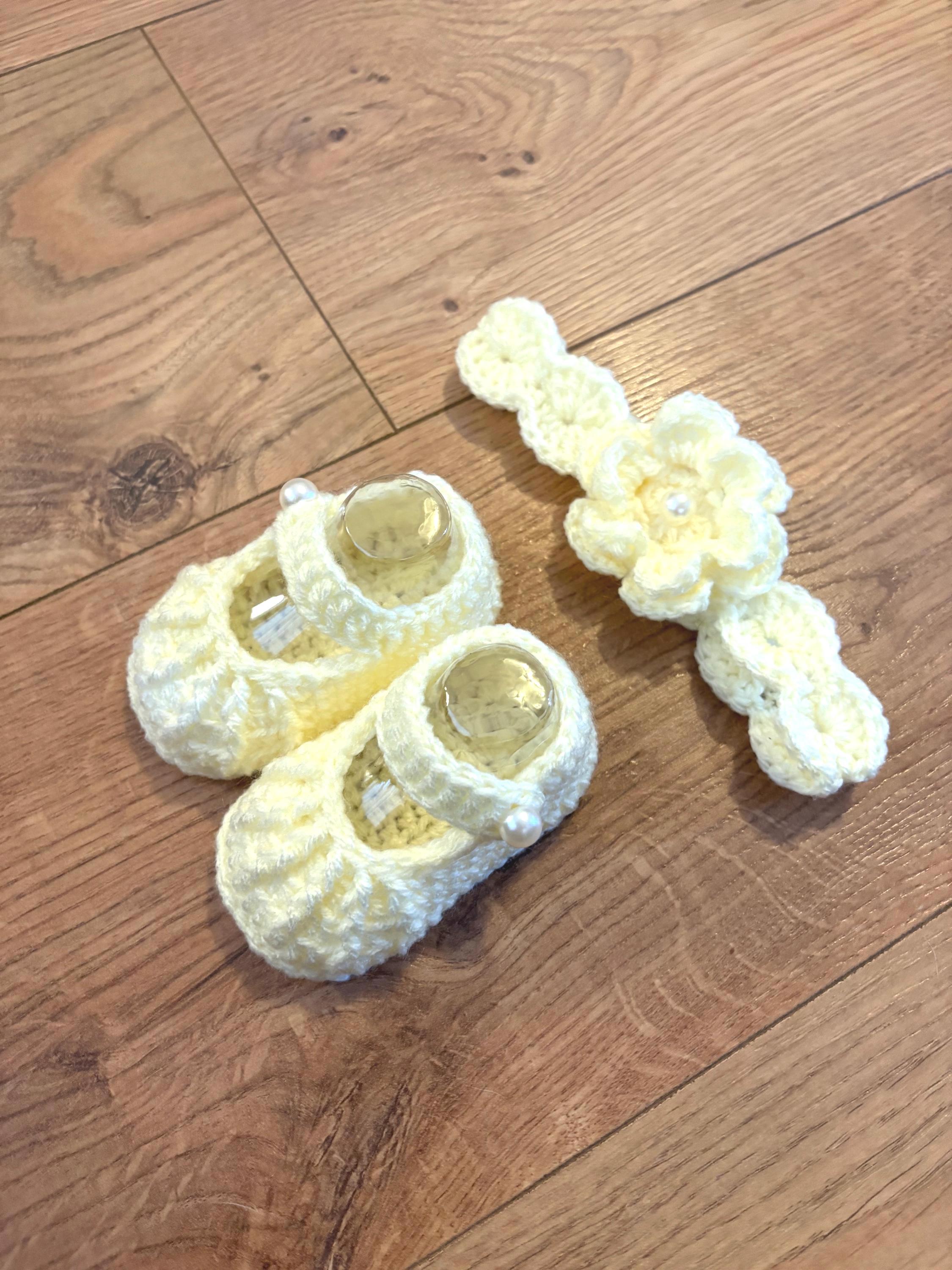Handmade crochet set includes beautiful baby cardigan with lace stitch layered skirt and faux pearl button closure, matching headband with crochet flower and faux pearl embellishment and Mary Jane style crochet shoes 8cm, also with matching faux pearl closure. Shoes arrive complete with insert to maintain perfect shape after washing. Set is crafted using soft acrylic yarn in classic white or lemon colour and can be machine washed at 40 degrees centigrade and tumble dried on a low heat.