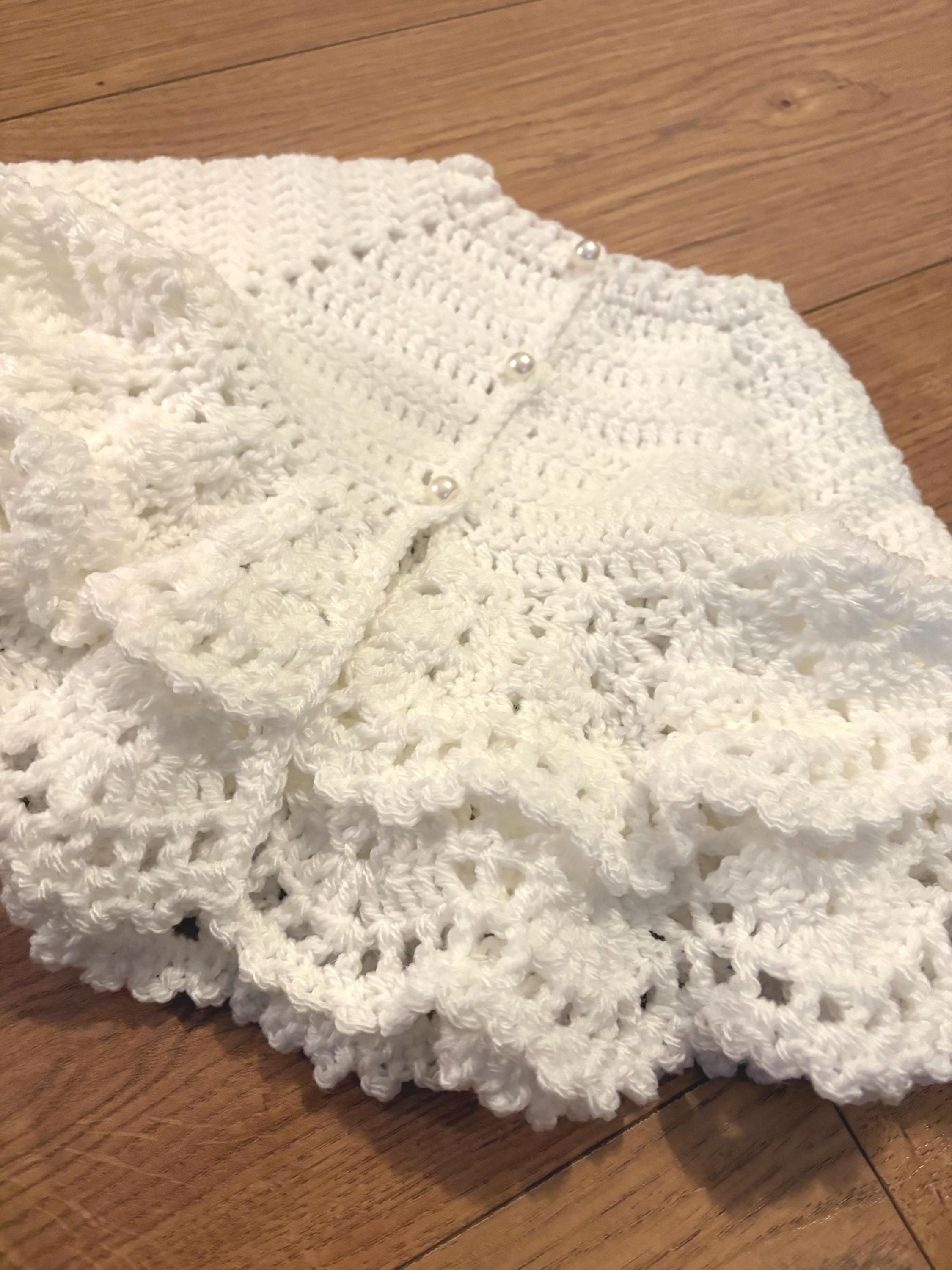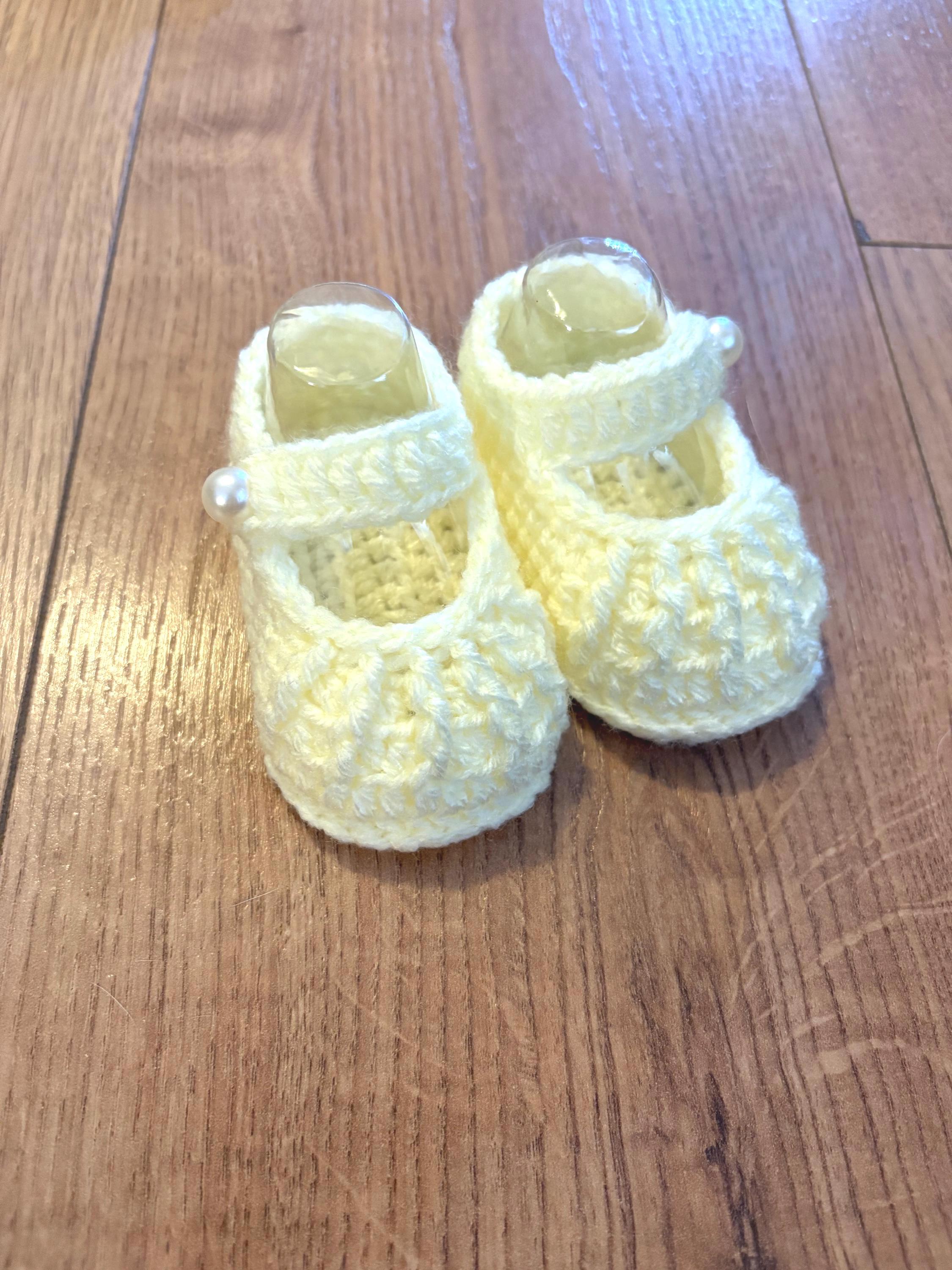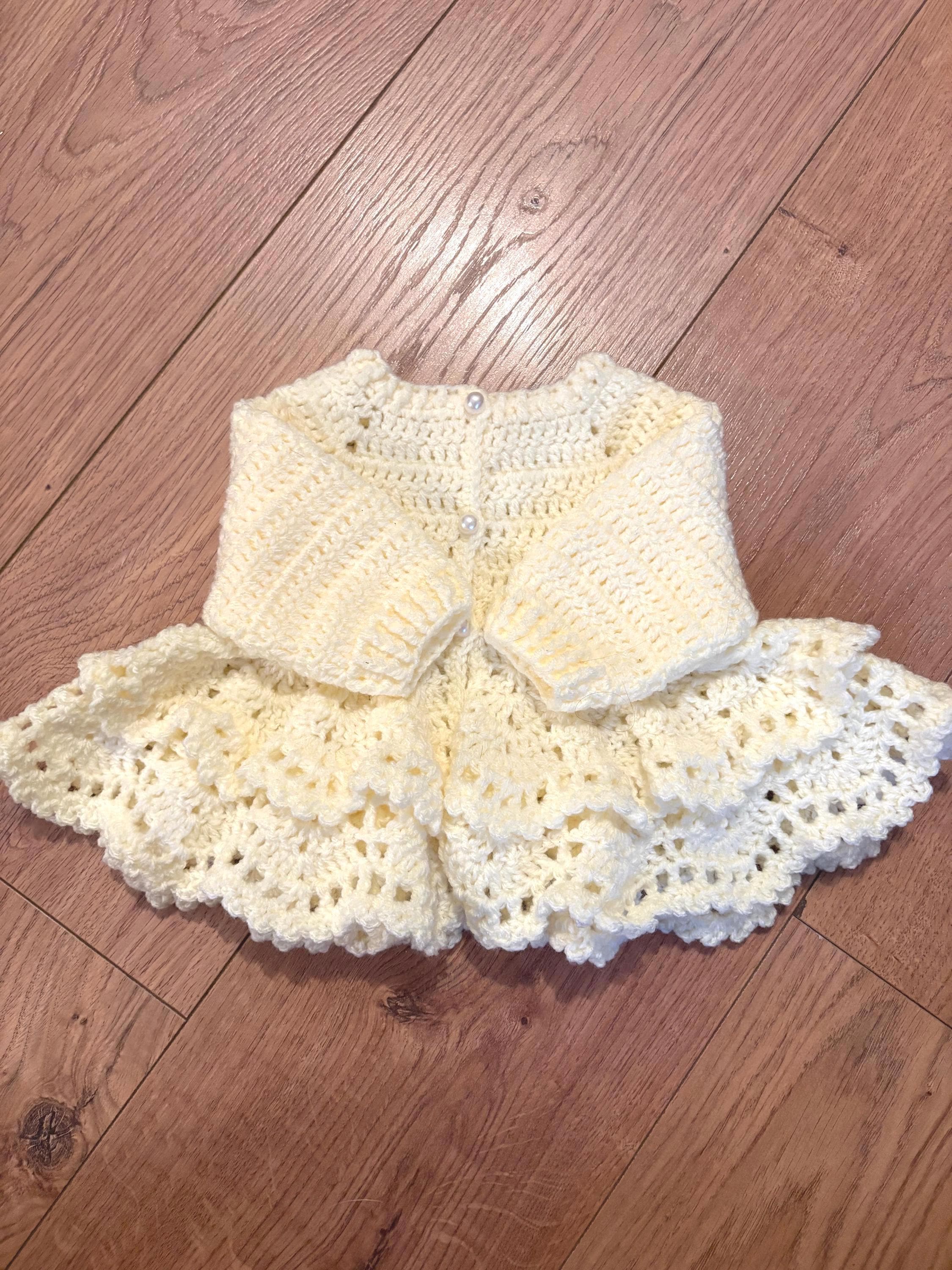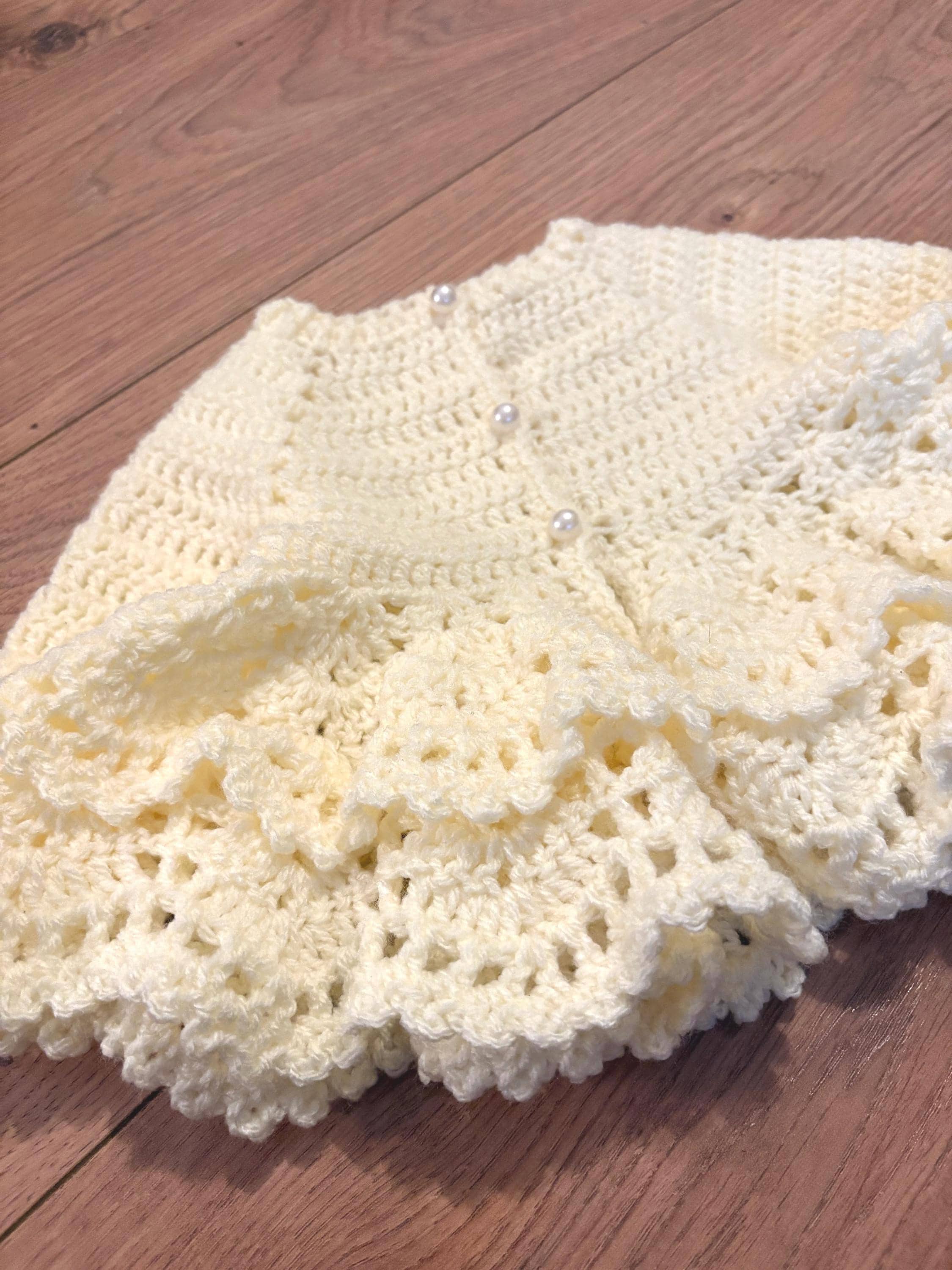 Handmade crochet set includes beautiful baby cardigan with lace stitch layered skirt and faux pearl button closure, matching headband with crochet flower and faux pearl embellishment and Mary Jane style crochet shoes 8cm, also with matching faux pearl closure. Shoes arrive complete with insert to maintain perfect shape after washing. Set is crafted using soft acrylic yarn in classic white or lemon colour and can be machine washed at 40 degrees centigrade and tumble dried on a low heat.