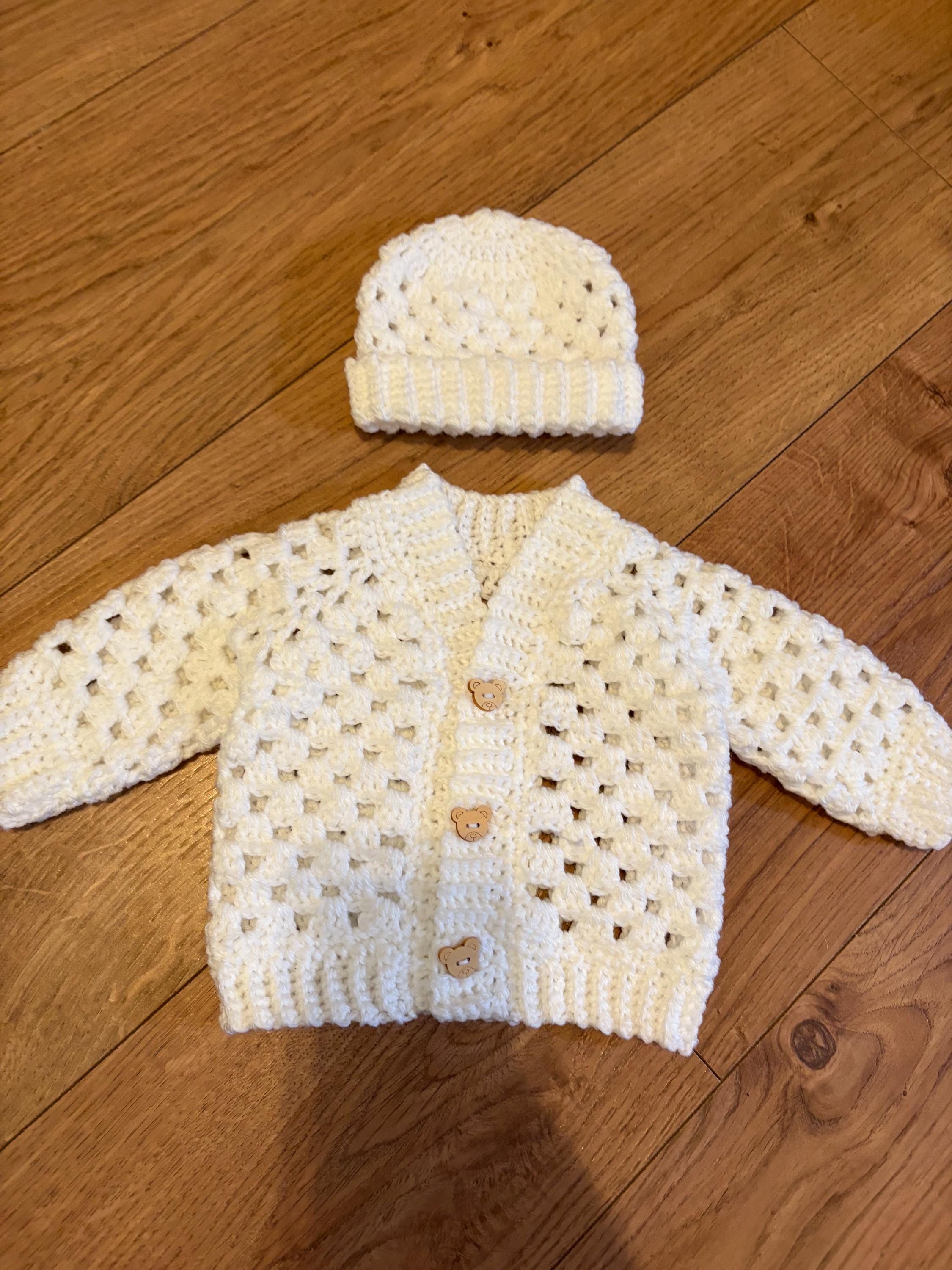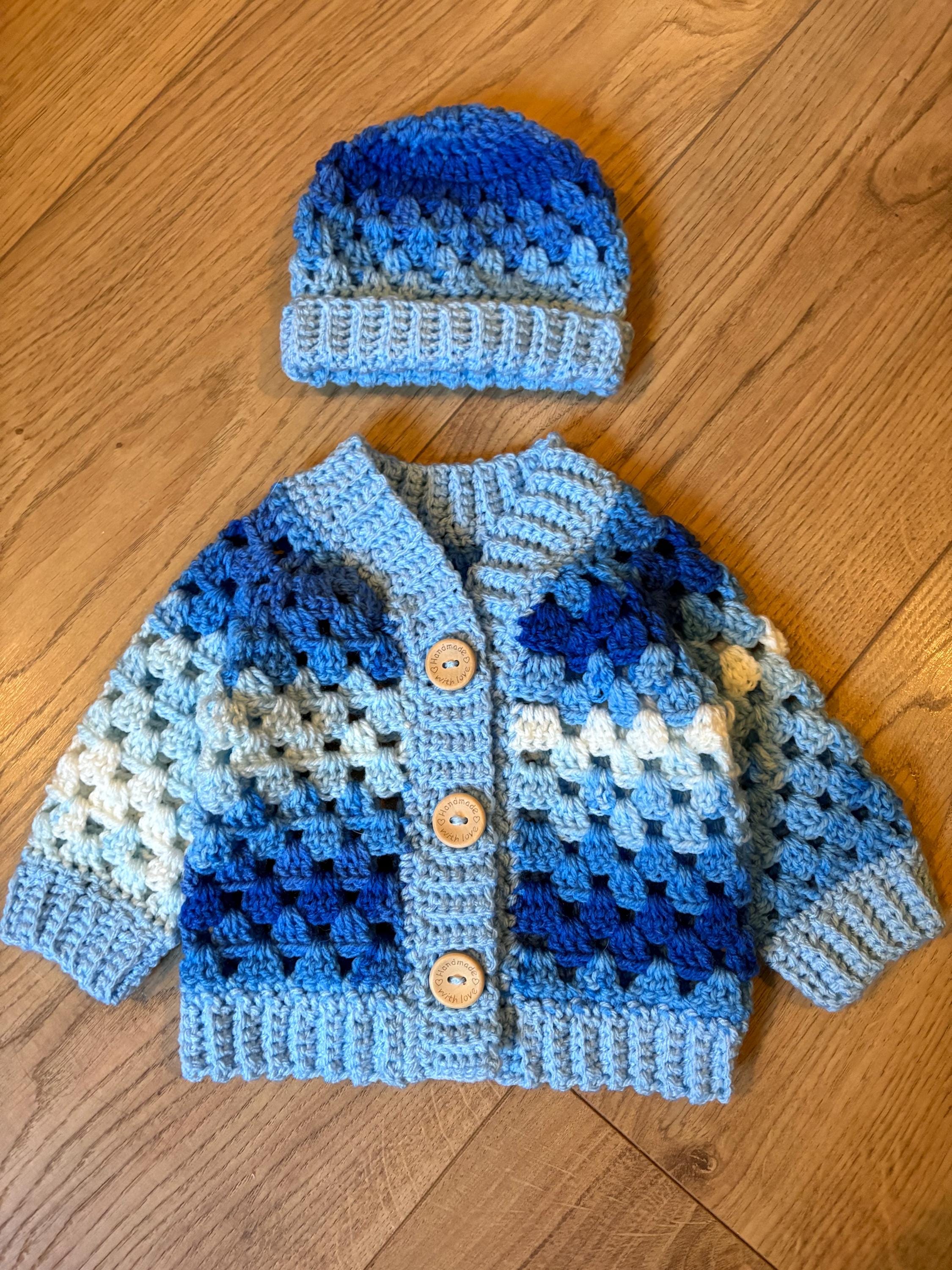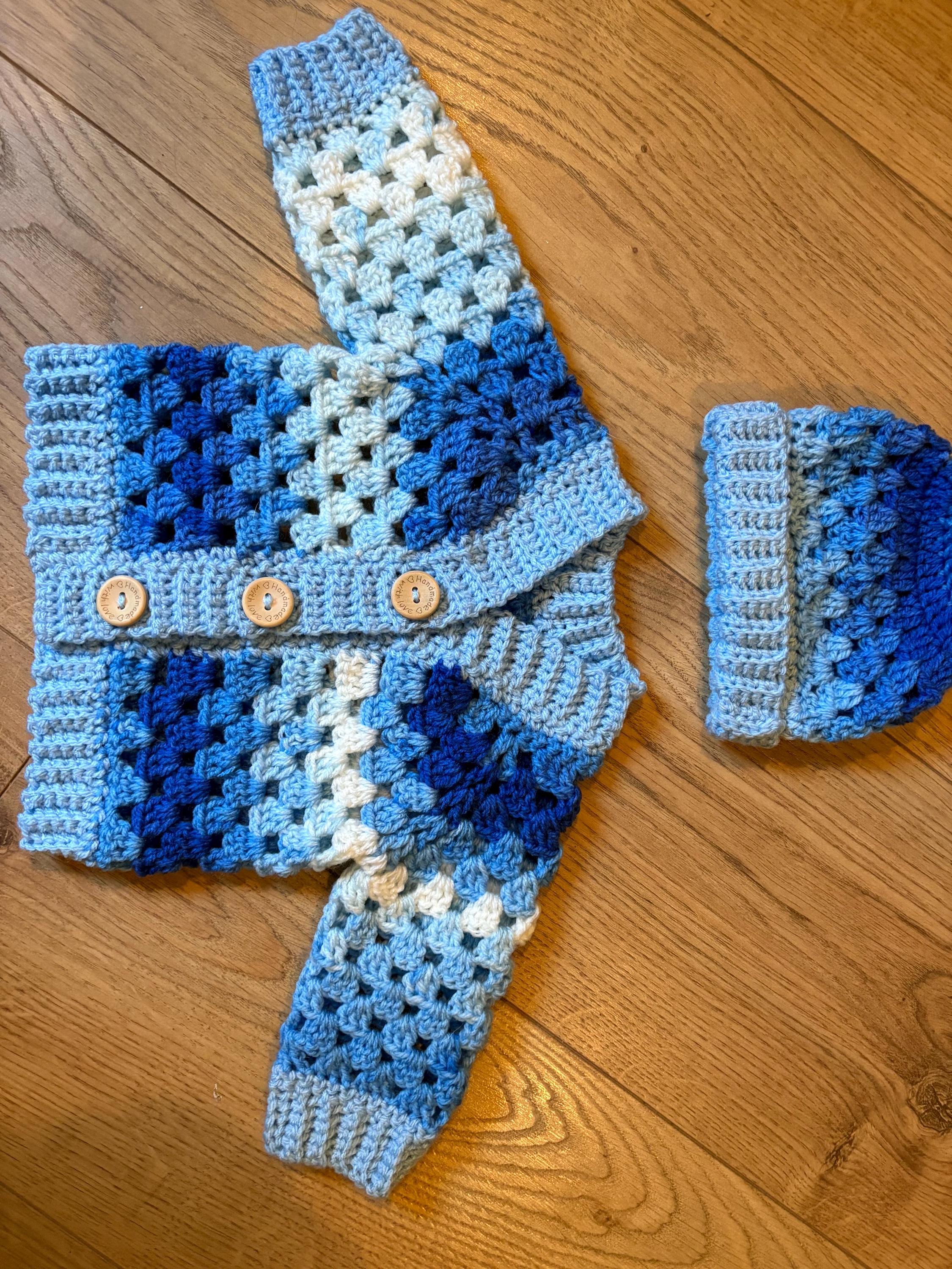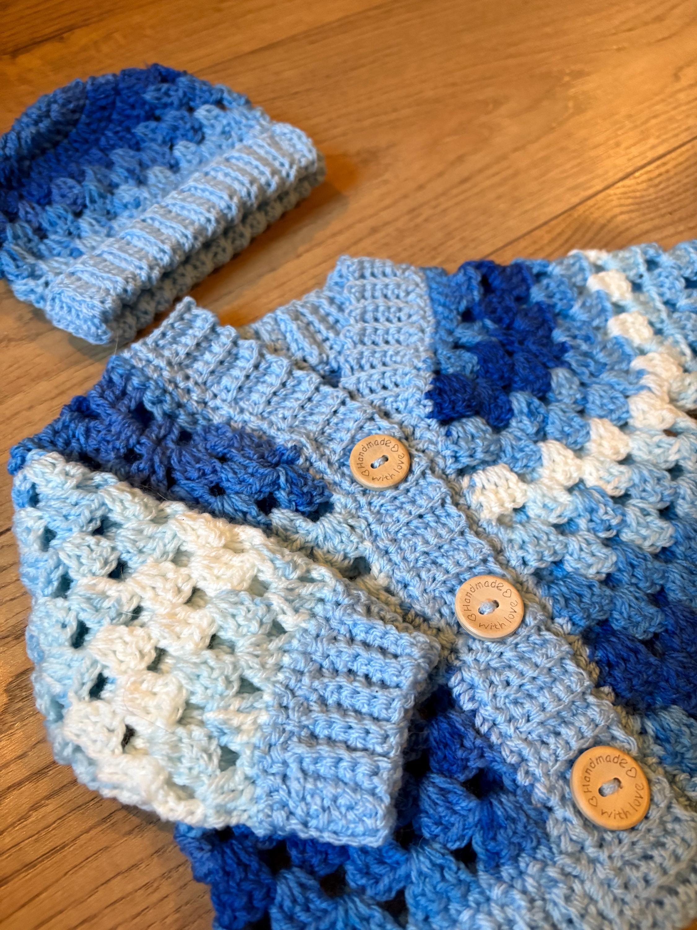 This crochet handmade baby cardigan and matching hat set are crafted using classic granny stitch design with a ribbed edging. The cardigan is finished with adorable teddy button closures. Quality soft acrylic yarn is used, machine washable and can be tumble dried on a low heat. Available in white or blue multicolour. Please message me if you have any special requests regarding colour, size or matching socks and I will arrange this for you.