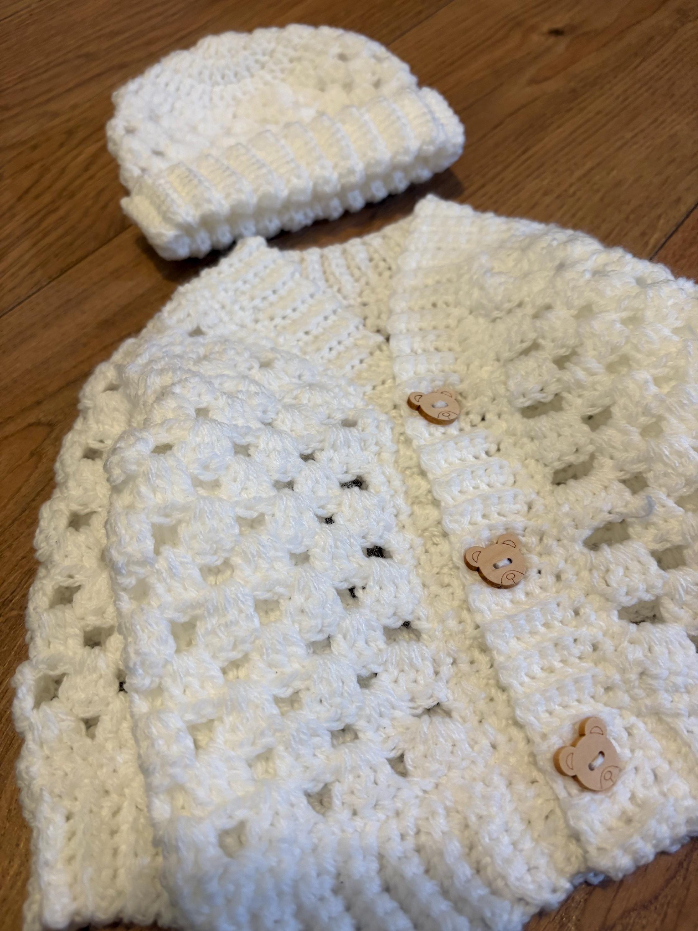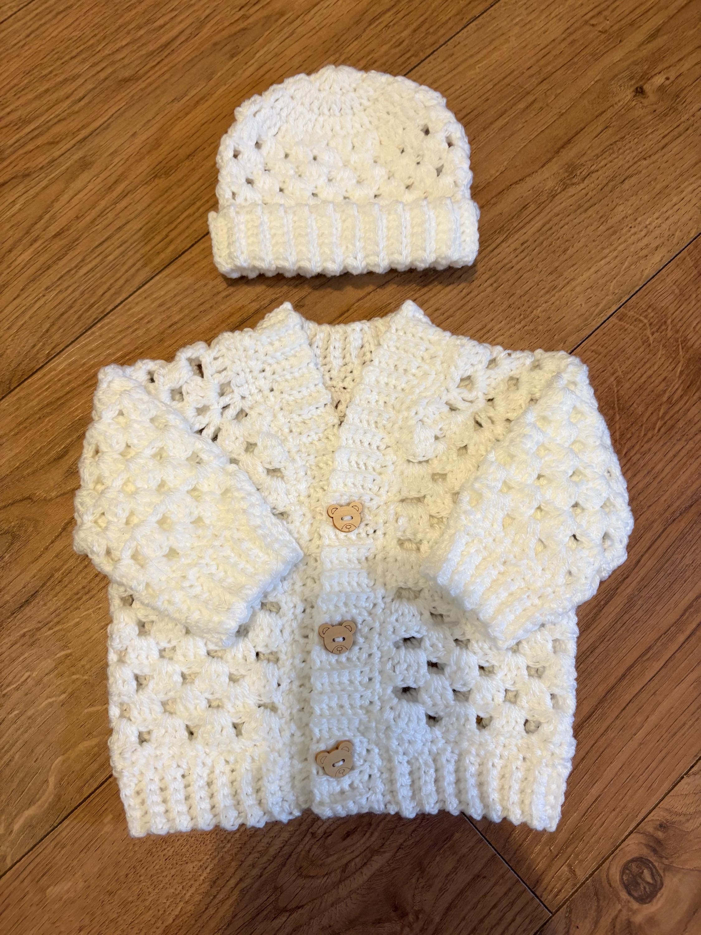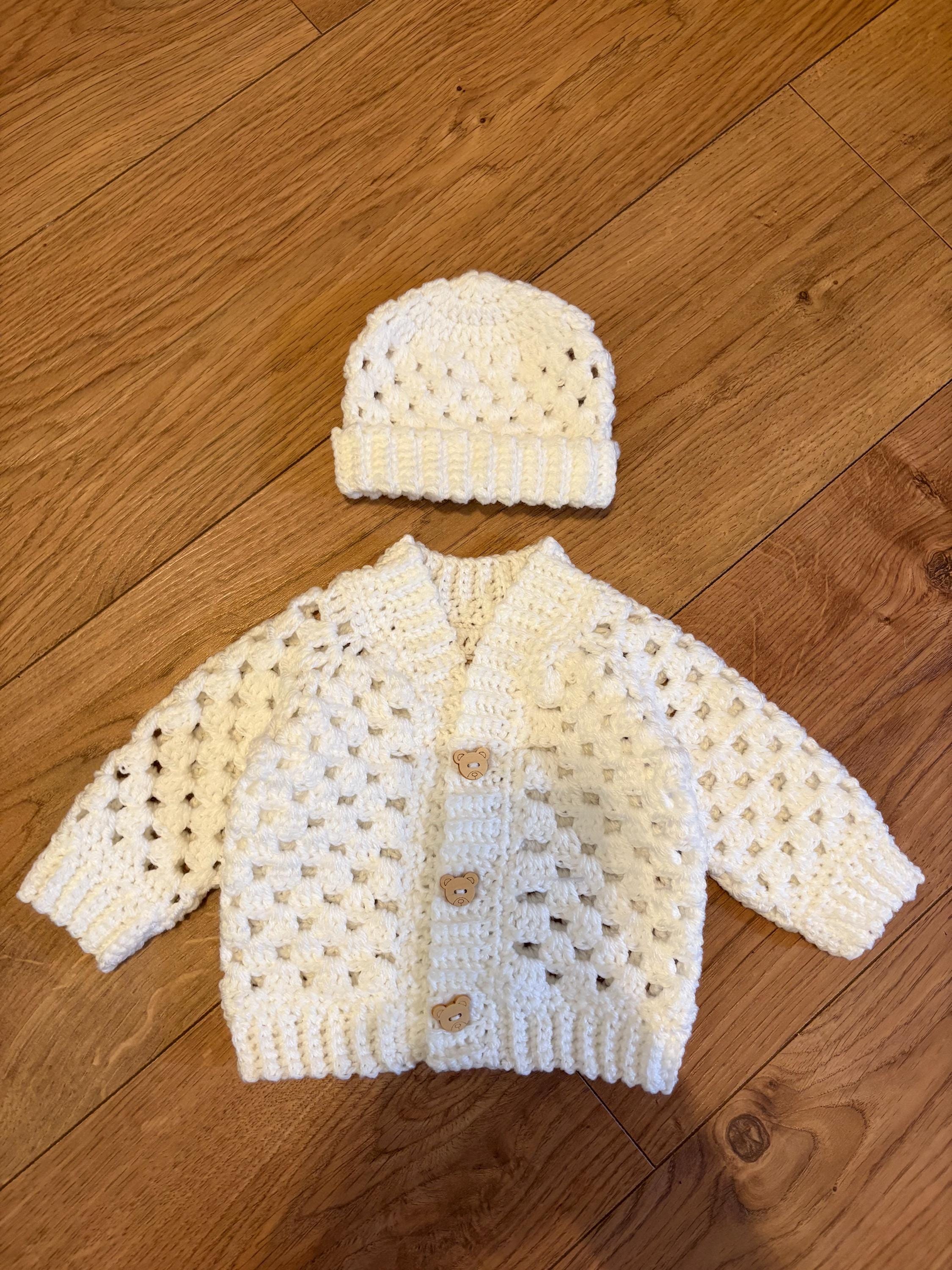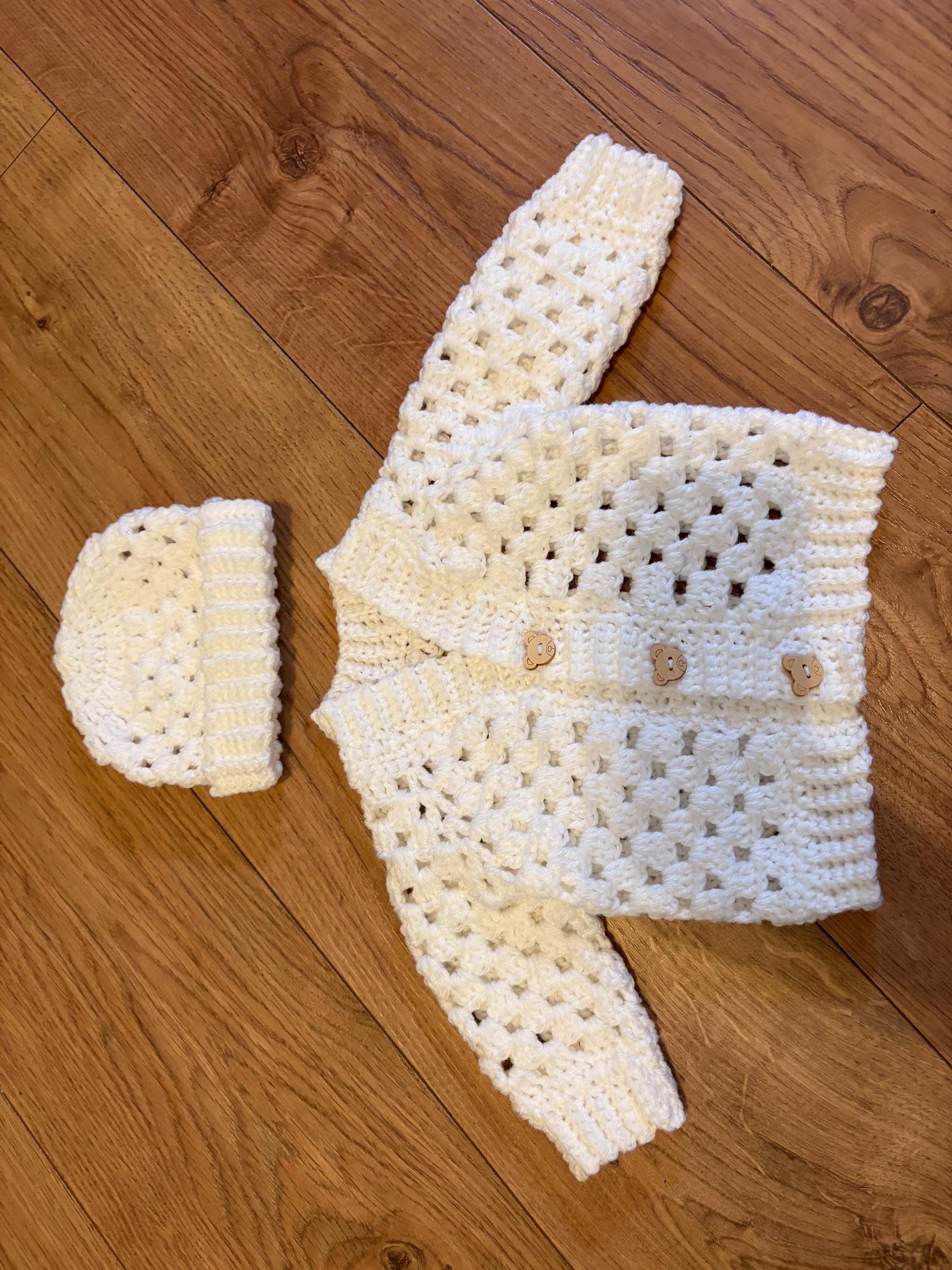 This crochet handmade baby cardigan and matching hat set are crafted using classic granny stitch design with a ribbed edging. The cardigan is finished with adorable teddy button closures. Quality soft acrylic yarn is used, machine washable and can be tumble dried on a low heat. Available in white or blue multicolour. Please message me if you have any special requests regarding colour, size or matching socks and I will arrange this for you.
