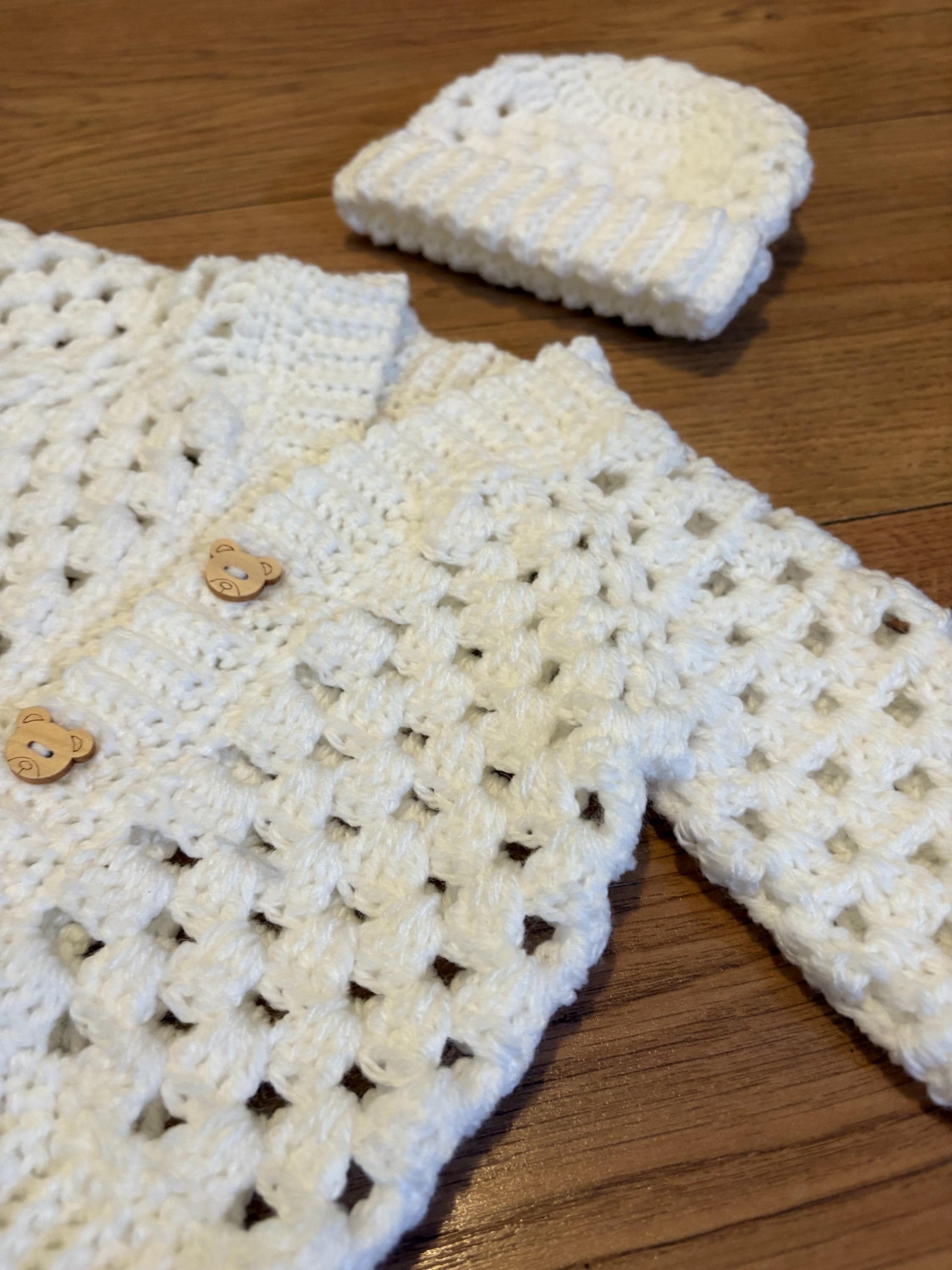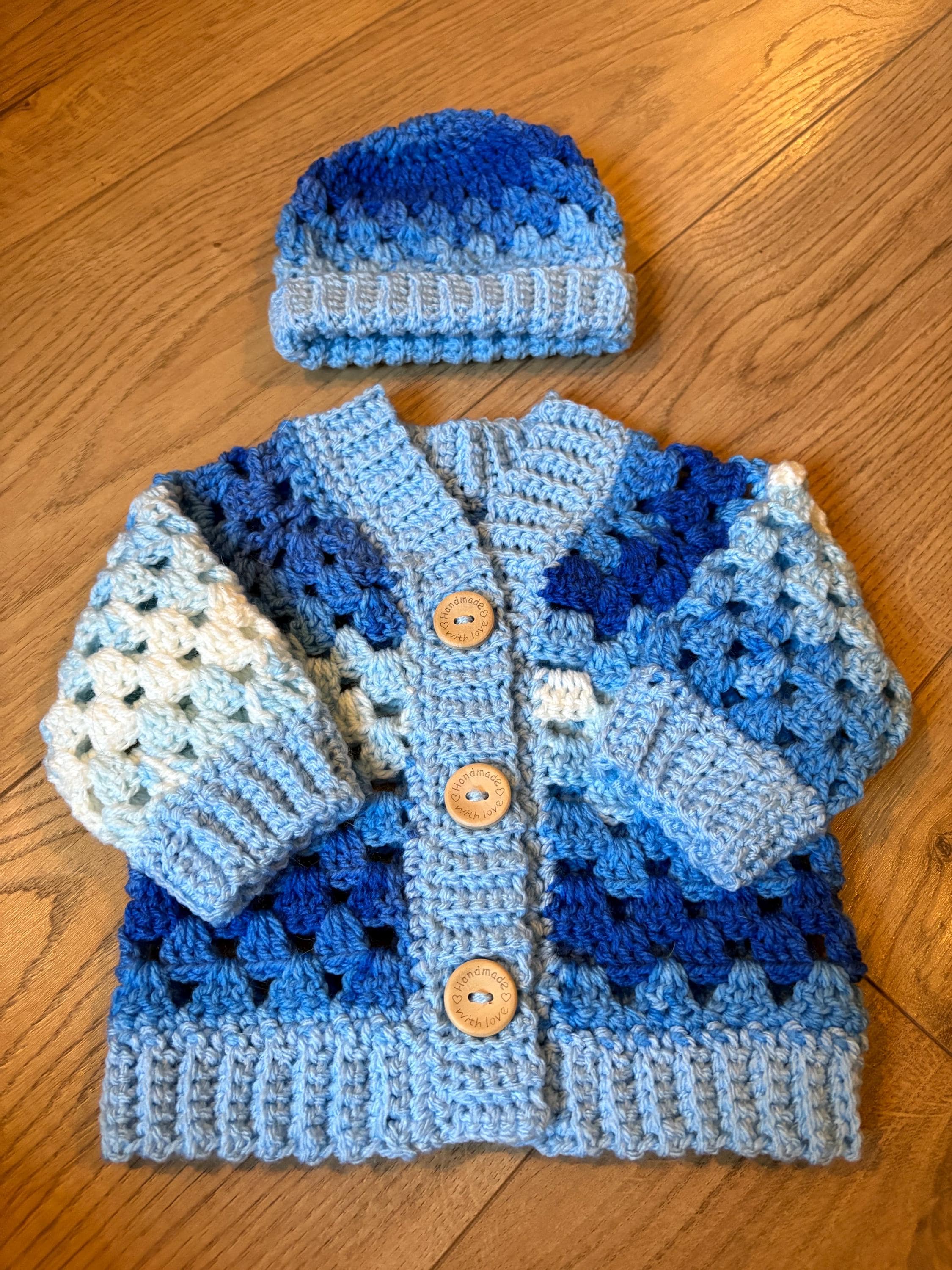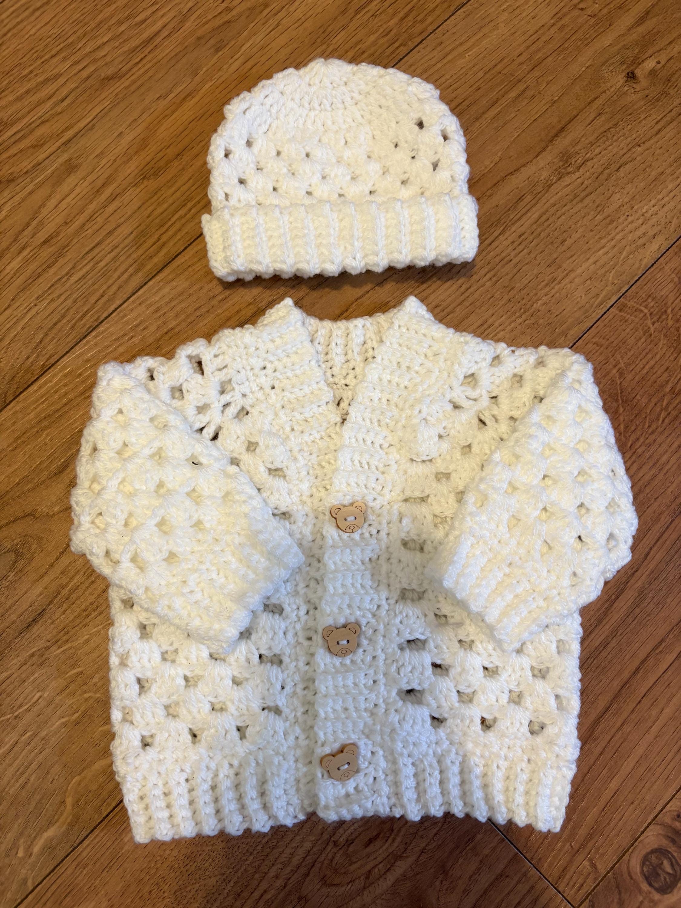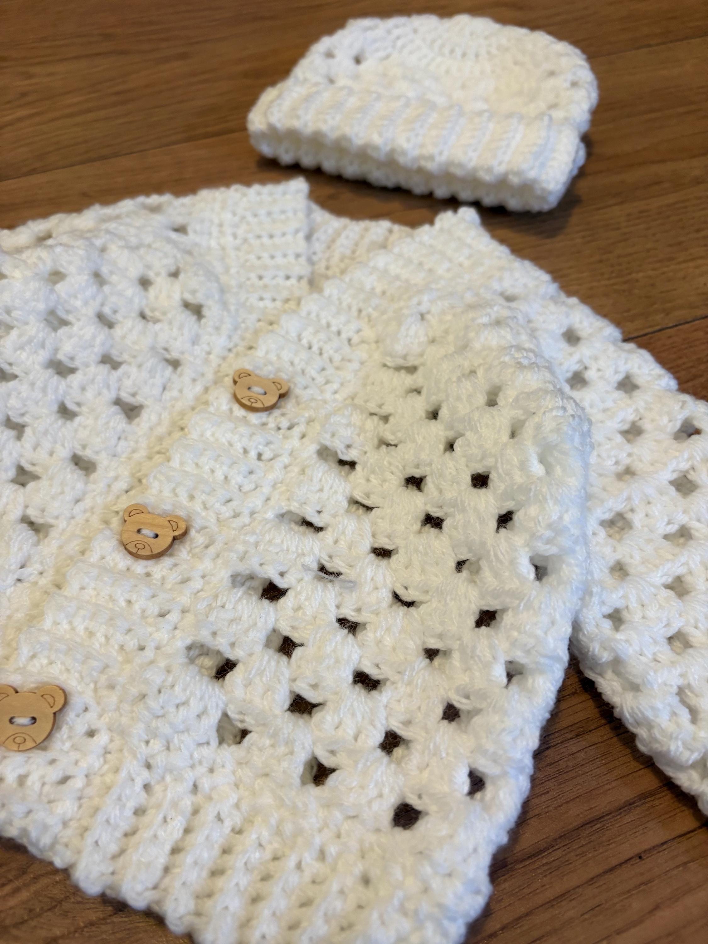 This crochet handmade baby cardigan and matching hat set are crafted using classic granny stitch design with a ribbed edging. The cardigan is finished with adorable teddy button closures. Quality soft acrylic yarn is used, machine washable and can be tumble dried on a low heat. Available in white or blue multicolour. Please message me if you have any special requests regarding colour, size or matching socks and I will arrange this for you.