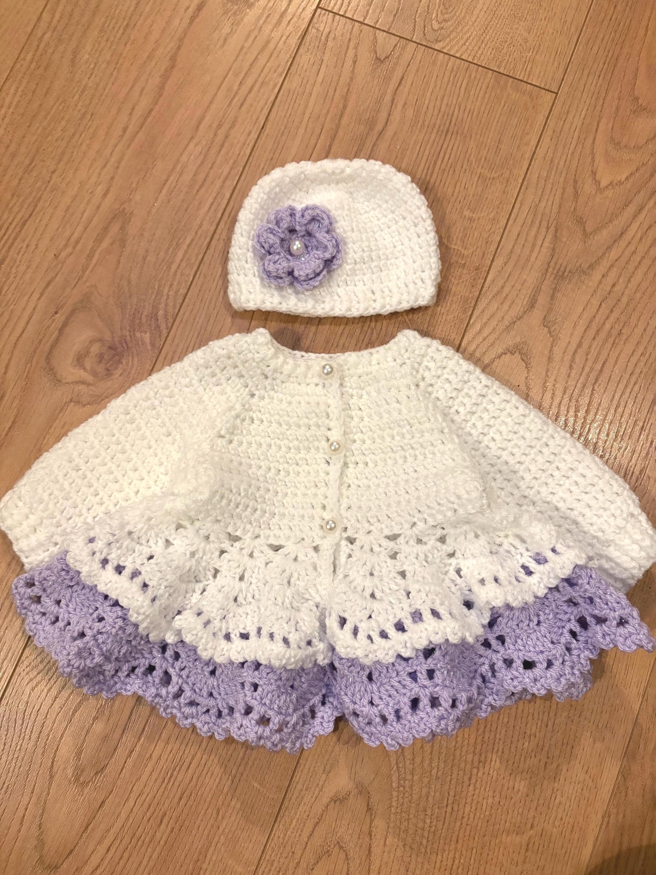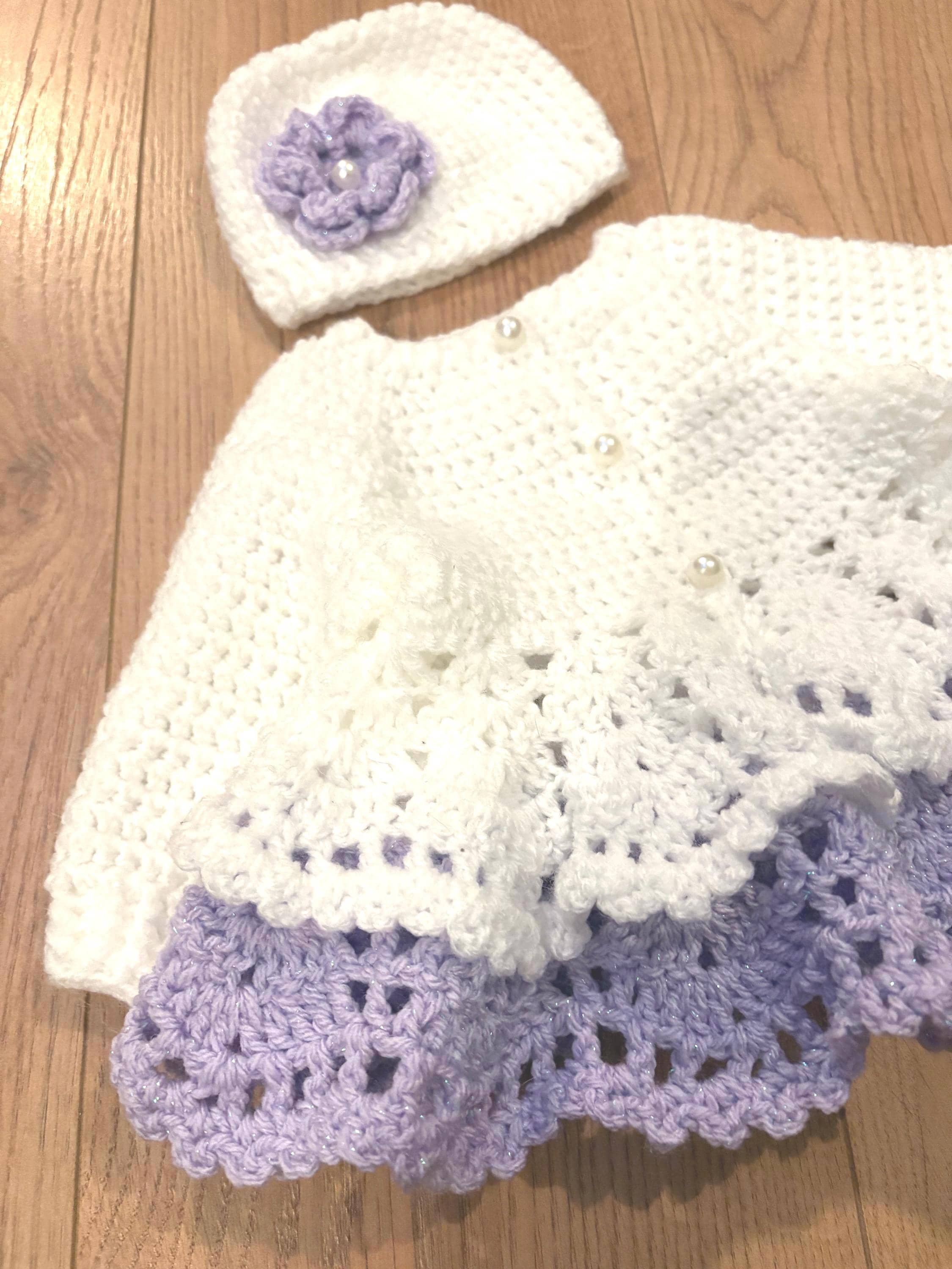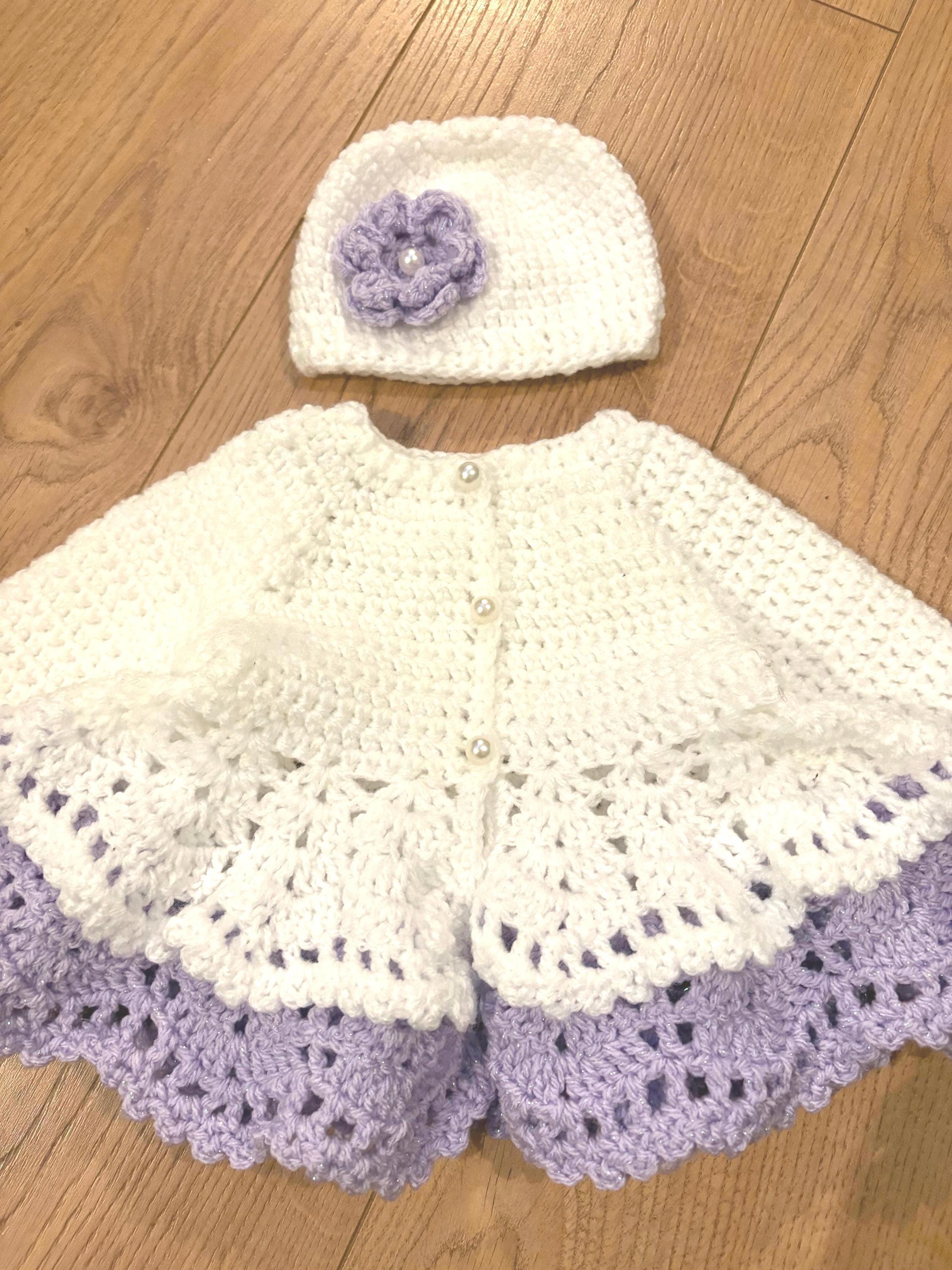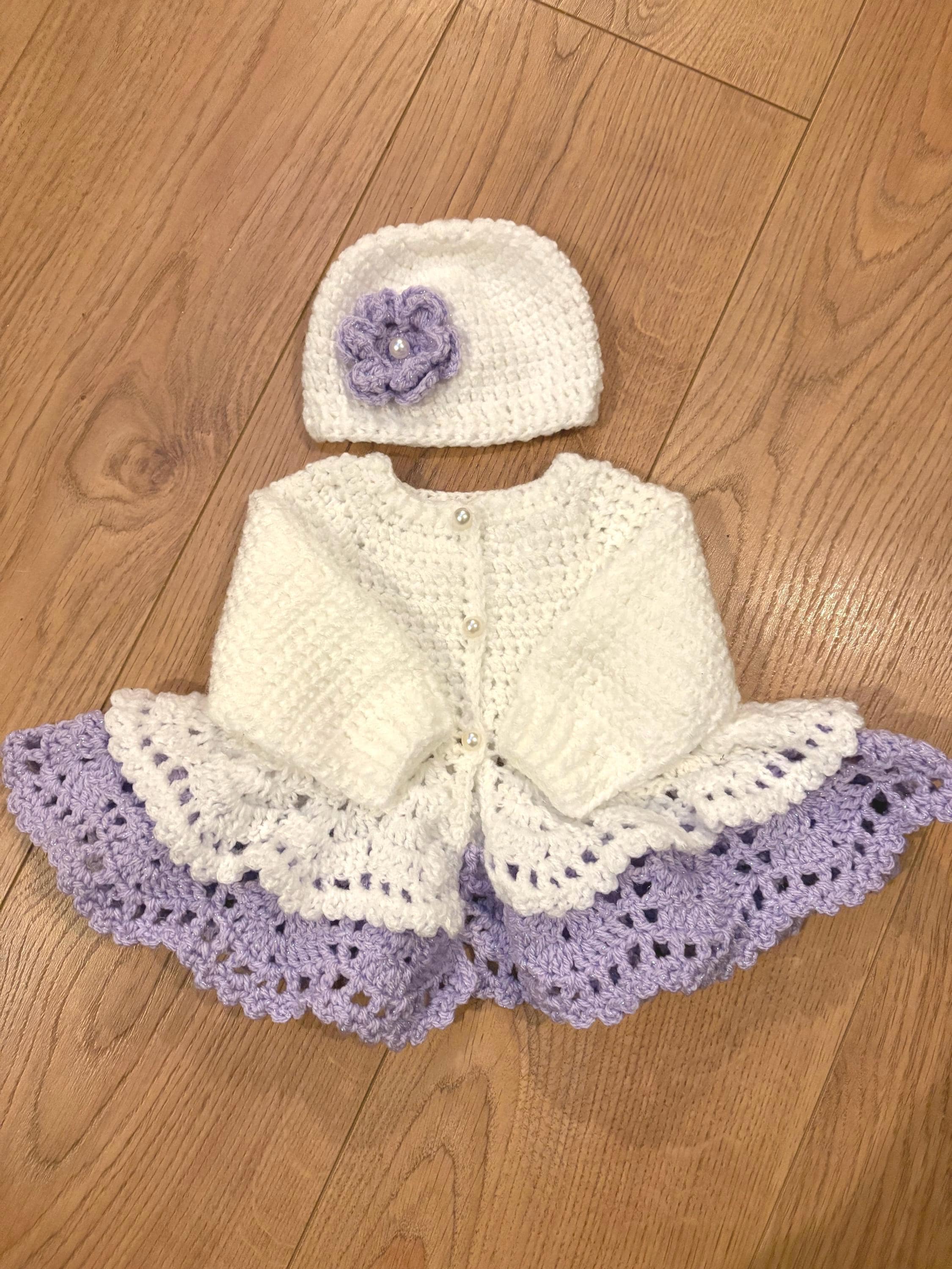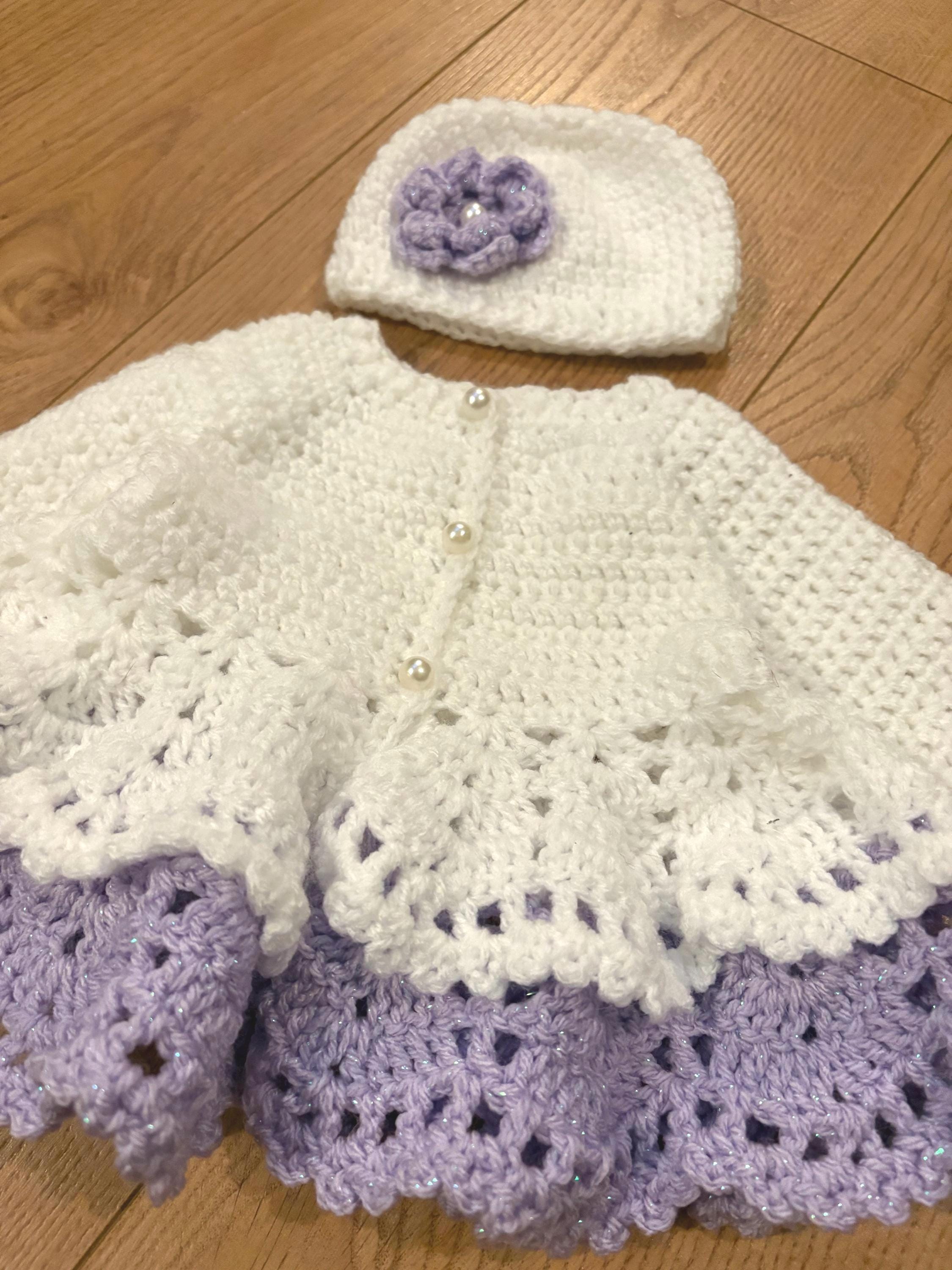 This adorable newborn set includes a cardigan with layered skirt design using crochet lace stitching and faux pearl closures, matching hat with handmade flower and 8cm booties with faux pearl fastenings. The hat is suitable for head sizes approximately 35-37cm and the cardigan has a chest measurement of 42cm. Avaiable in colours white and pink or white and purple sparkle. I can make any colour or measurement adjustments so please contact me if you would prefer a different customisation.