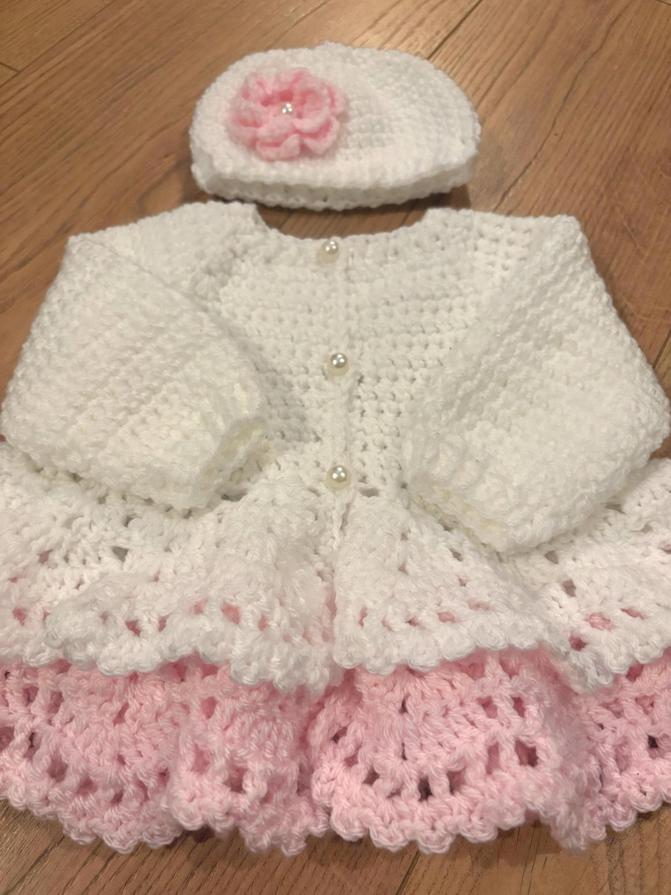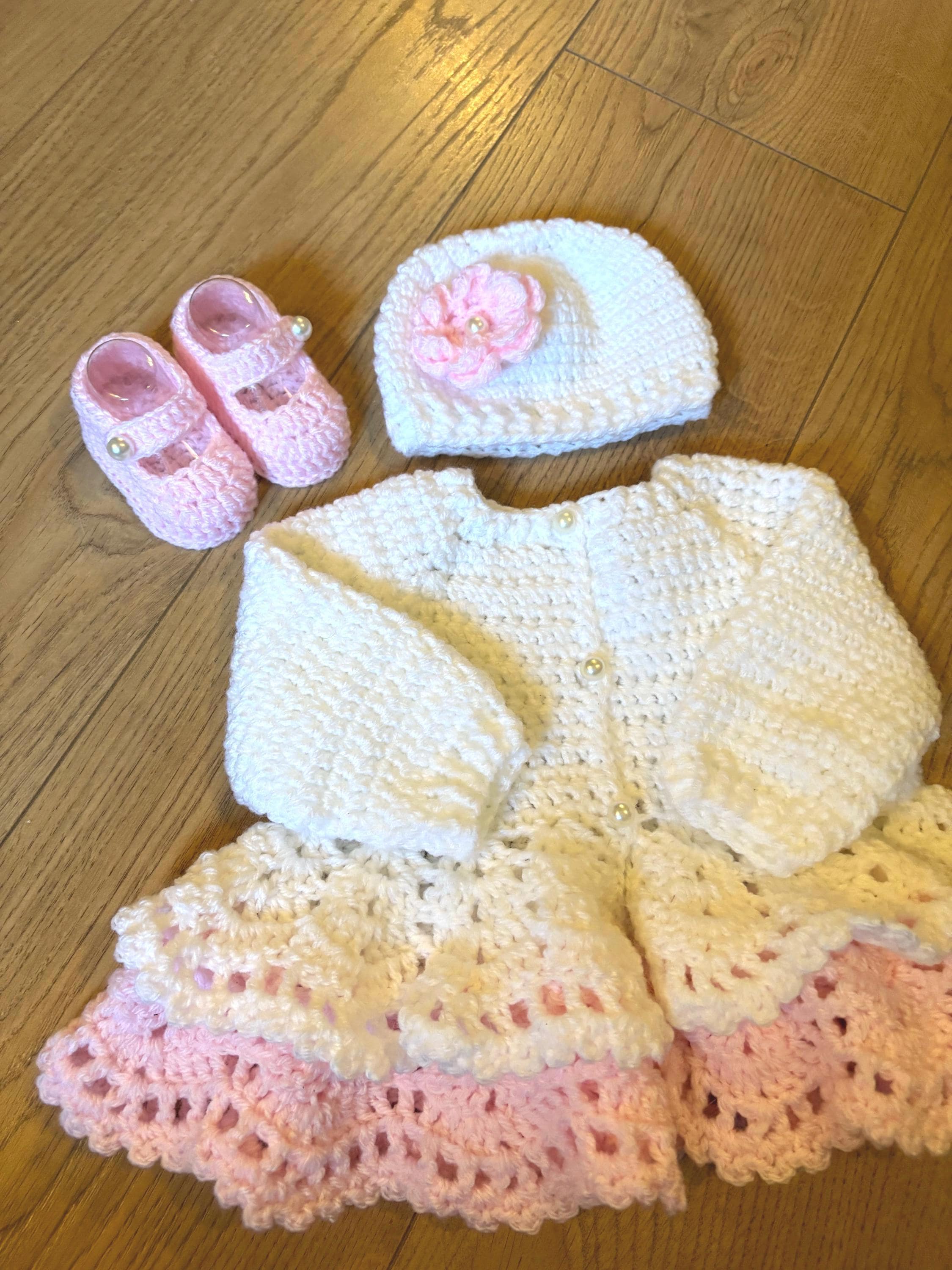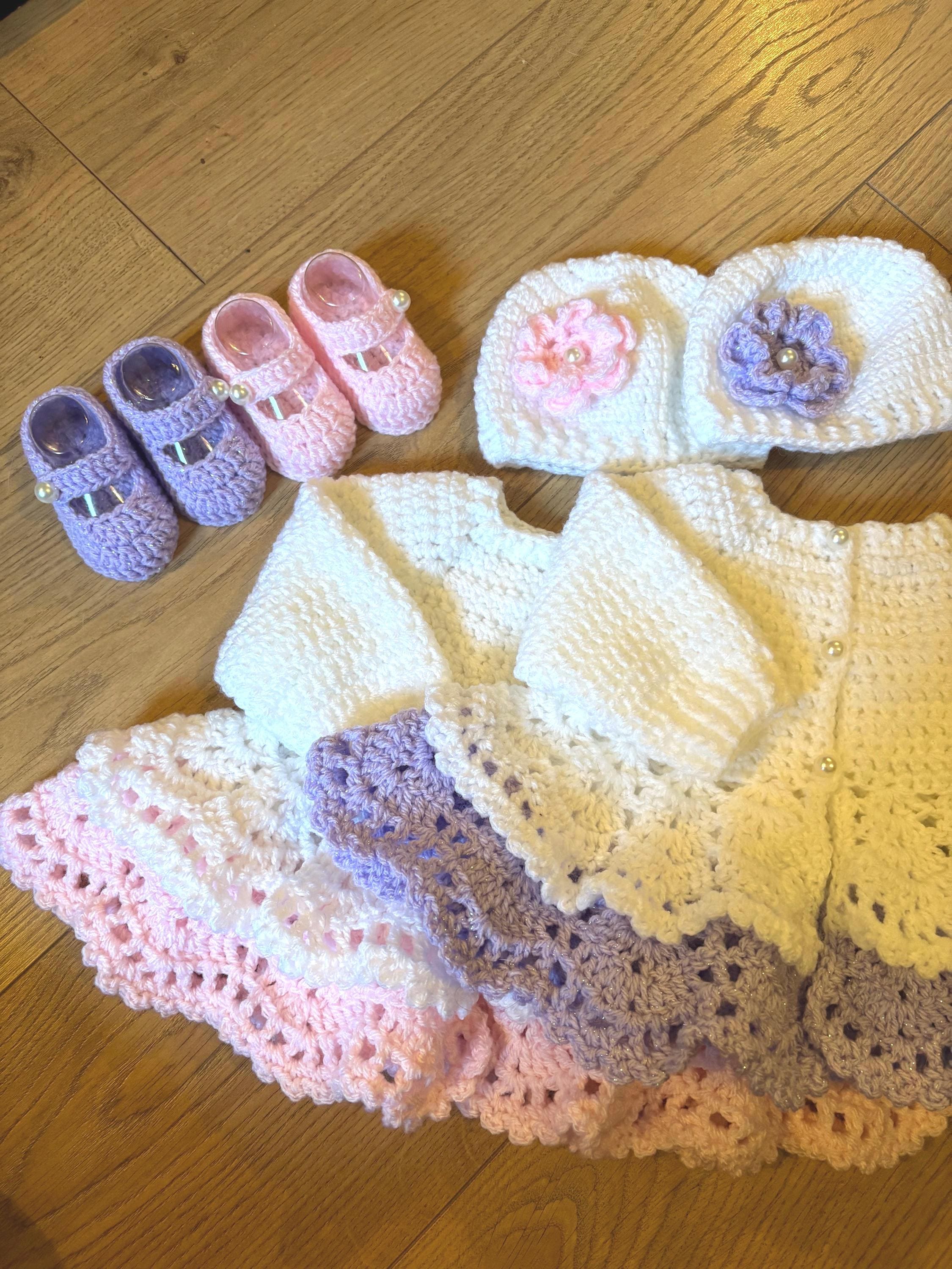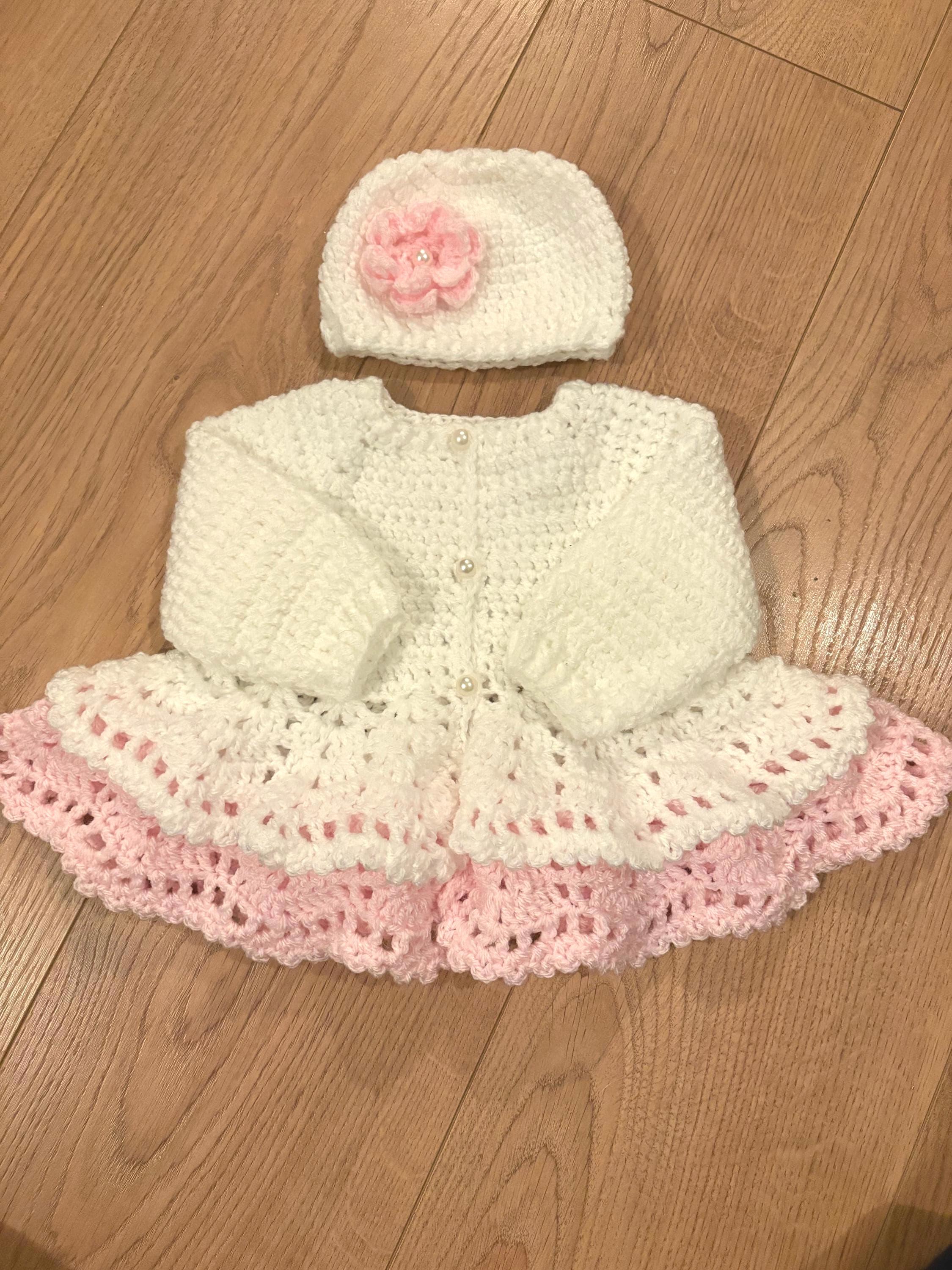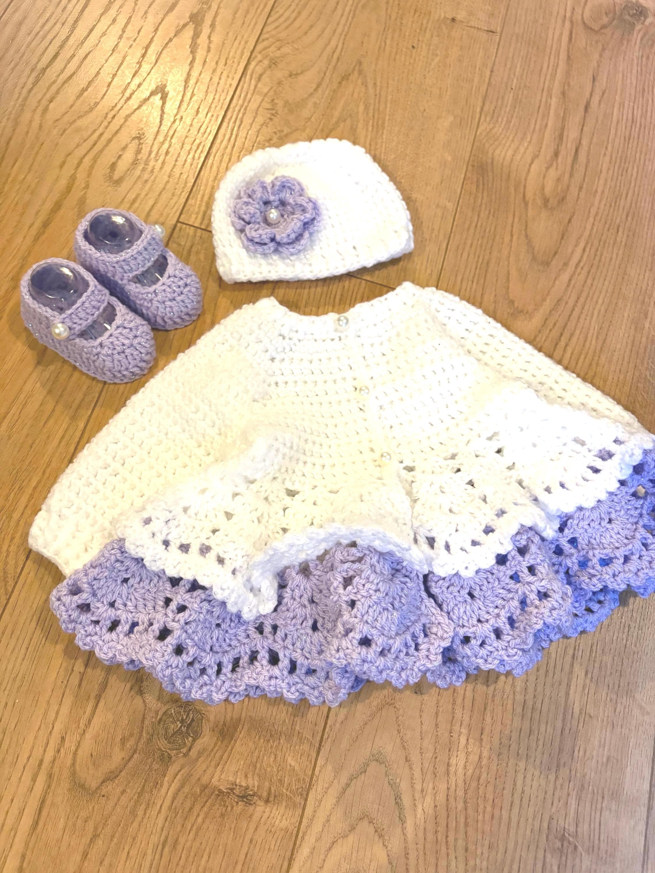 This adorable newborn set includes a cardigan with layered skirt design using crochet lace stitching and faux pearl closures, matching hat with handmade flower and 8cm booties with faux pearl fastenings. The hat is suitable for head sizes approximately 35-37cm and the cardigan has a chest measurement of 42cm. Avaiable in colours white and pink or white and purple sparkle. I can make any colour or measurement adjustments so please contact me if you would prefer a different customisation.