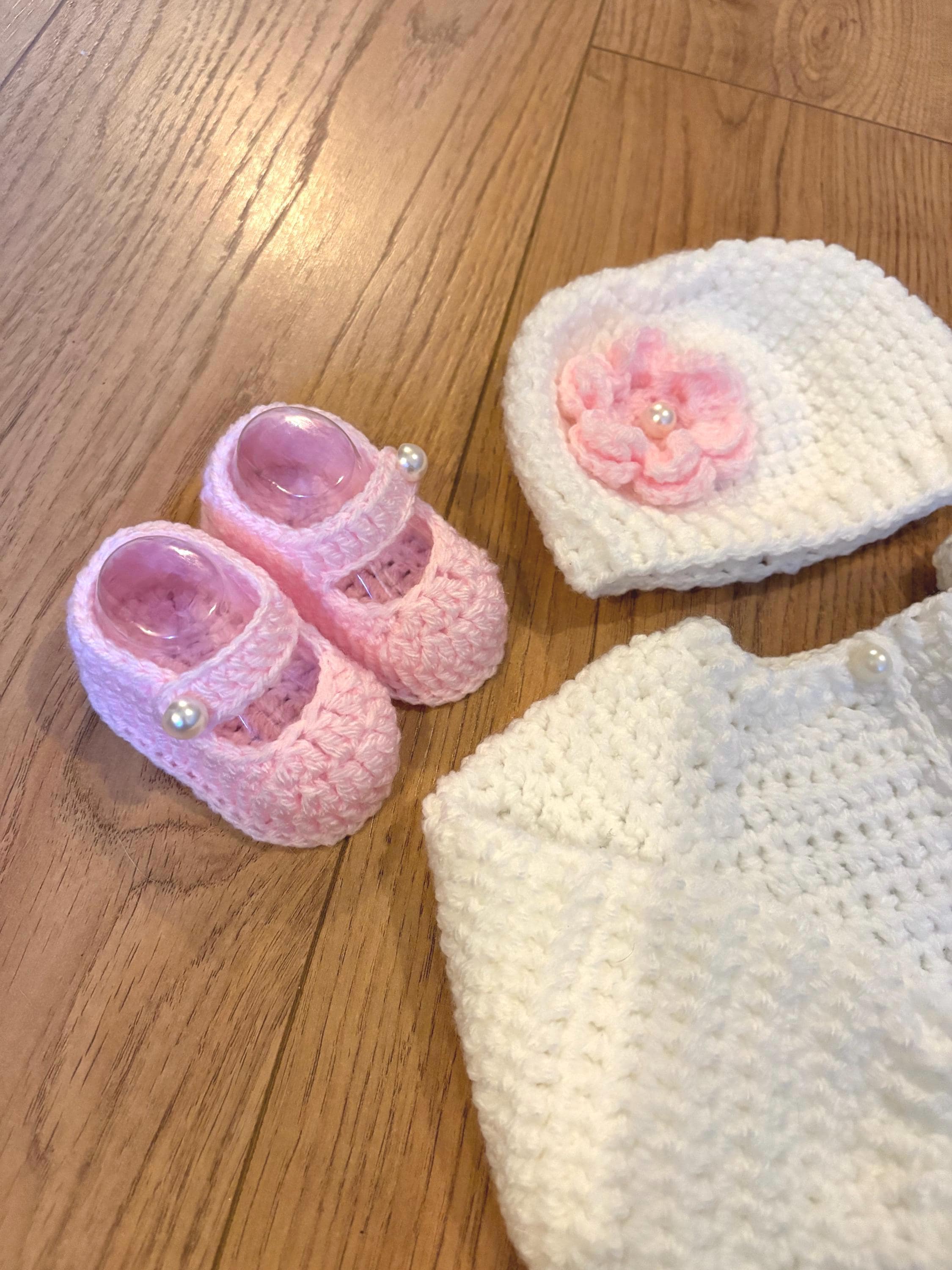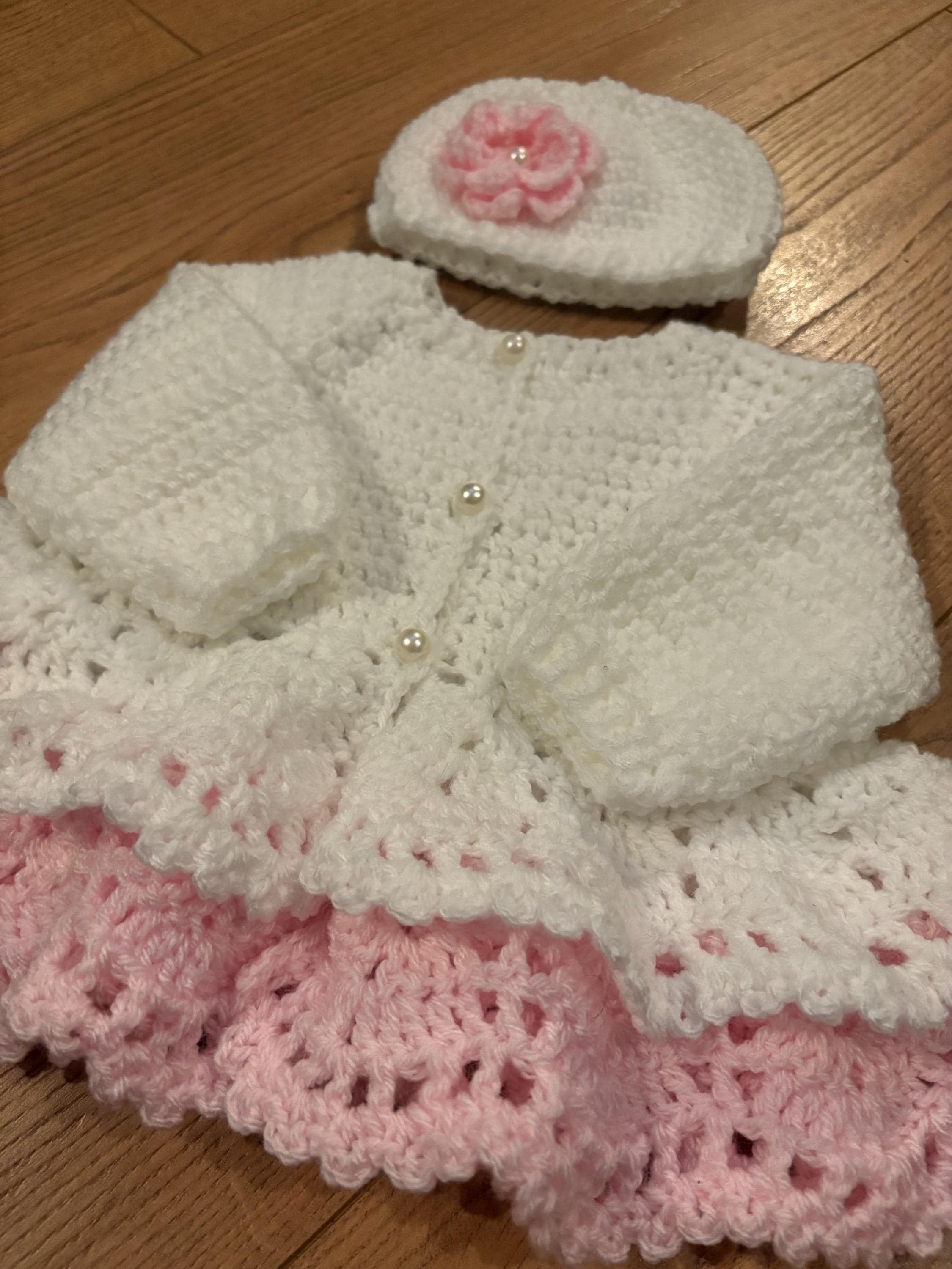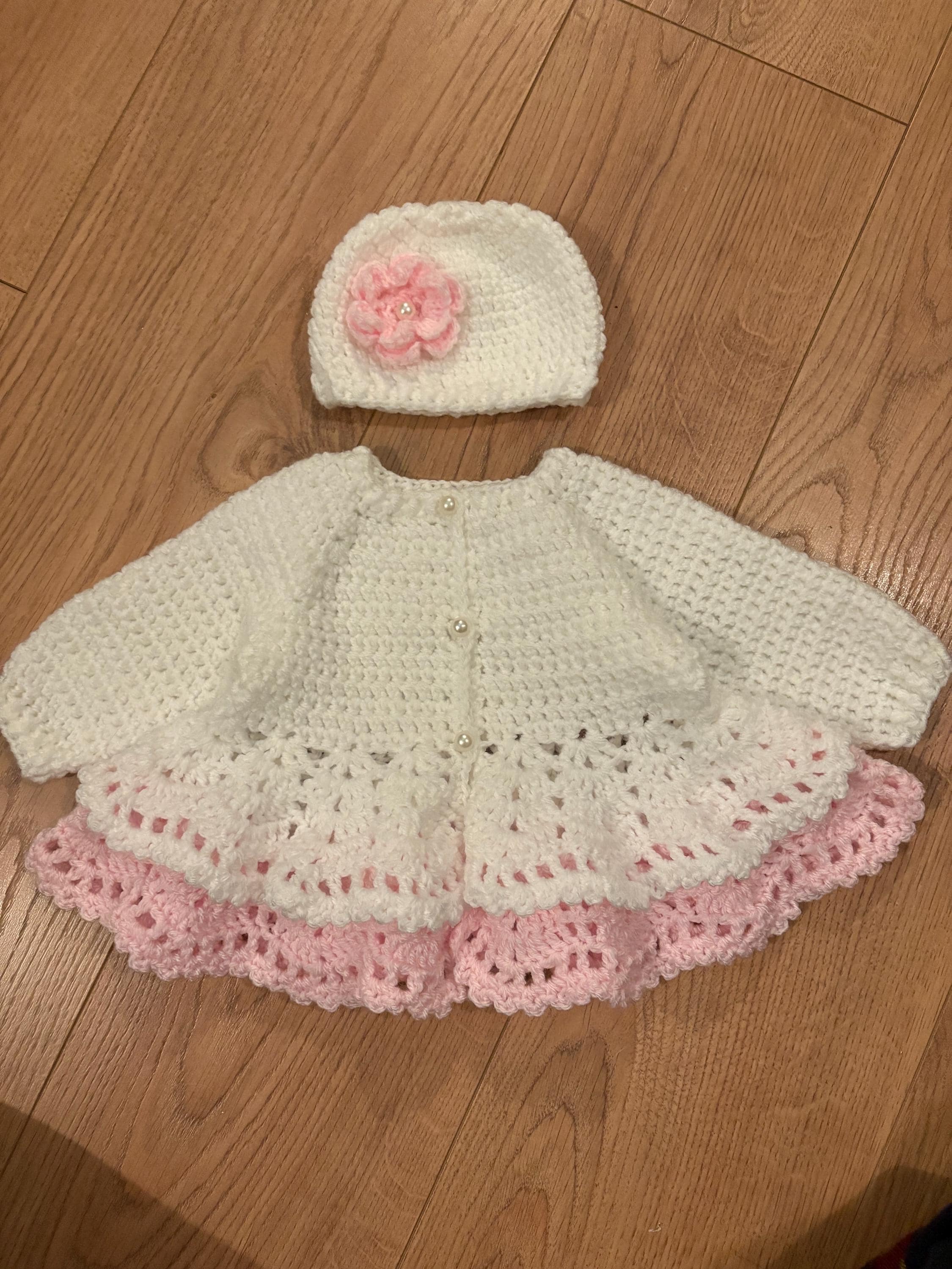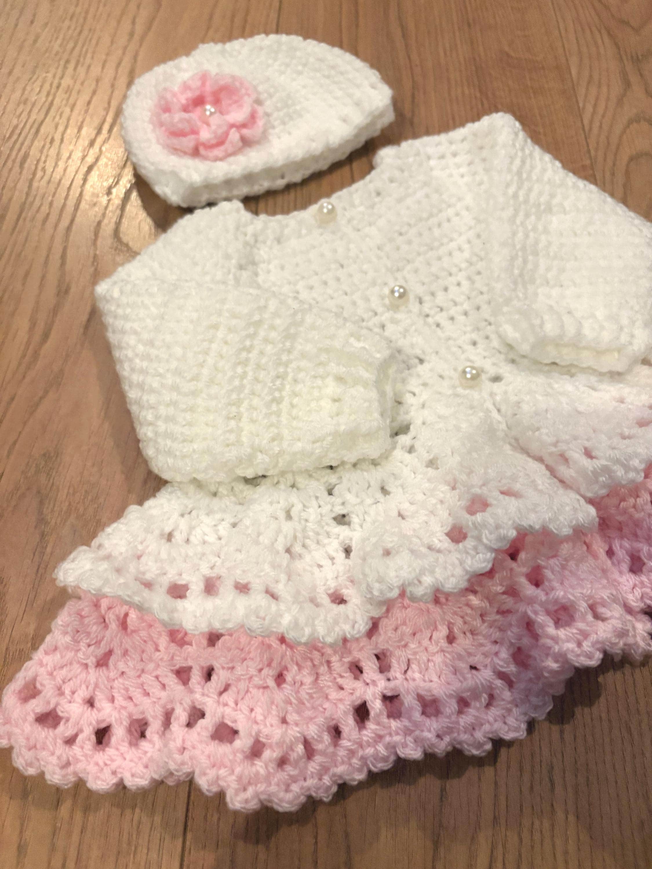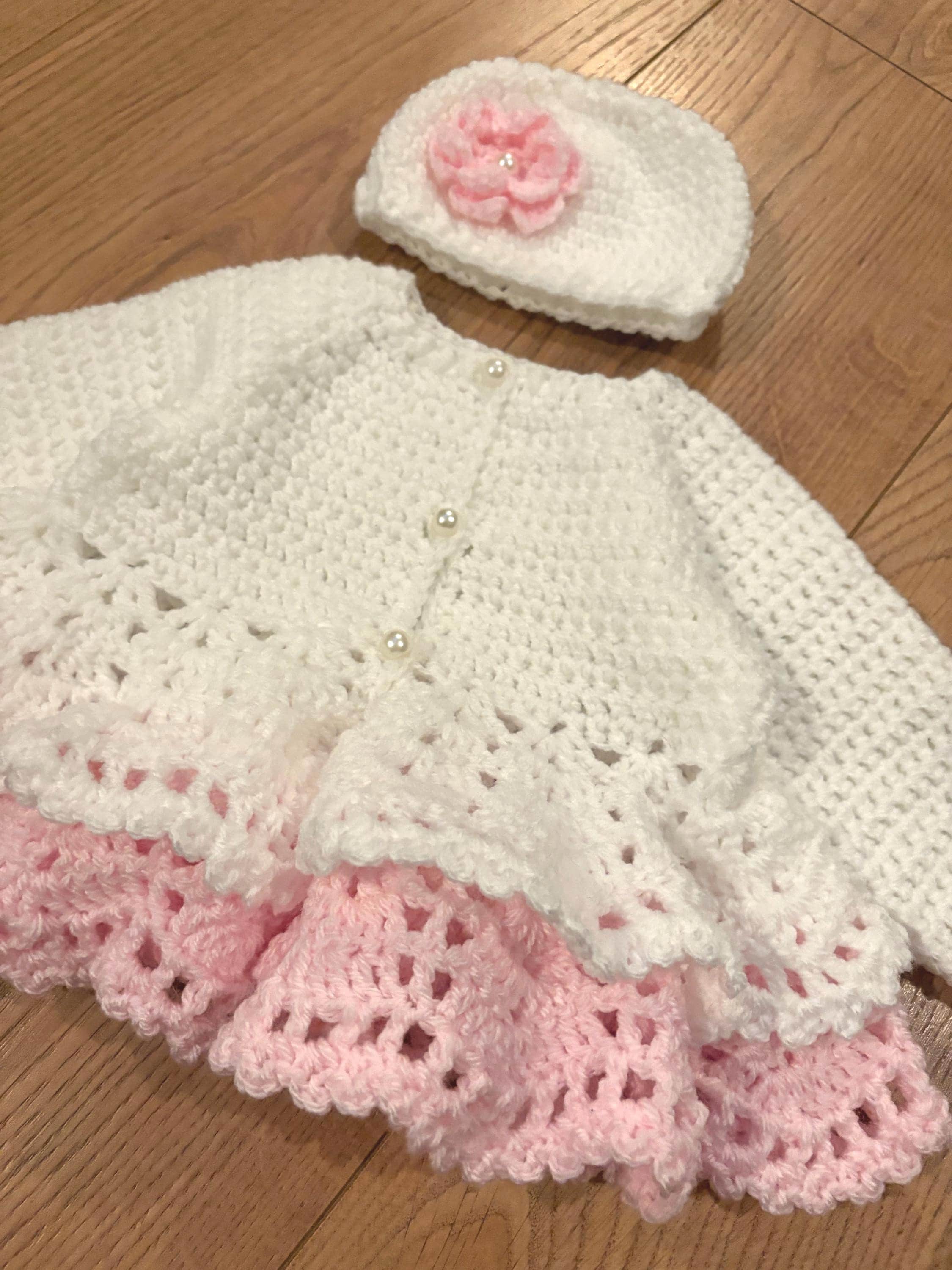 This adorable newborn set includes a cardigan with layered skirt design using crochet lace stitching and faux pearl closures, matching hat with handmade flower and 8cm booties with faux pearl fastenings. The hat is suitable for head sizes approximately 35-37cm and the cardigan has a chest measurement of 42cm. Avaiable in colours white and pink or white and purple sparkle. I can make any colour or measurement adjustments so please contact me if you would prefer a different customisation.
