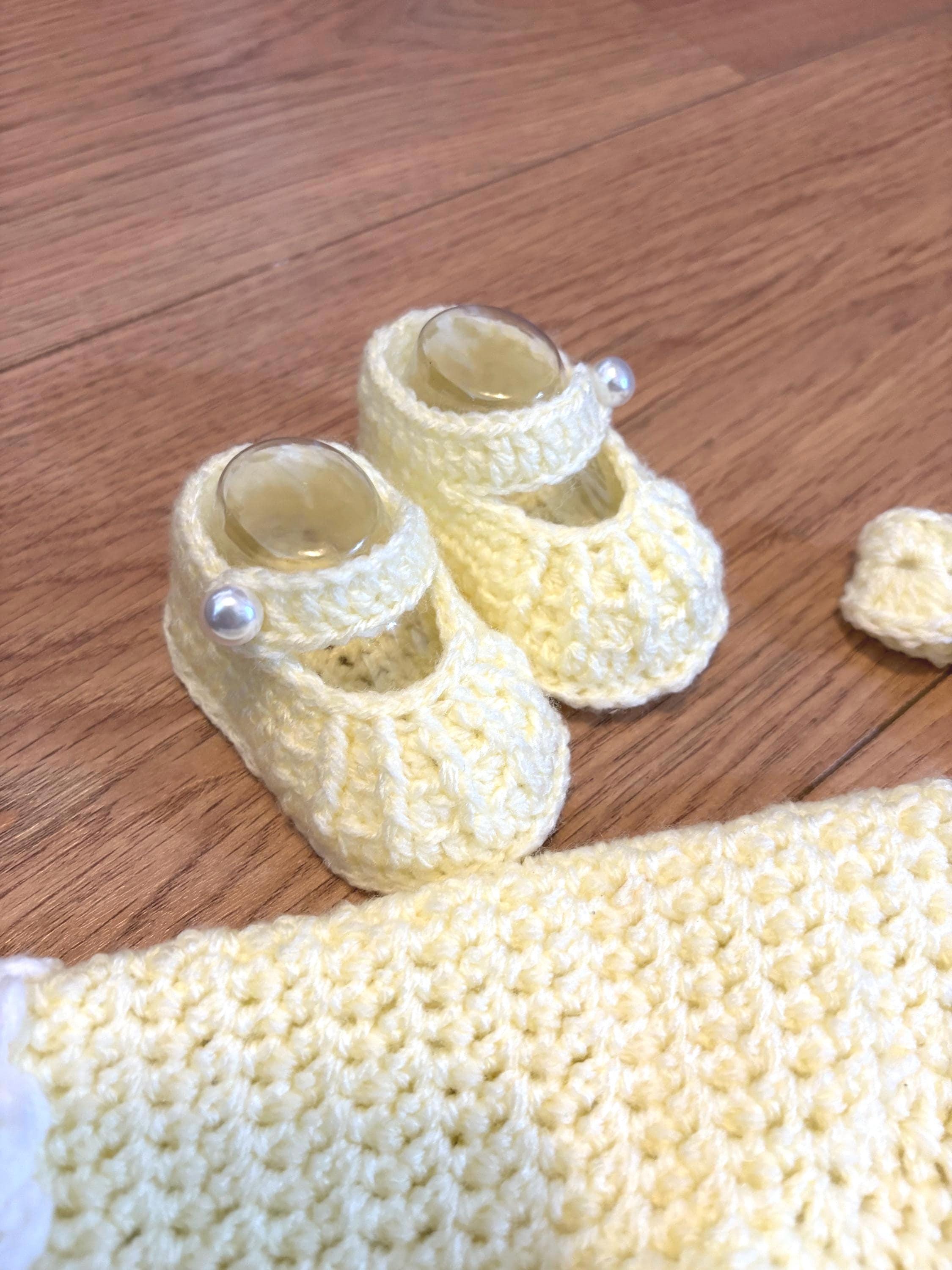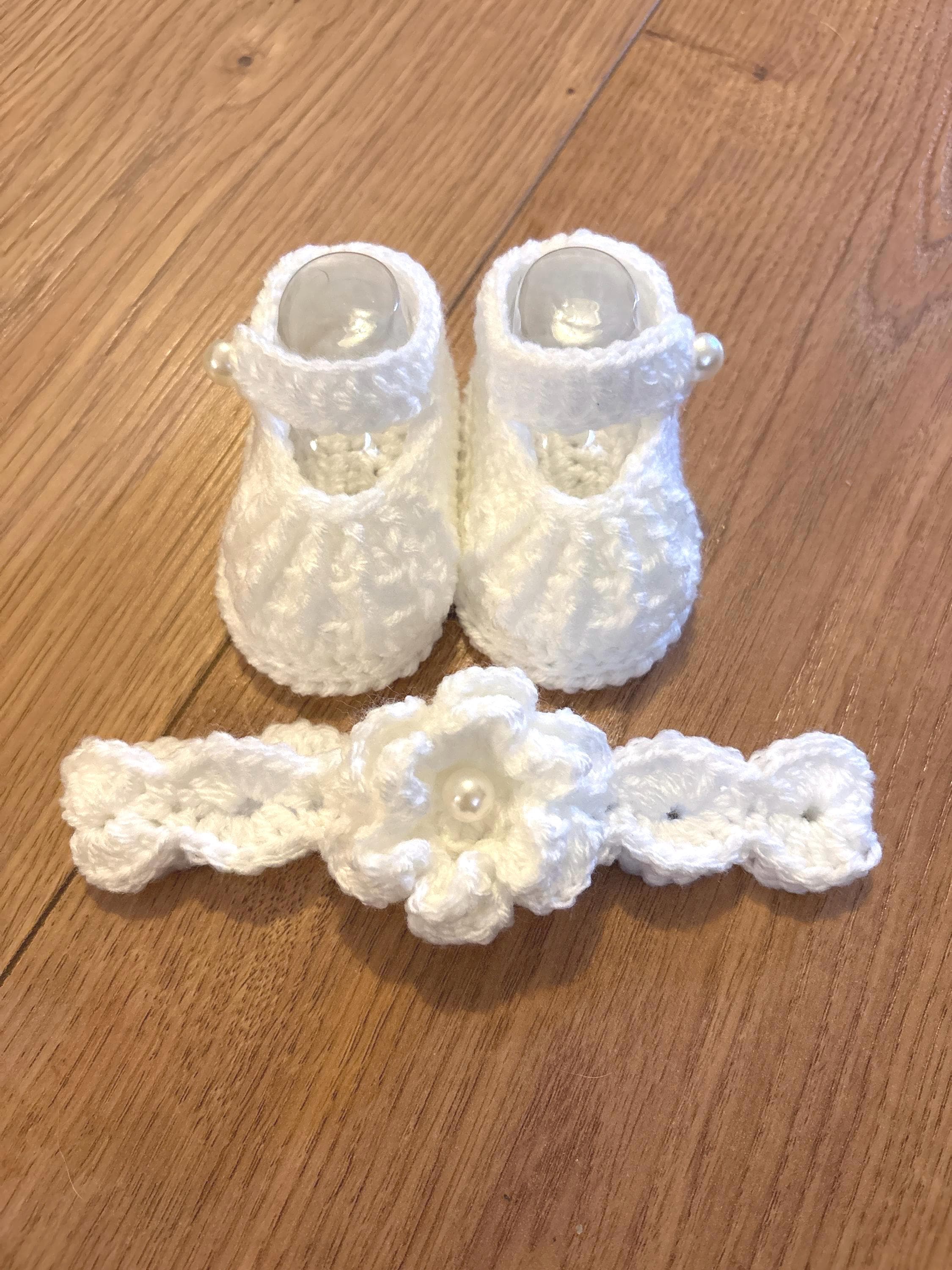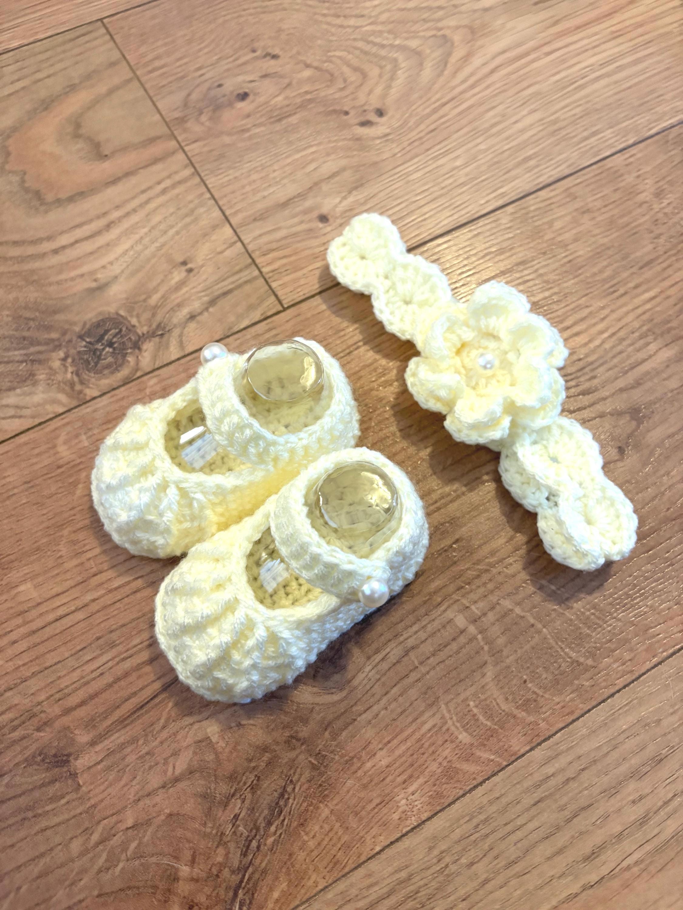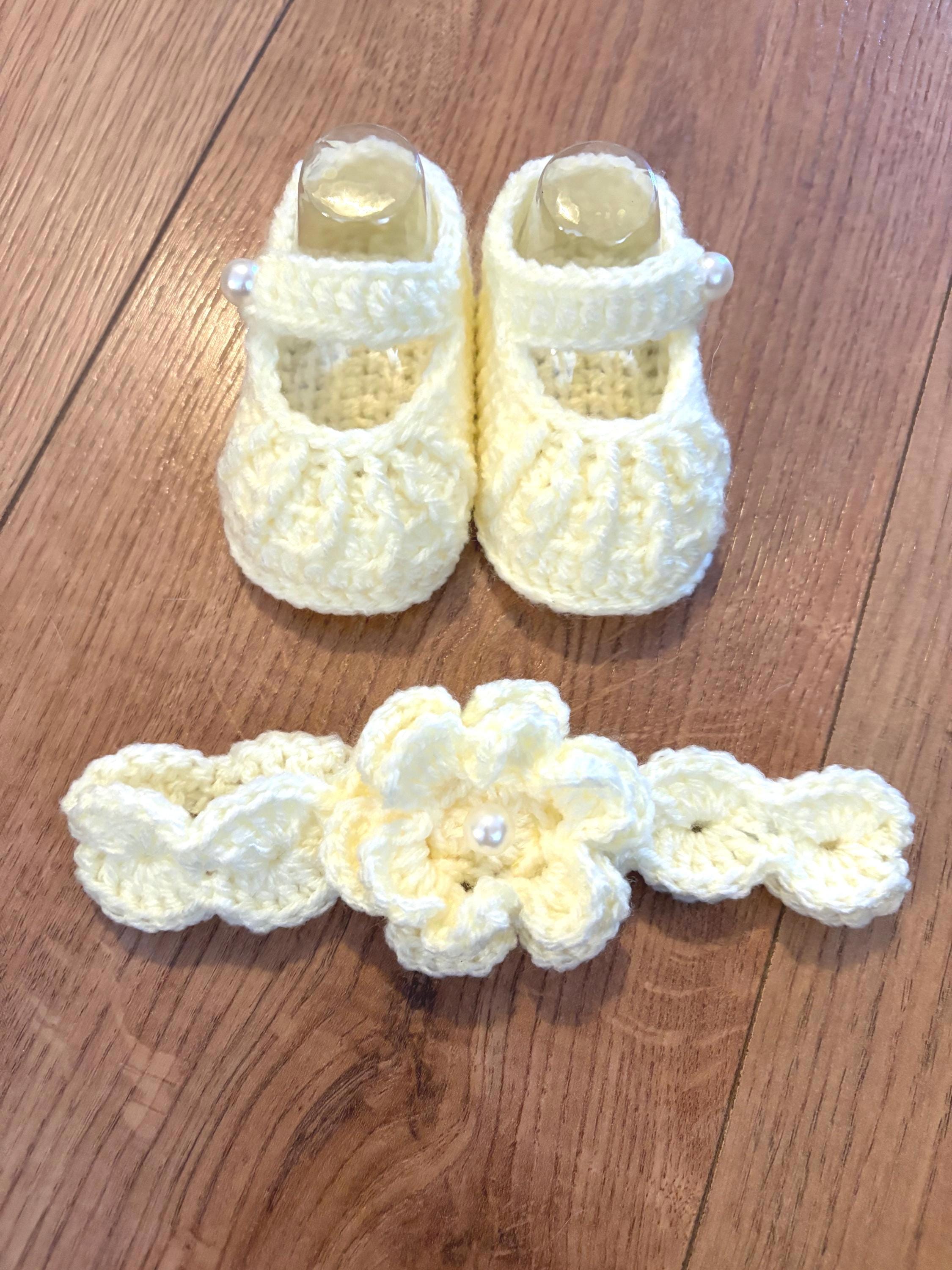 This set includes crochet baby shoes in a Mary Jane style with faux pearl fastenings and a matching headband with handmade crochet flower detail. Crafted using soft acrylic yarn with complementary inserts included for booties to maintain perfect shape after washing.