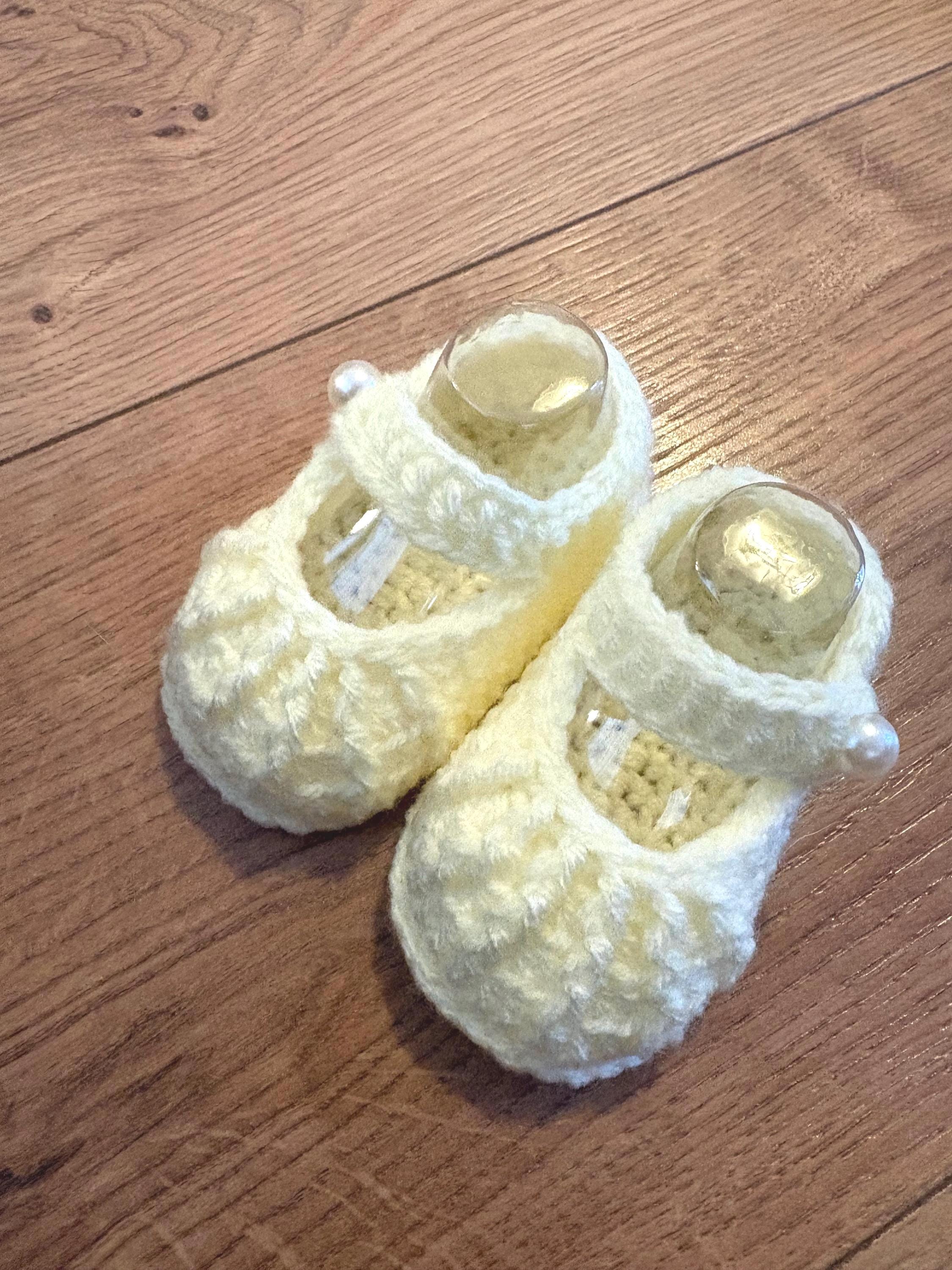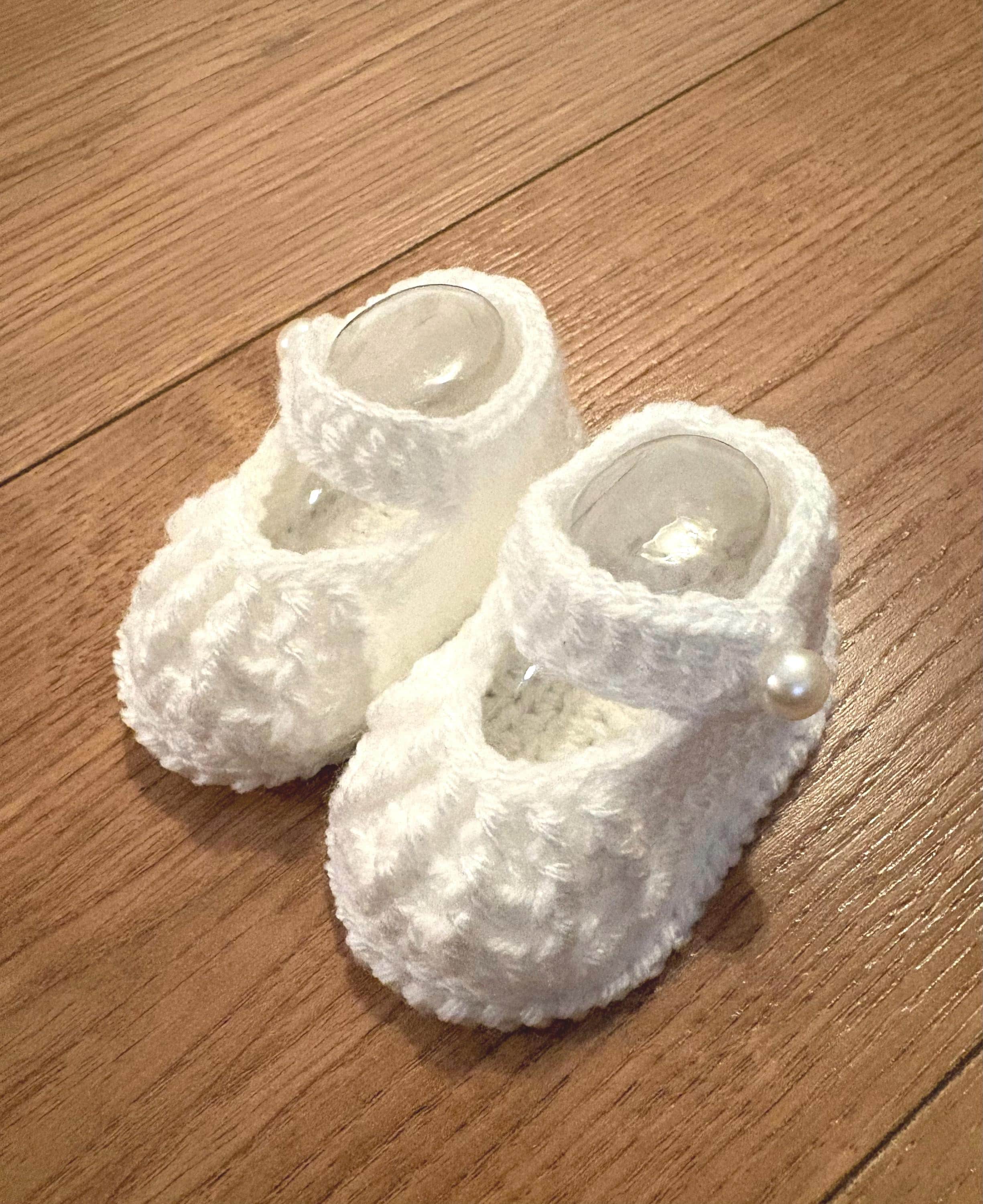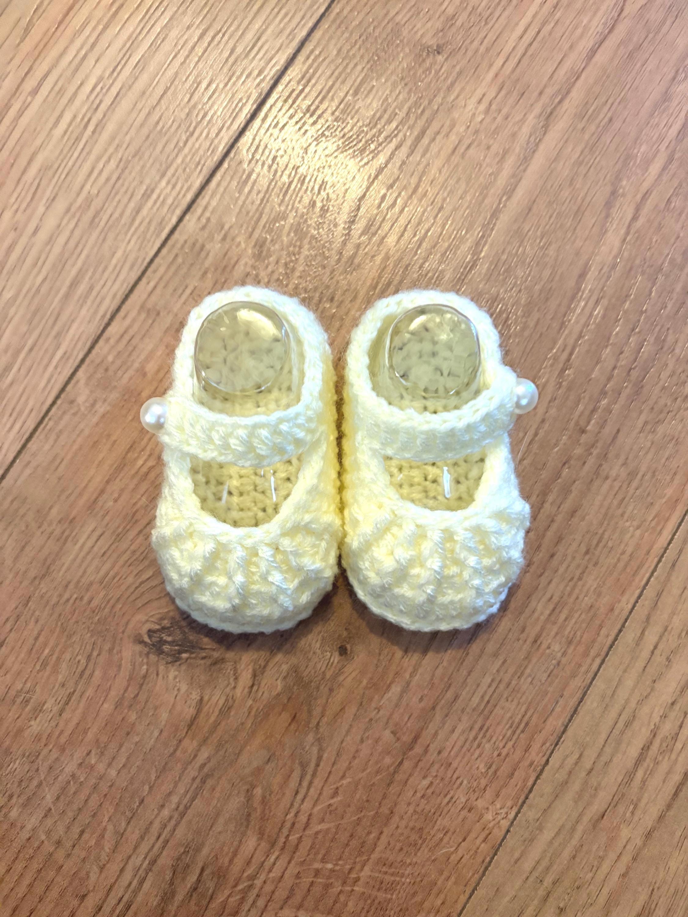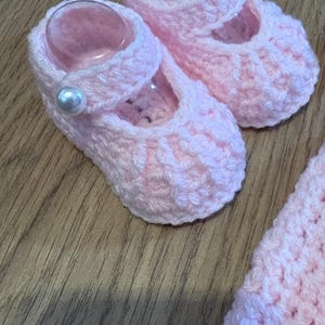 This set includes crochet baby shoes in a Mary Jane style with faux pearl fastenings and a matching headband with handmade crochet flower detail. Crafted using soft acrylic yarn with complementary inserts included for booties to maintain perfect shape after washing.