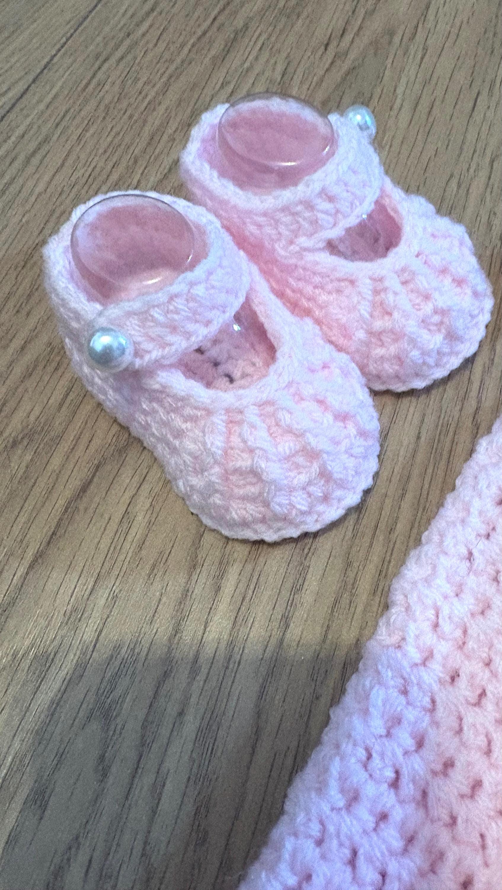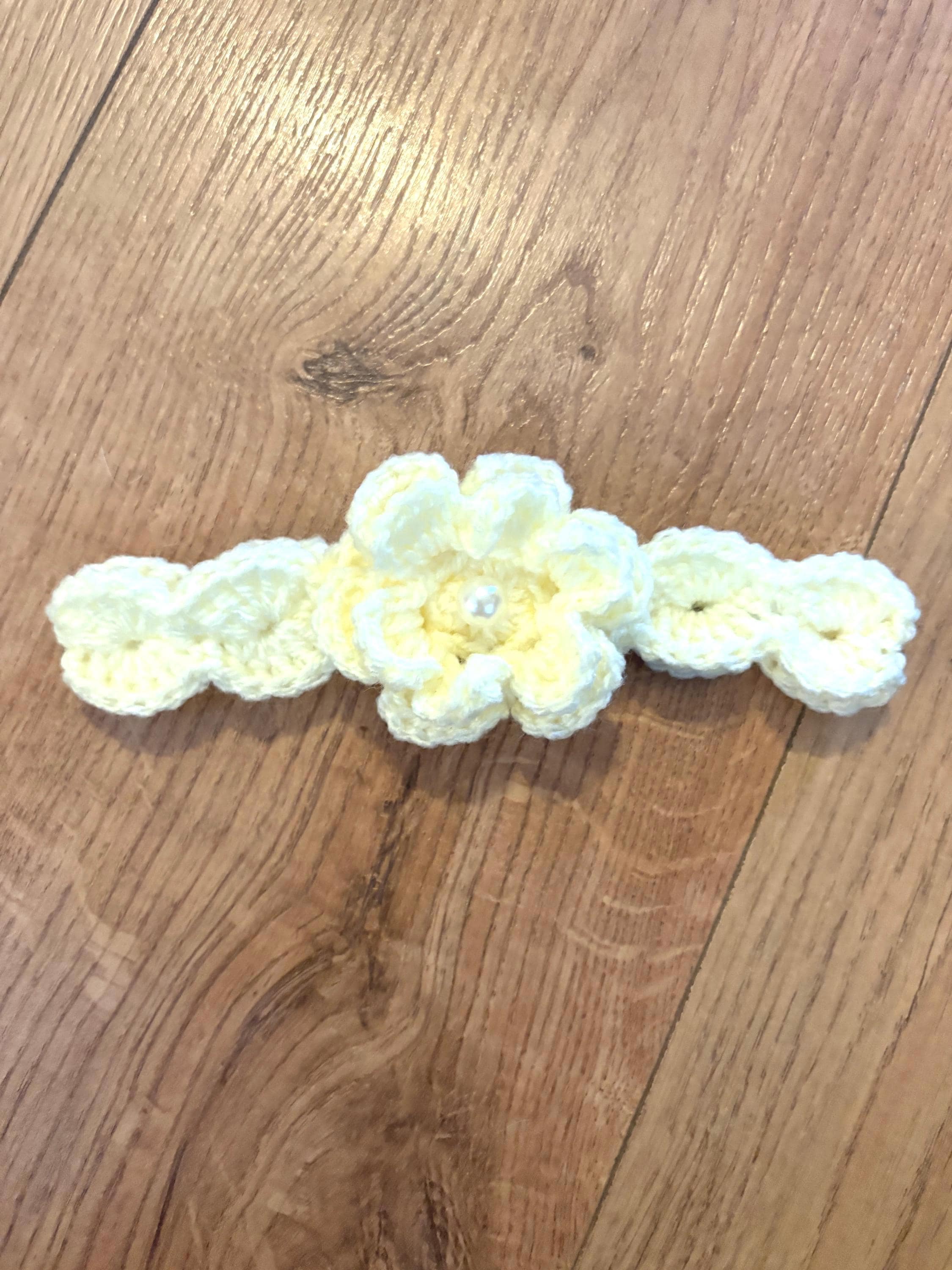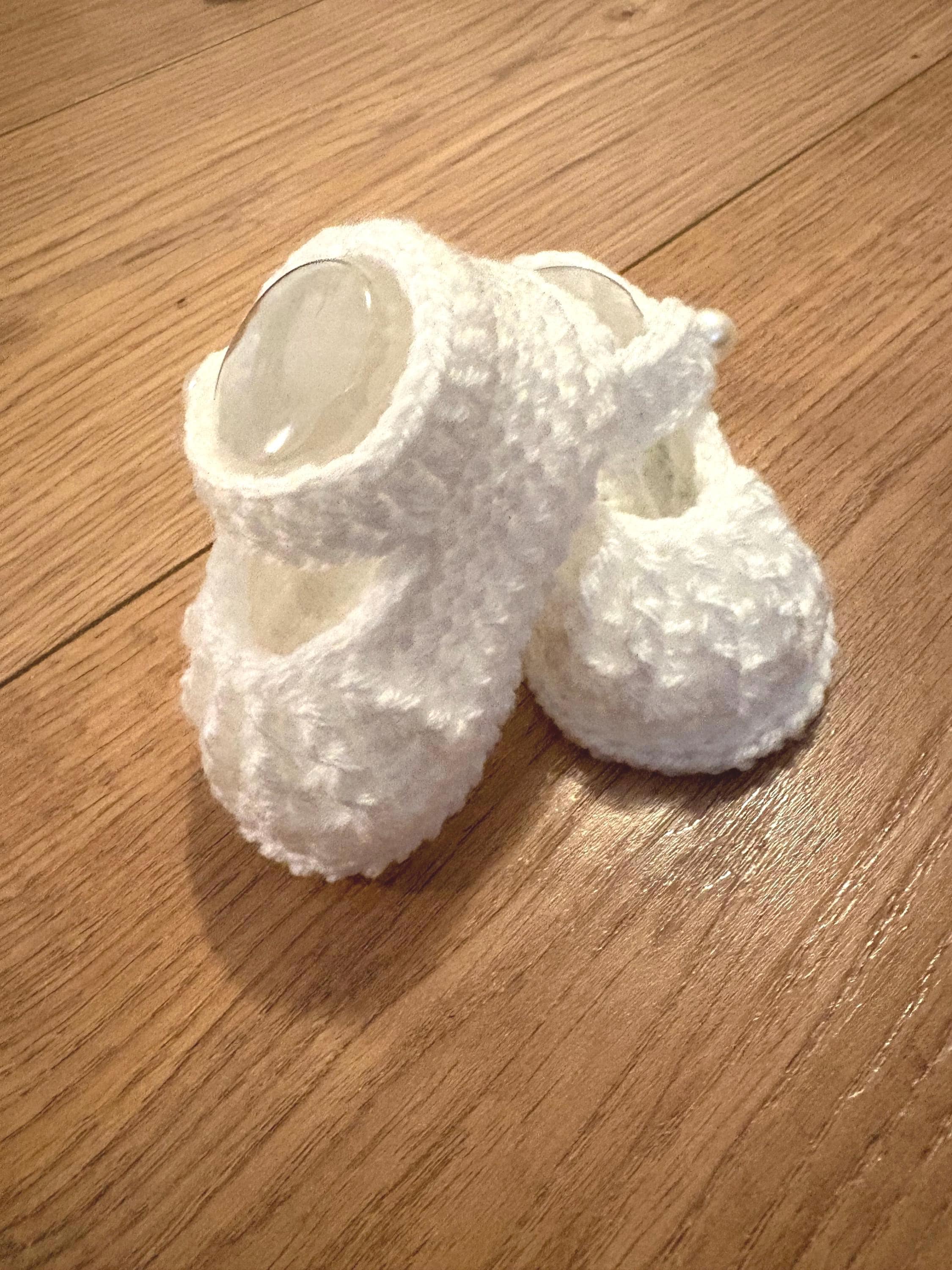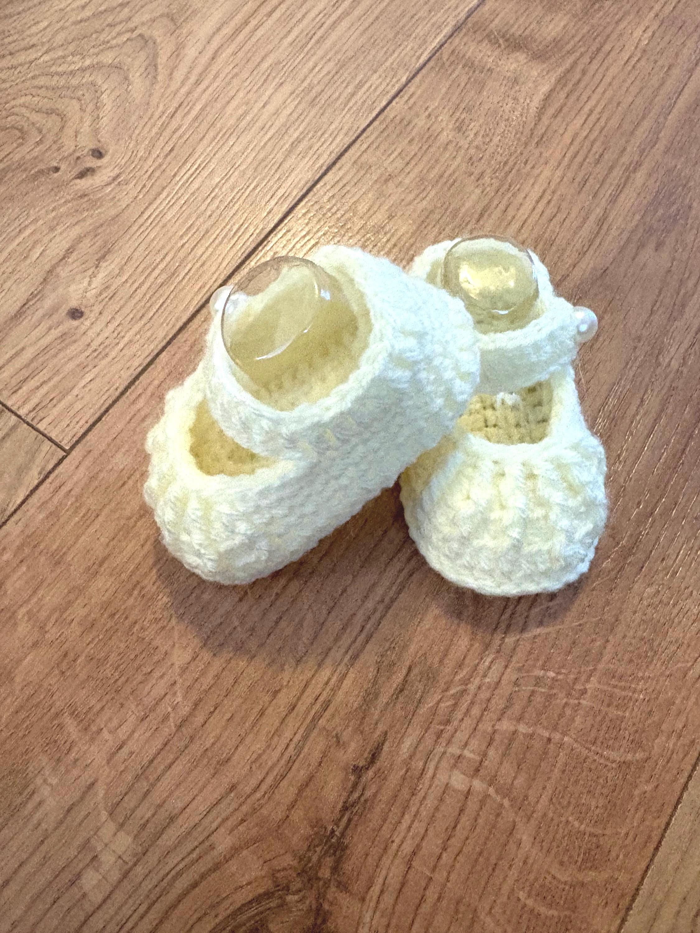 This set includes crochet baby shoes in a Mary Jane style with faux pearl fastenings and a matching headband with handmade crochet flower detail. Crafted using soft acrylic yarn with complementary inserts included for booties to maintain perfect shape after washing.