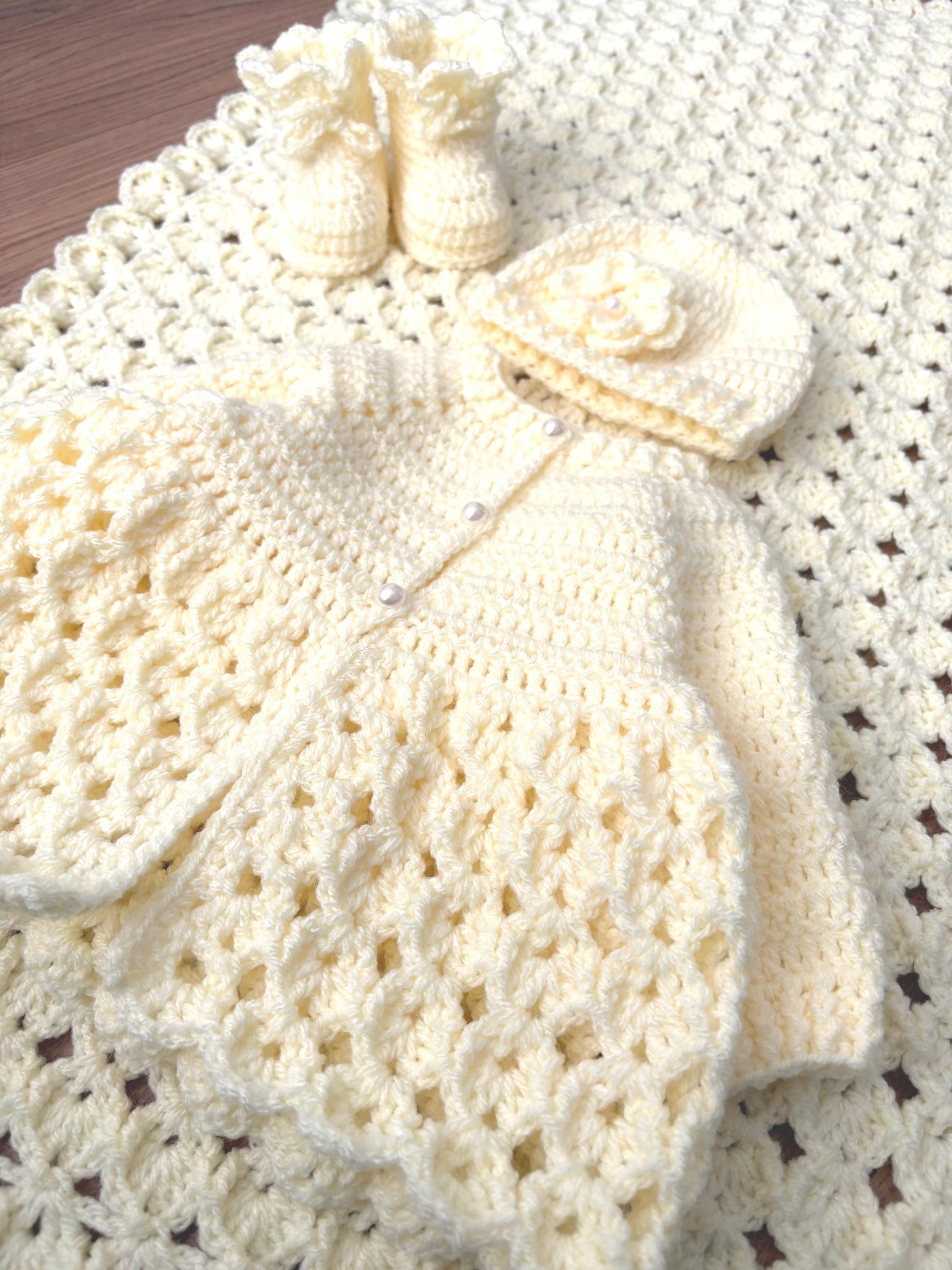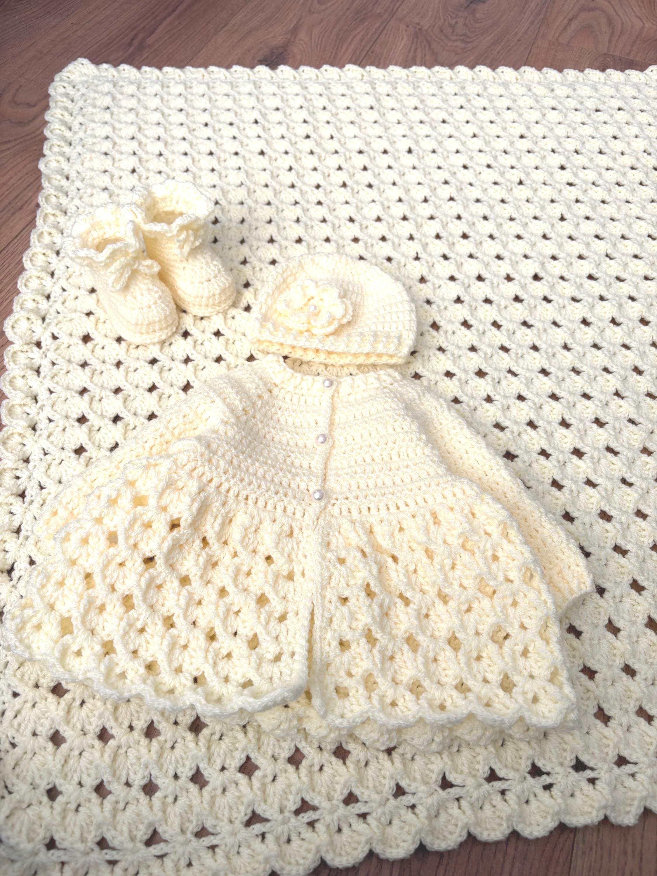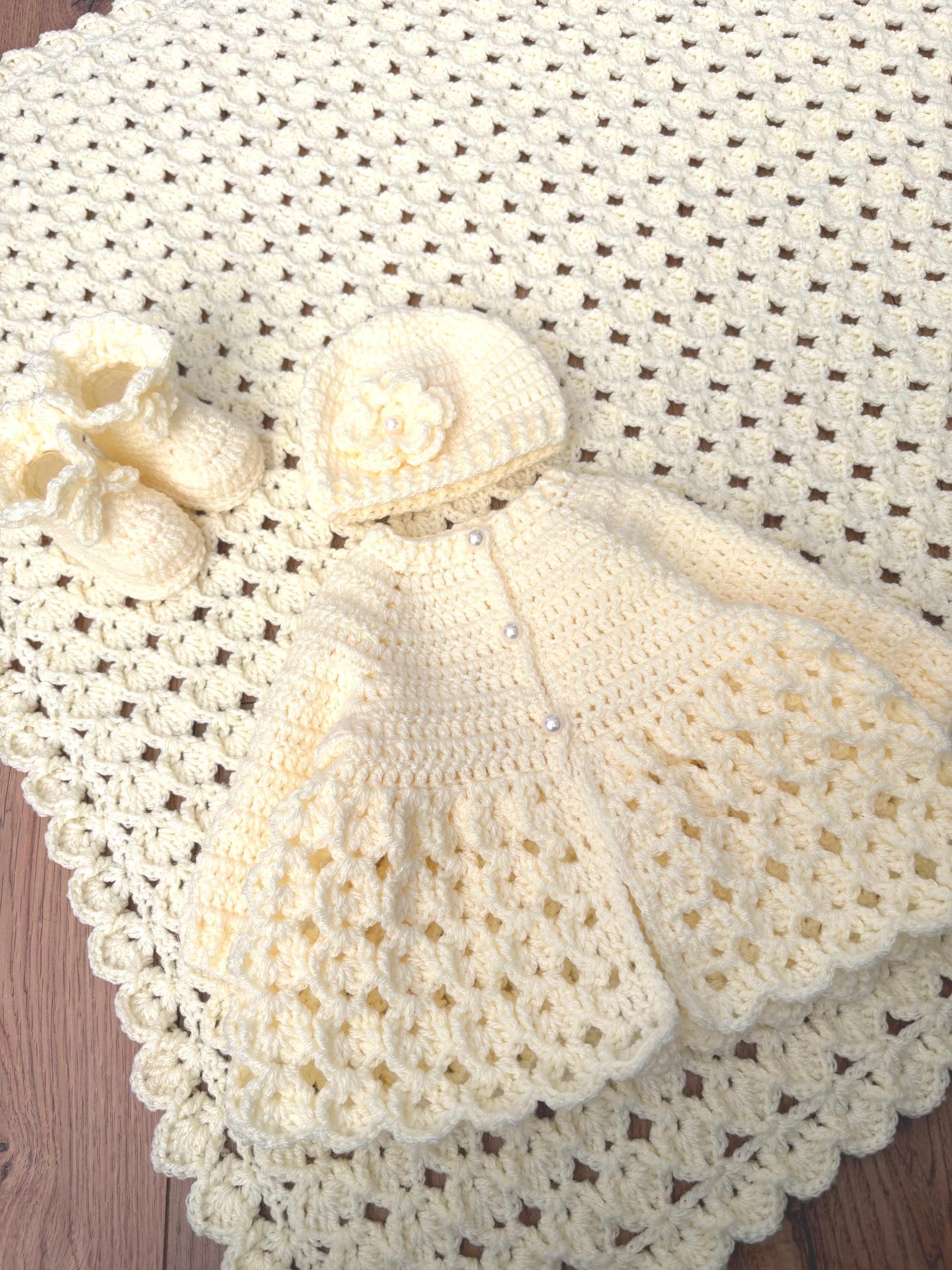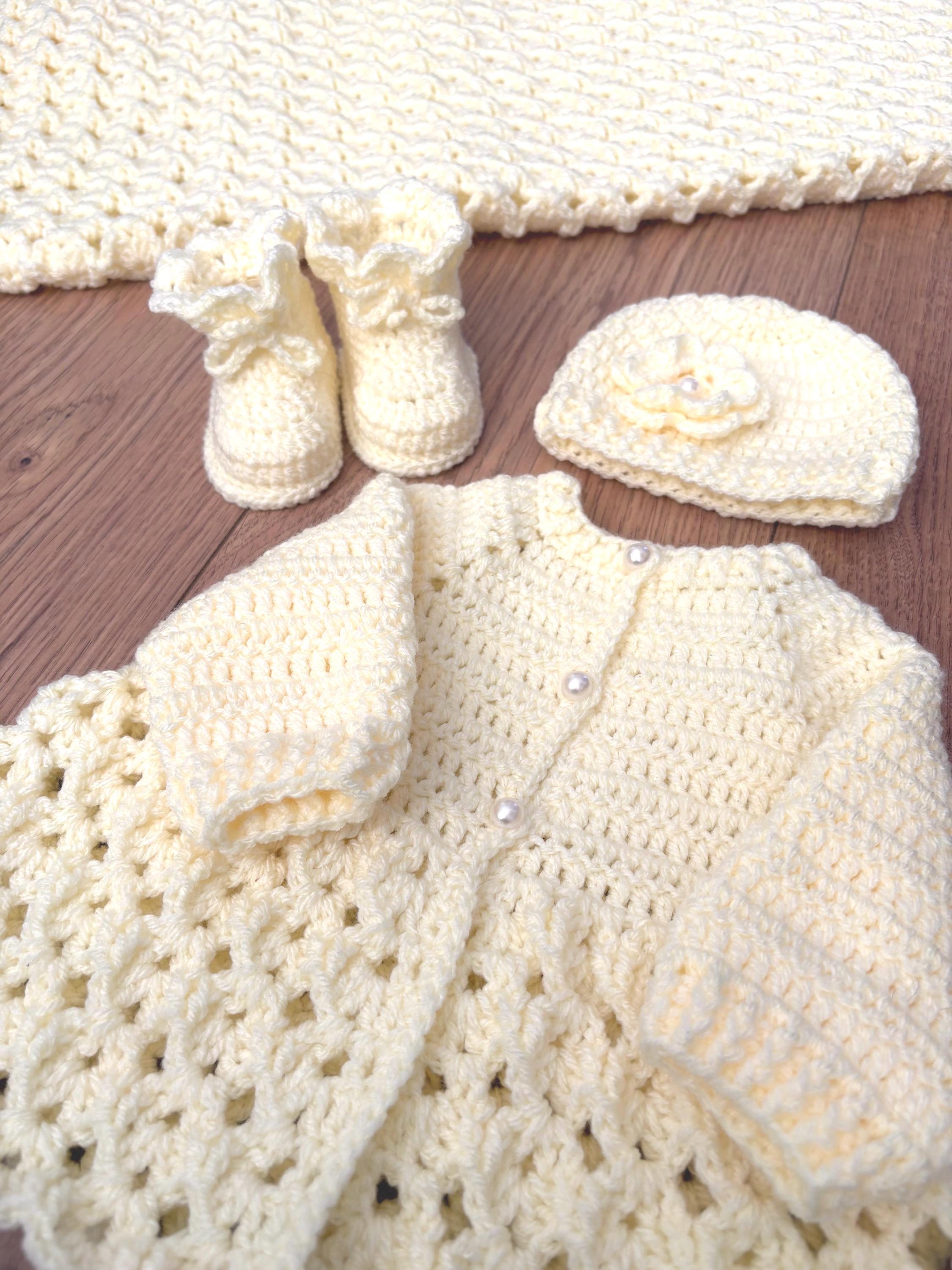 The set includes a beanie hat with handmade crochet flower, long length cardigan, booties with laces and a generous size versatile baby blanket 35x35 inches, perfect size for strollers, prams or just for a nap time anywhere!
