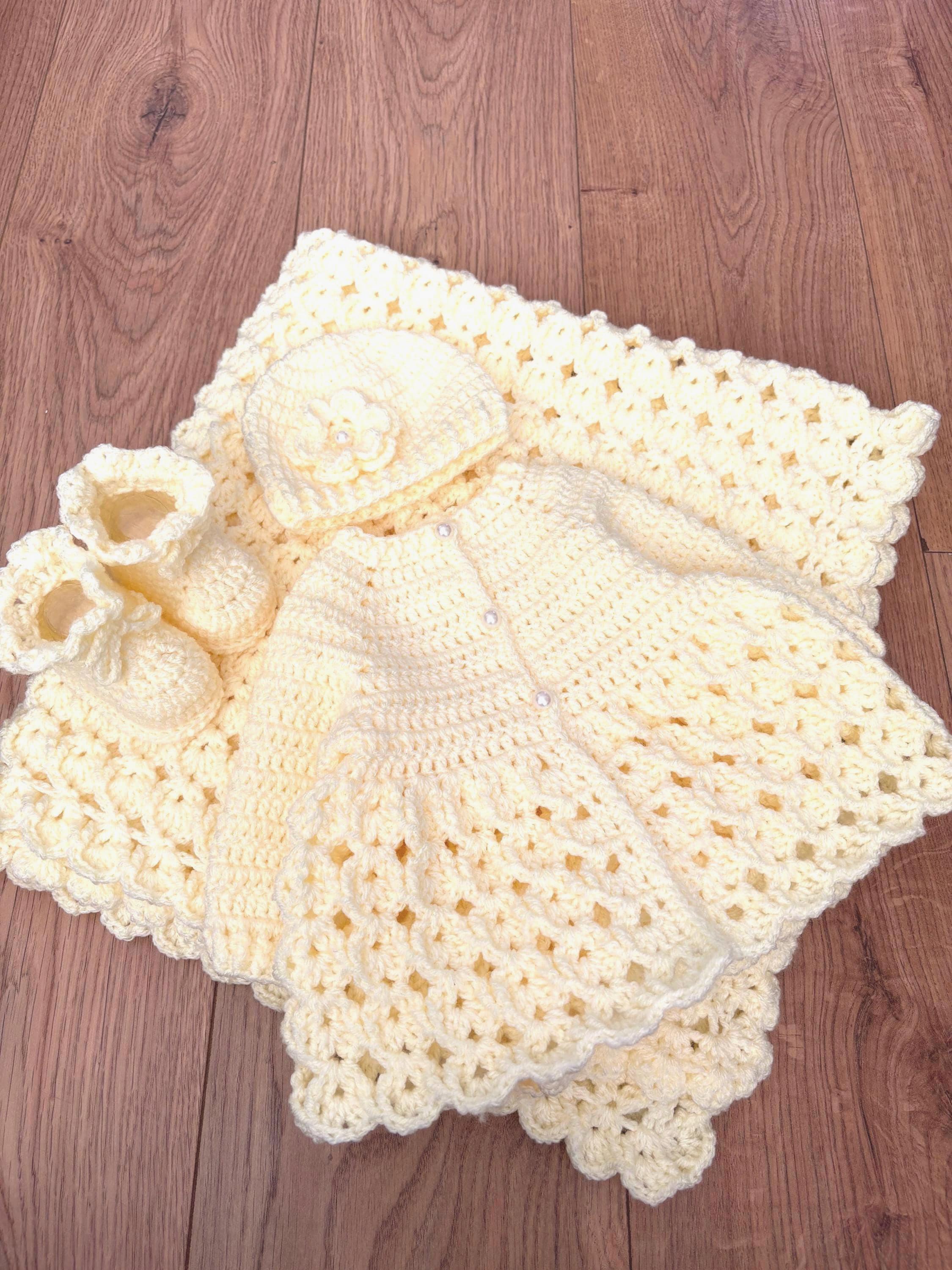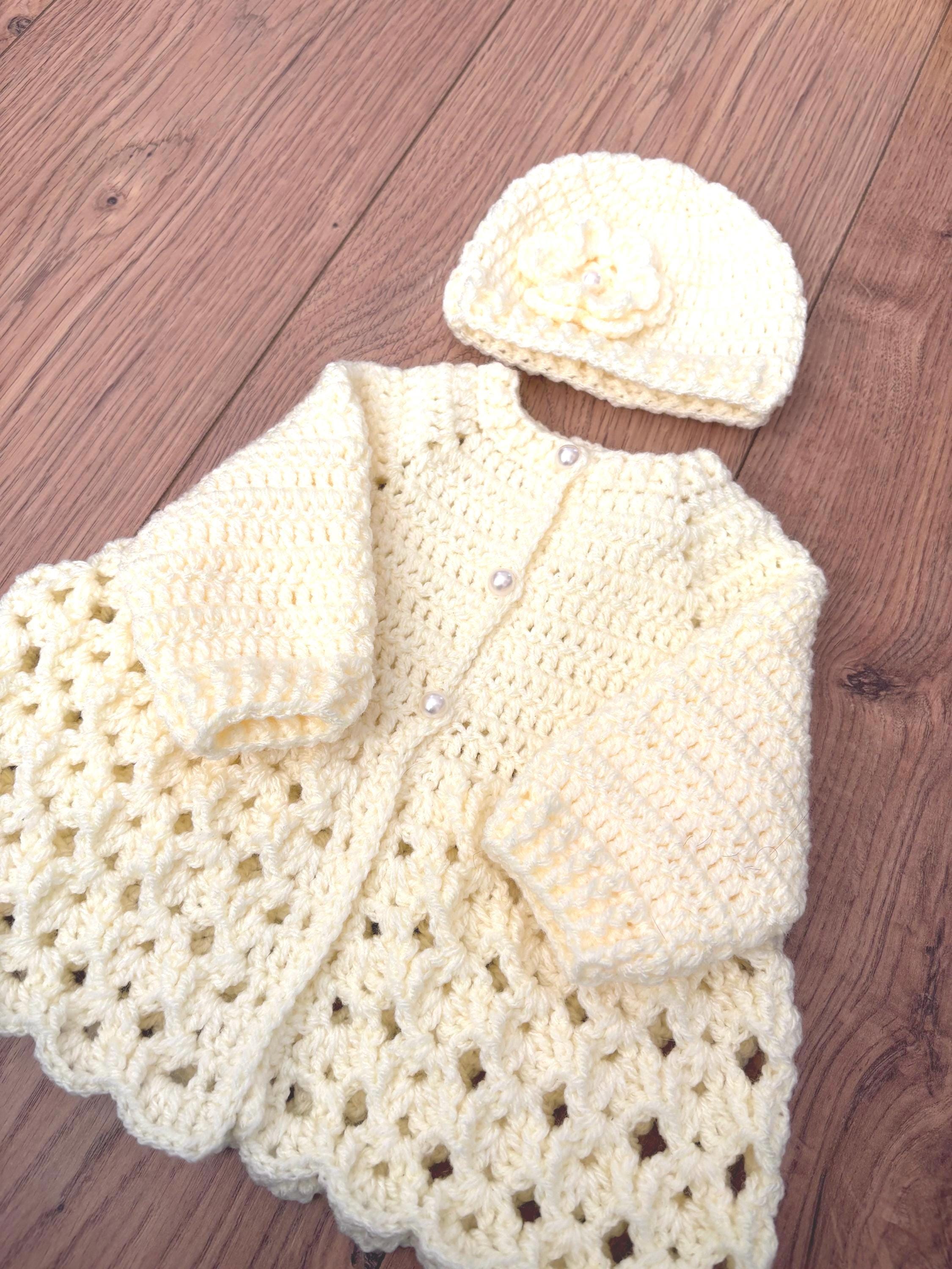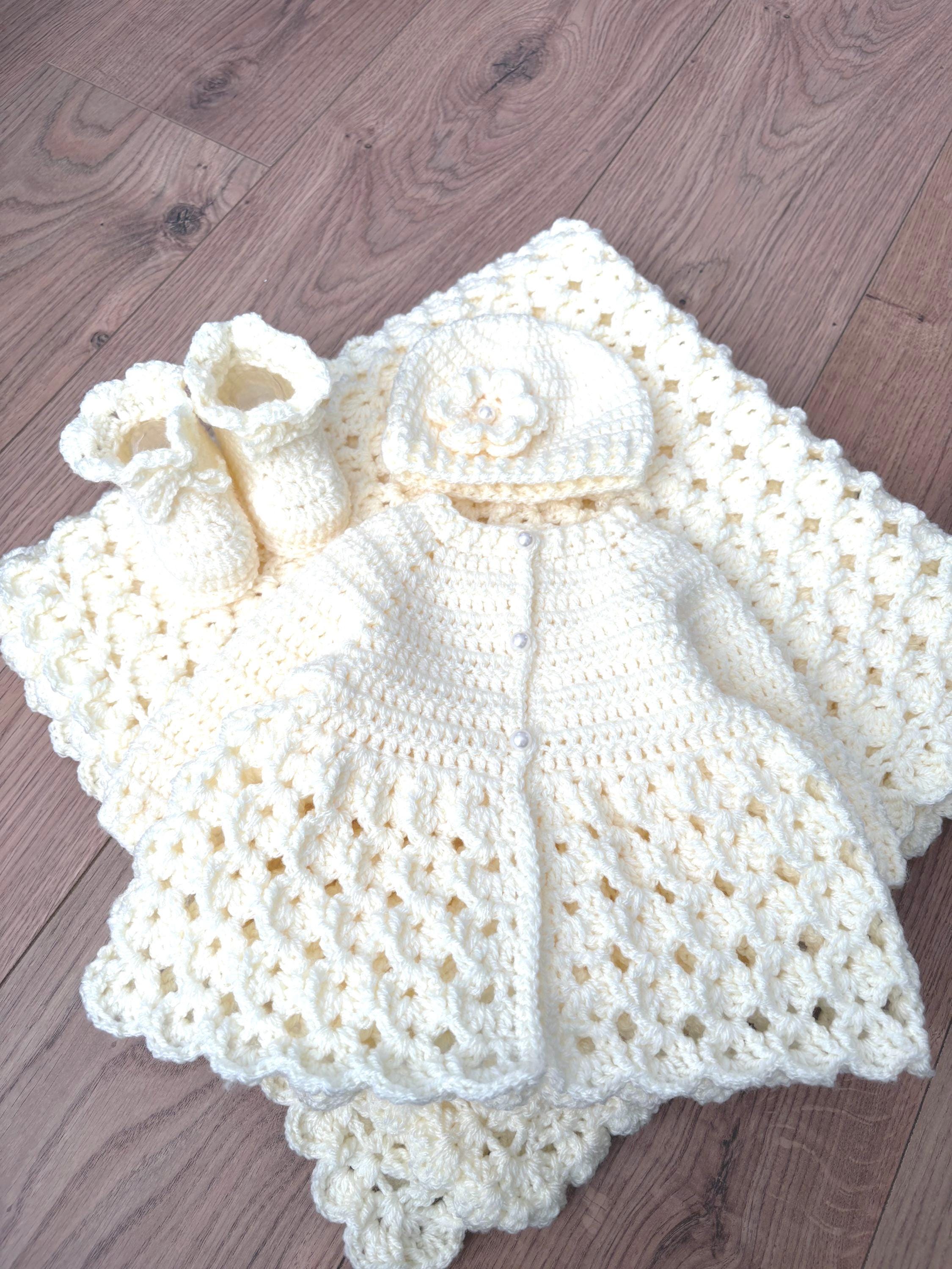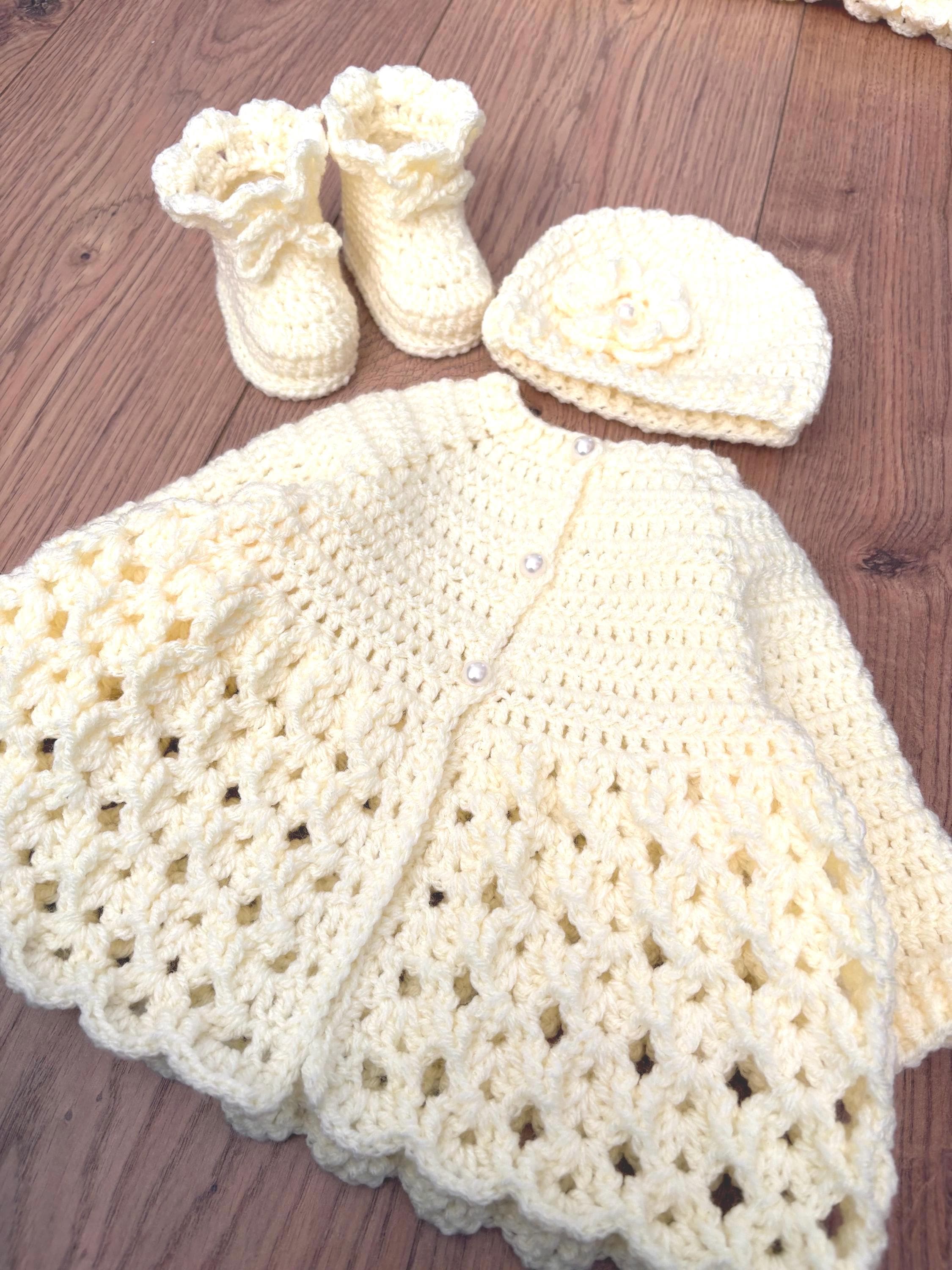 The set includes a beanie hat with handmade crochet flower, long length cardigan, booties with laces and a generous size versatile baby blanket 35x35 inches, perfect size for strollers, prams or just for a nap time anywhere!
