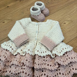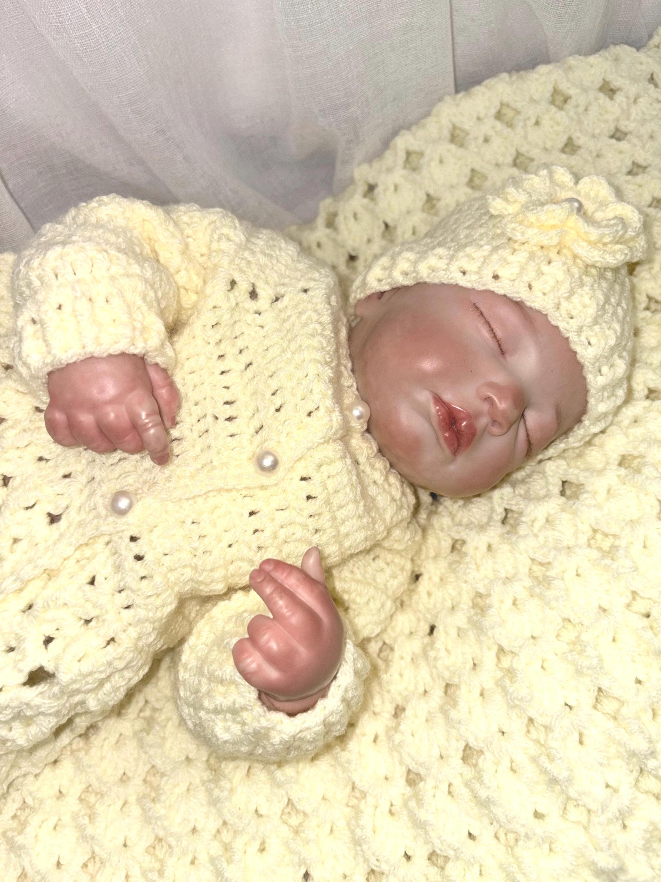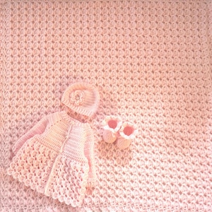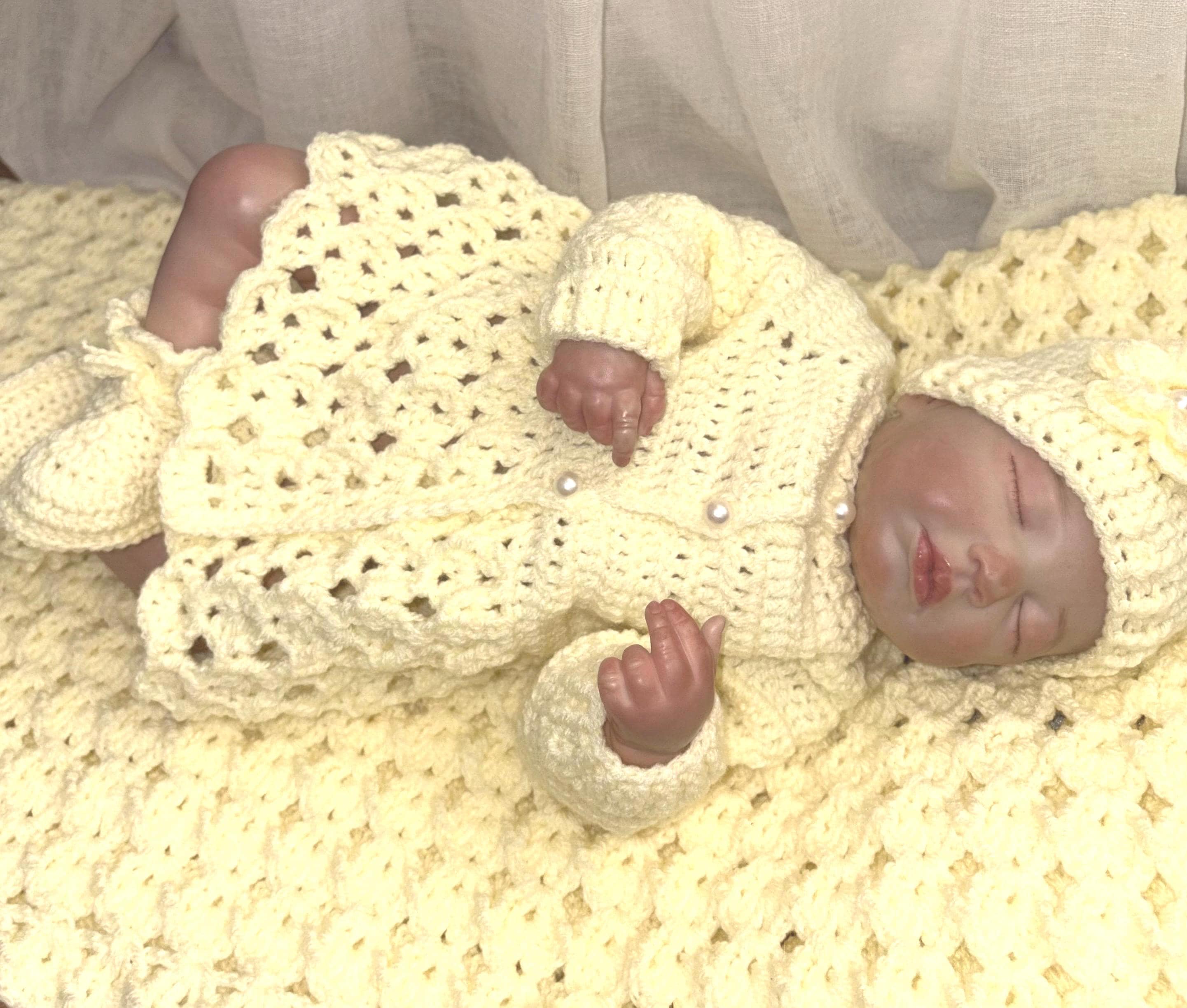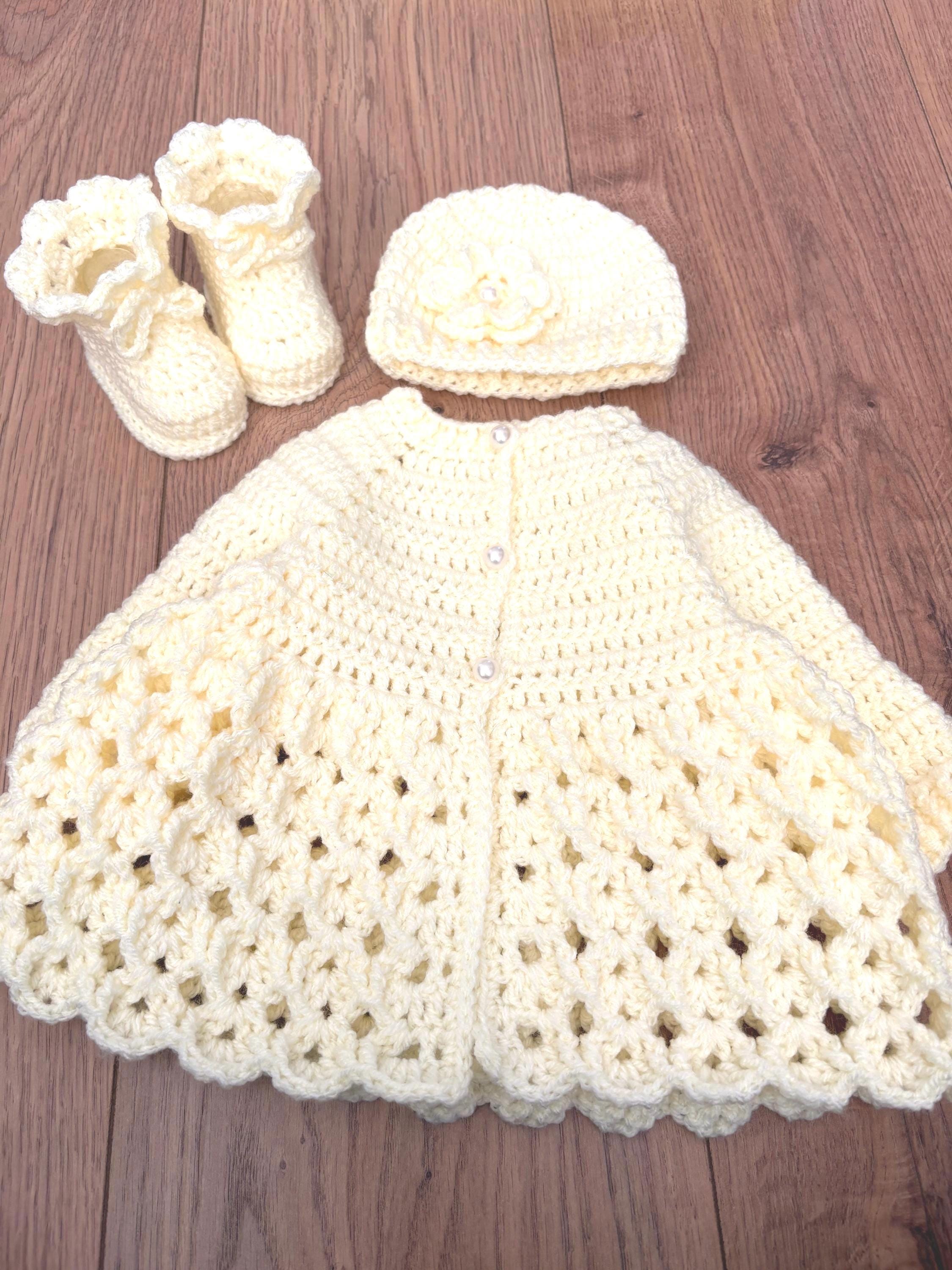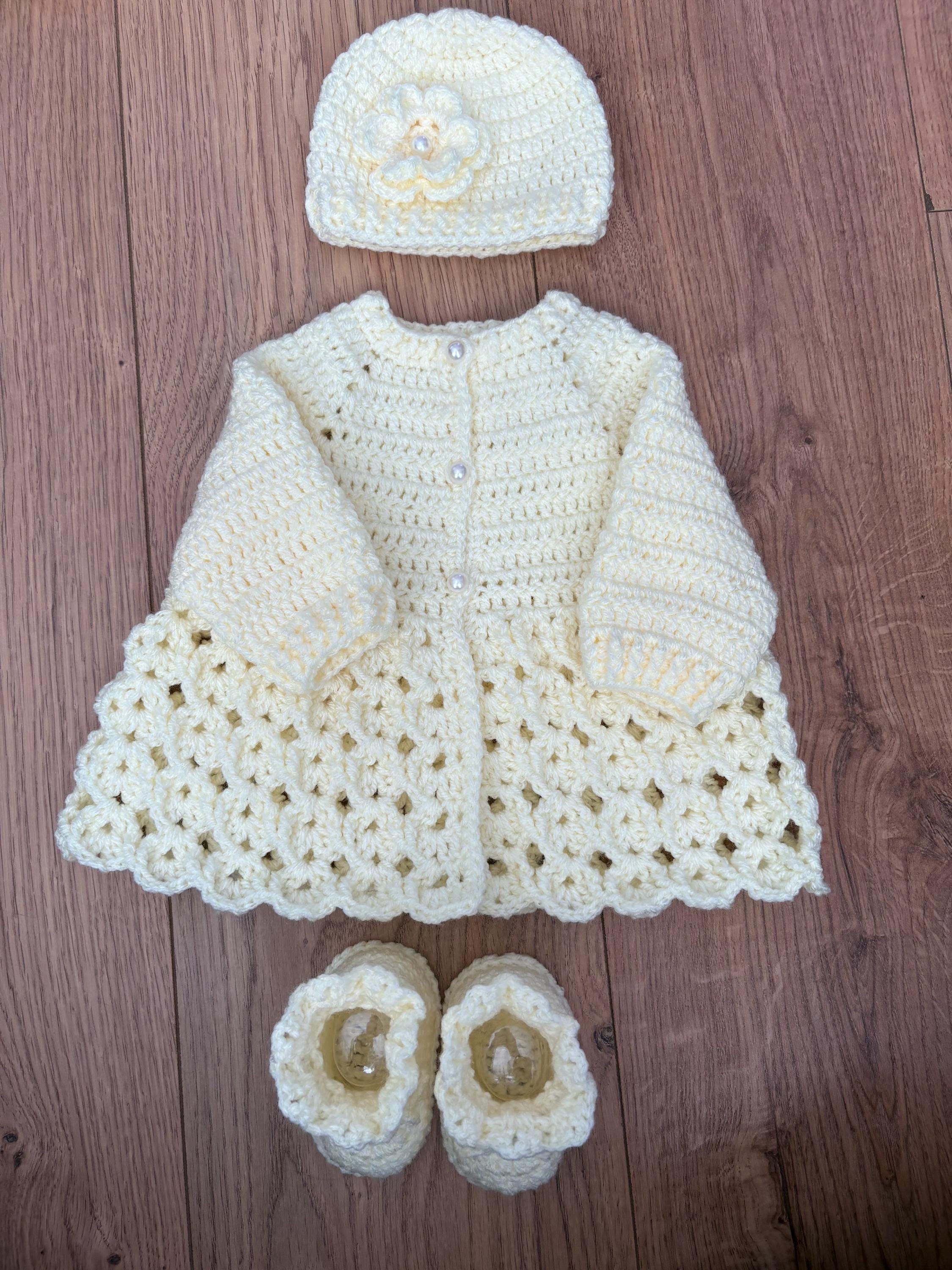 The set includes a beanie hat with handmade crochet flower, long length cardigan, booties with laces and a generous size versatile baby blanket 35x35 inches, perfect size for strollers, prams or just for a nap time anywhere!